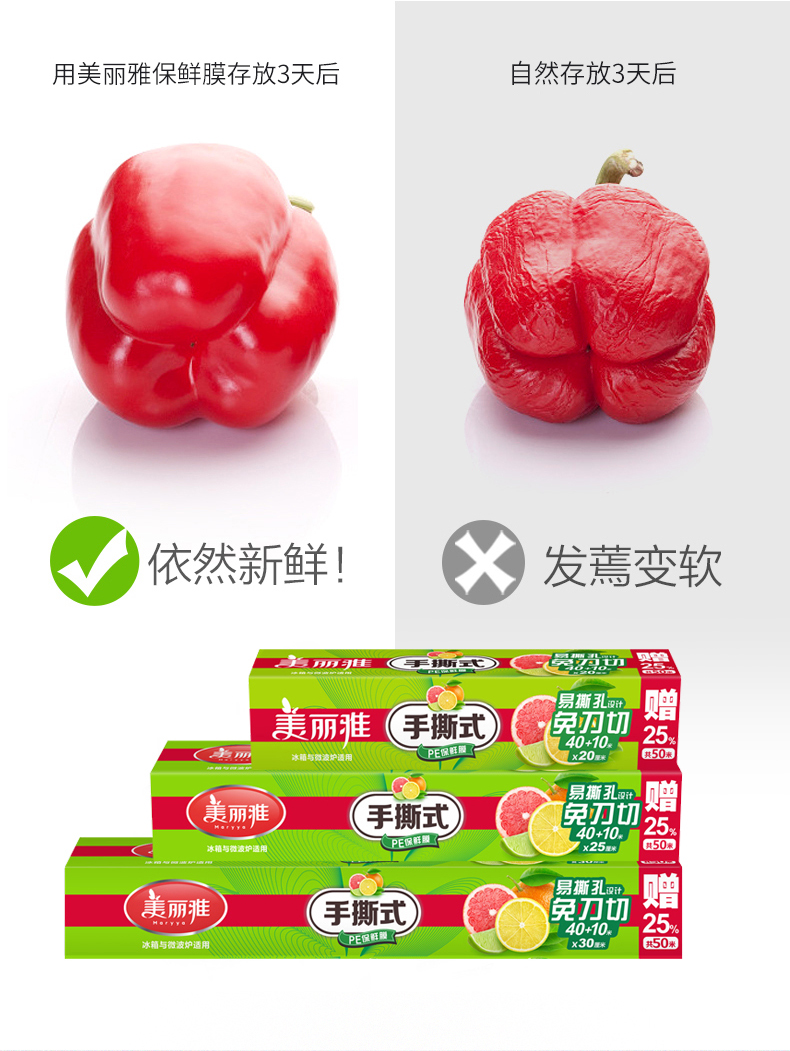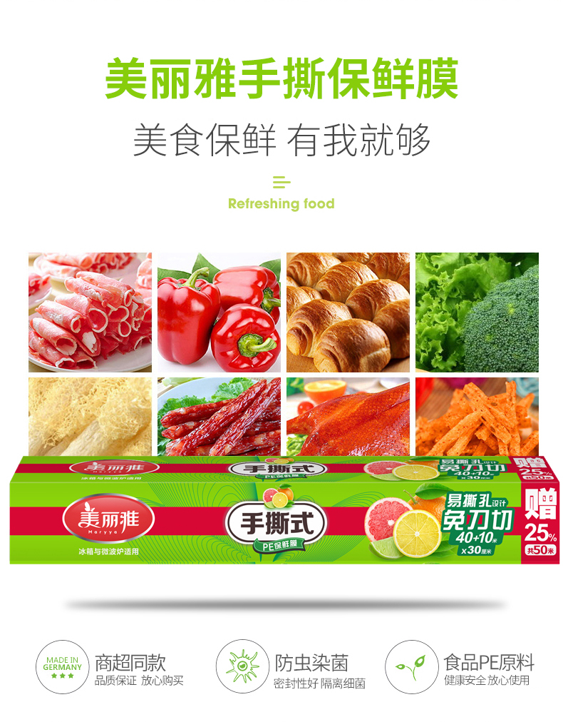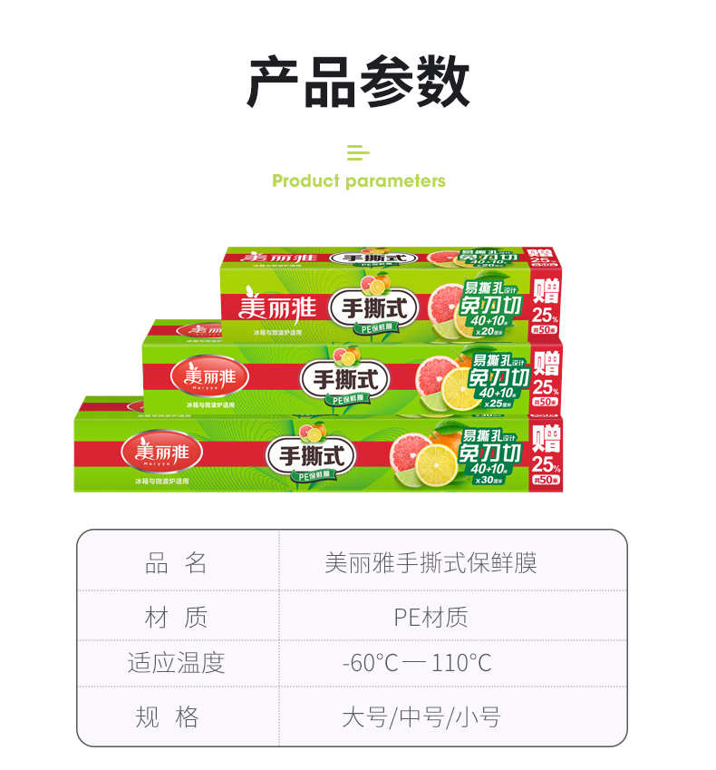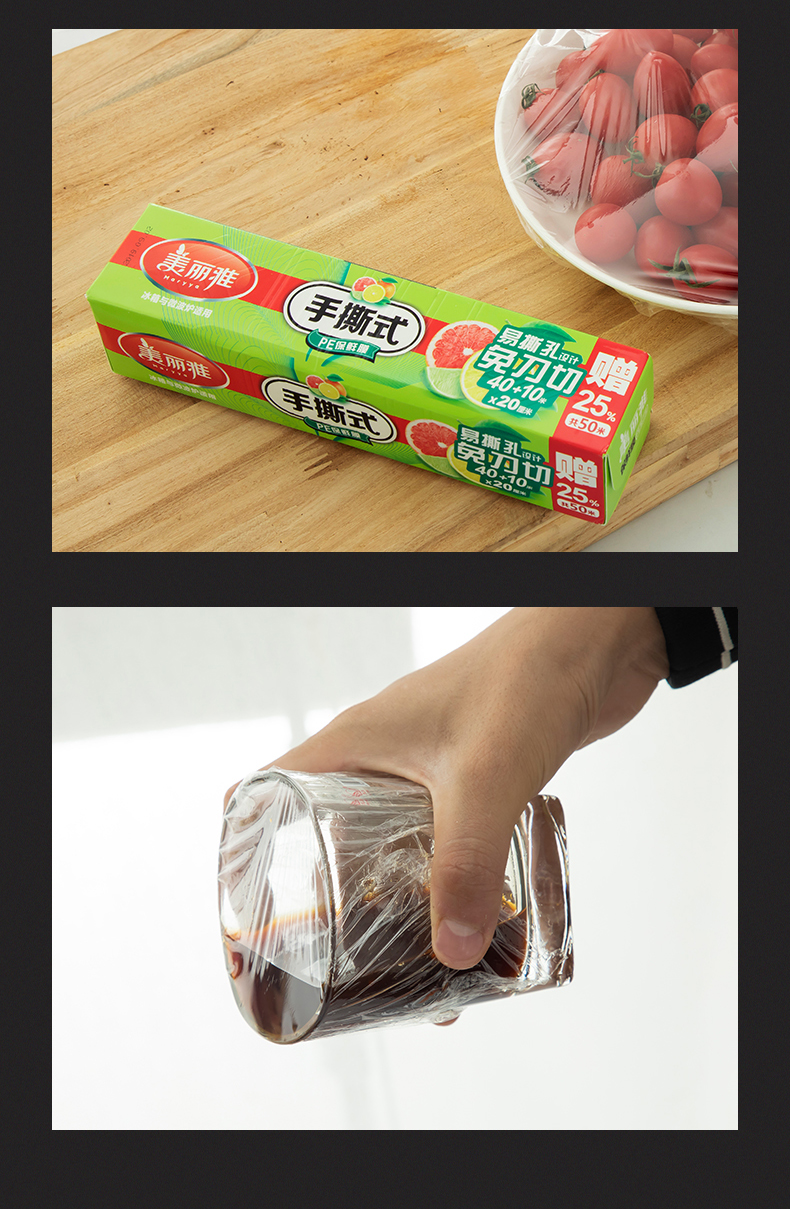 美丽雅家用多规格组合装保鲜膜,大型超市品牌,食品级PE材质,耐高温,好拉易撕,保湿保鲜,可微波加热,冰箱冷藏,使用方便,防止串味,居家必备安全健康。