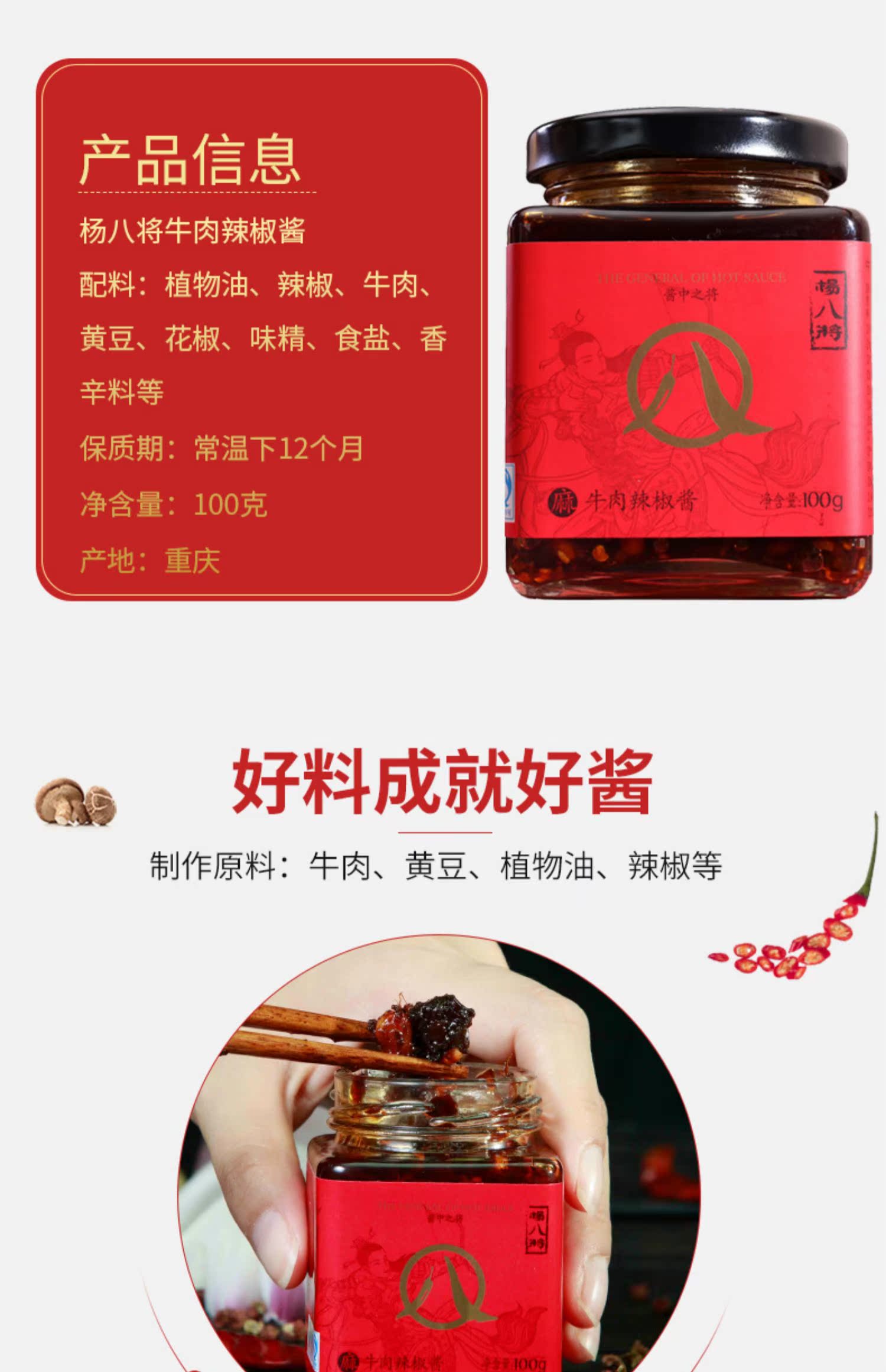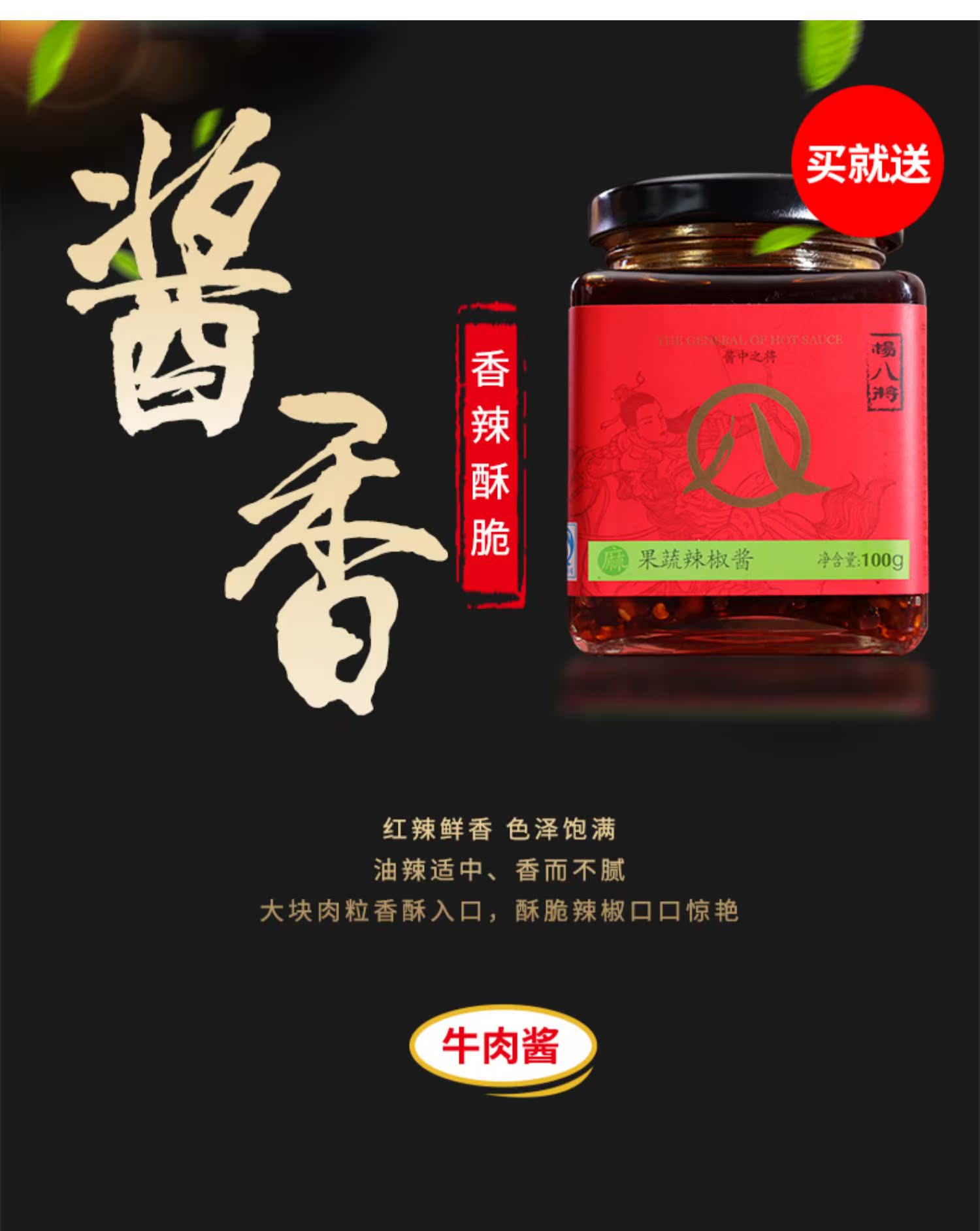 买一送易,牛肉辣椒酱送一瓶果蔬酱,只需9.9元!红辣鲜香,色泽饱满,油辣适中,香而不腻,大块肉里香酥入口,酥脆辣椒扣扣惊艳,佐餐拌饭,无防腐剂,真材实料!百年传承配方值得信赖