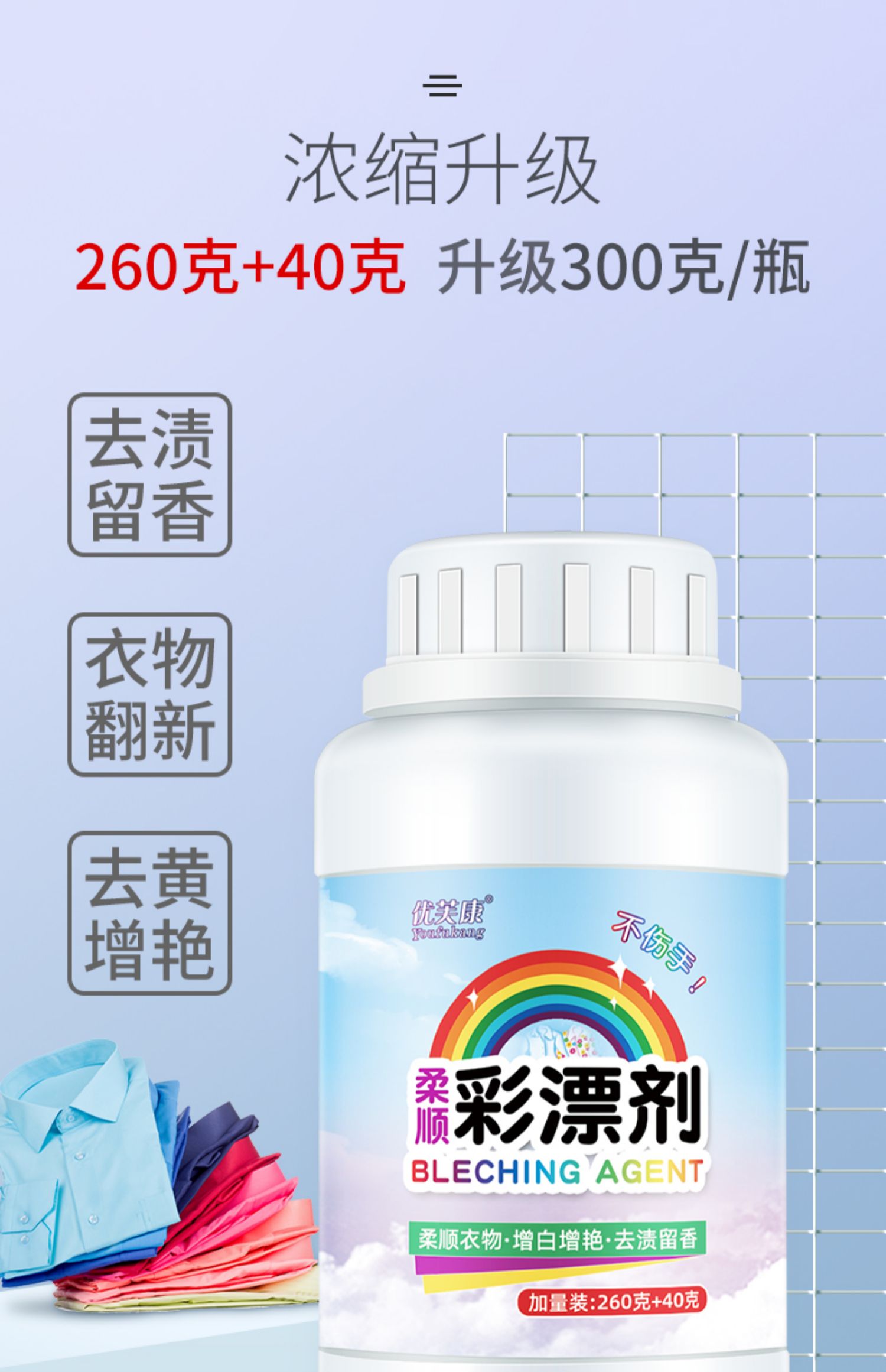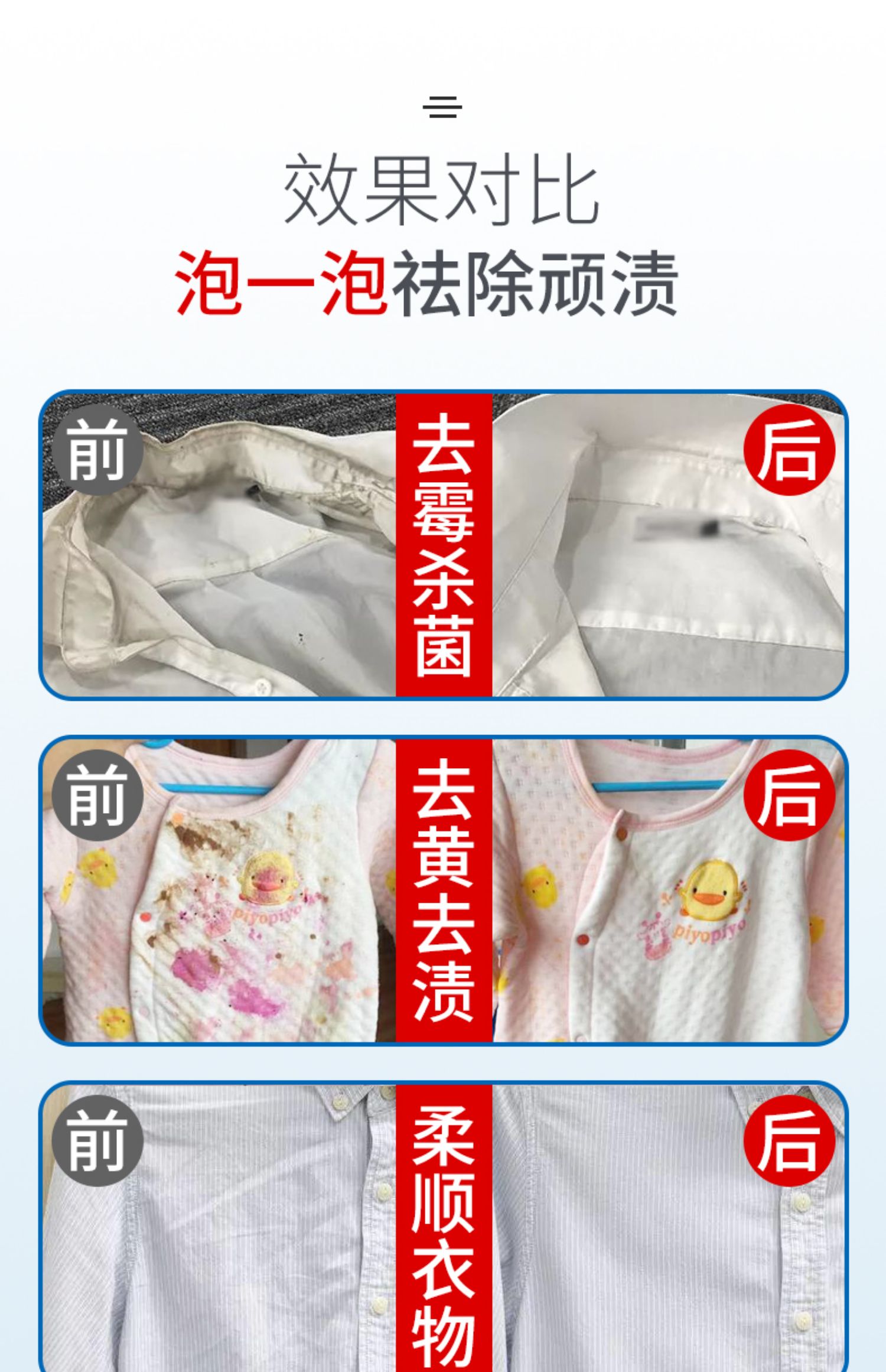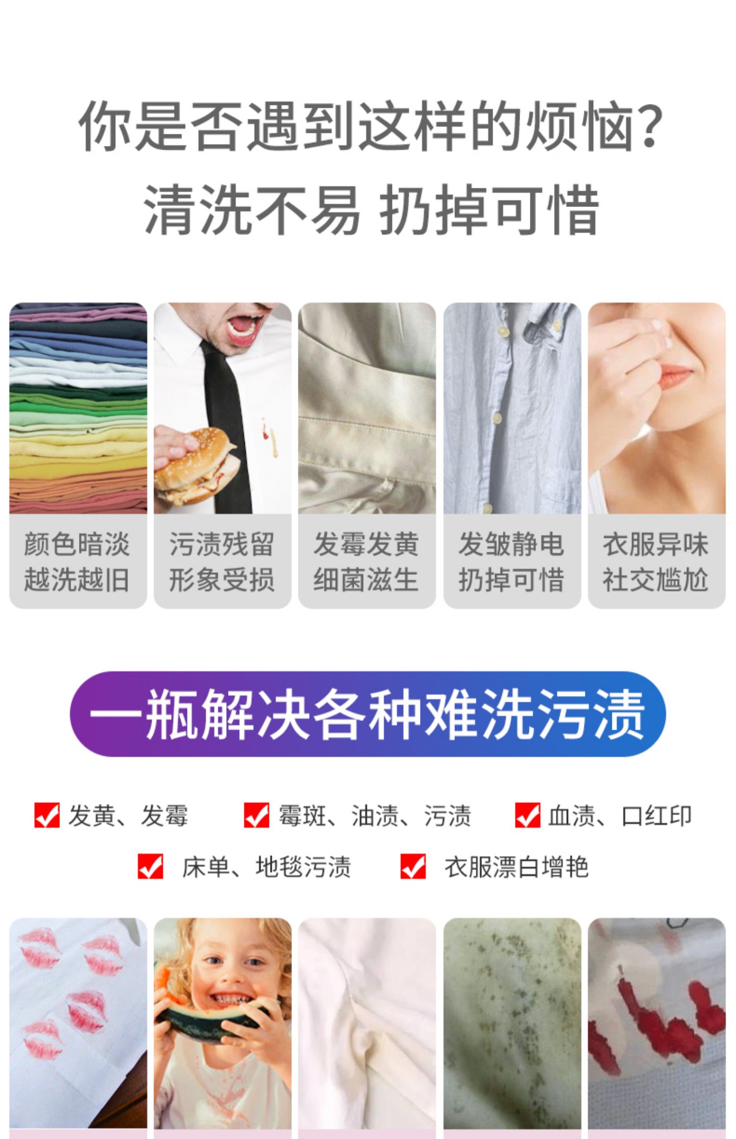 加量不加价,一瓶300g,我的天呐!孩子一没看住,衣服上的油渍,果酱渍全沾上了!安全清新不伤手,不伤衣!轻松去黄去渍,让白色衣服更白亮,彩色衣服更护色!