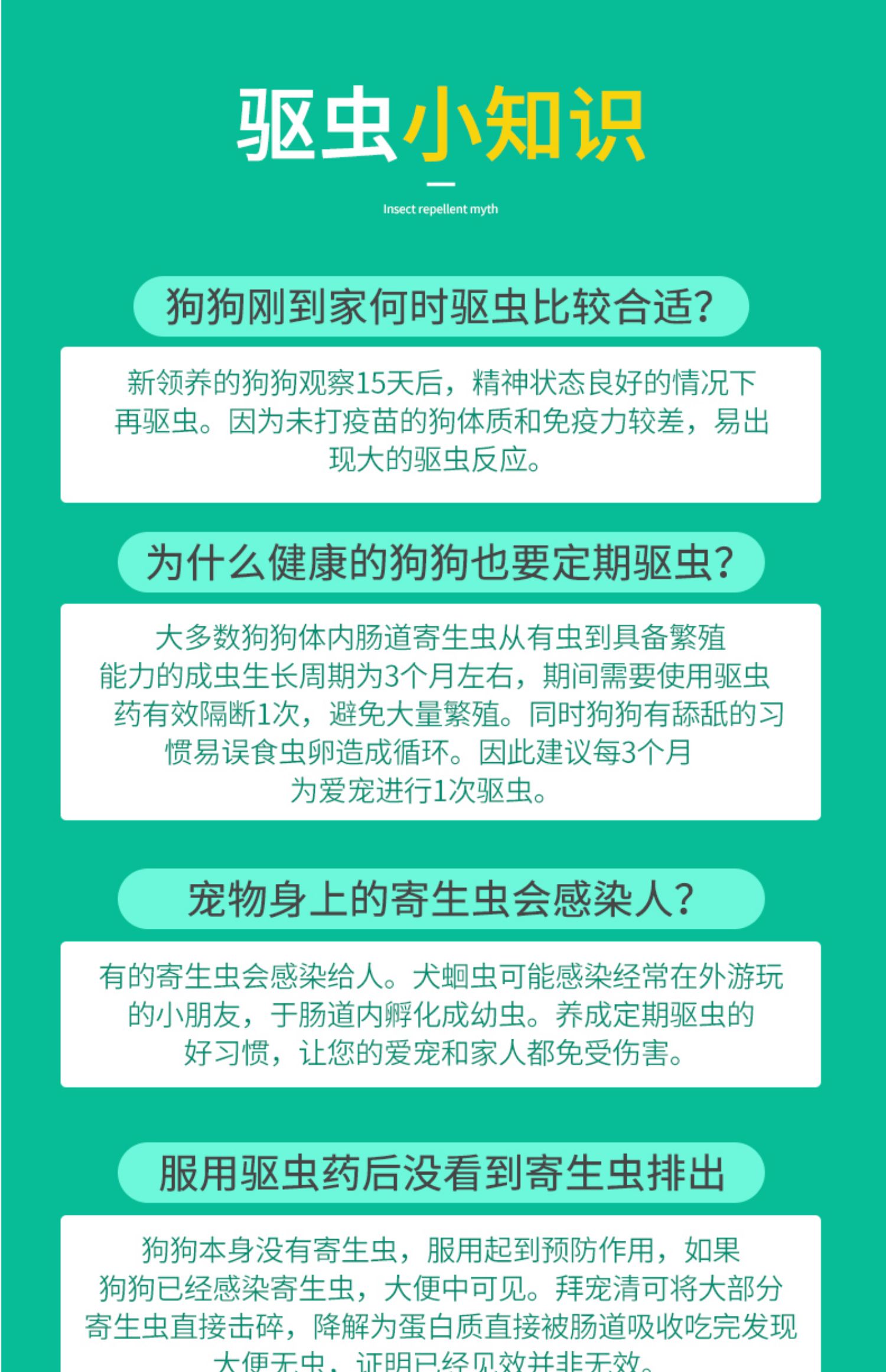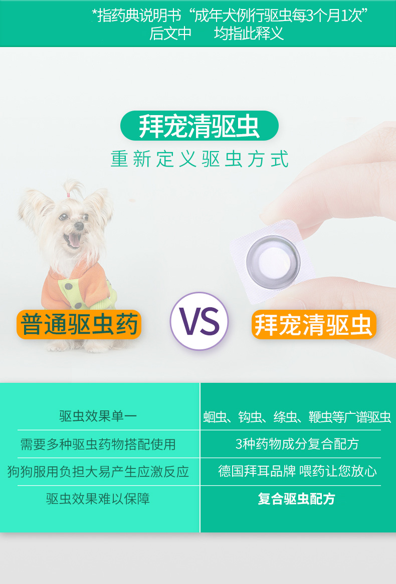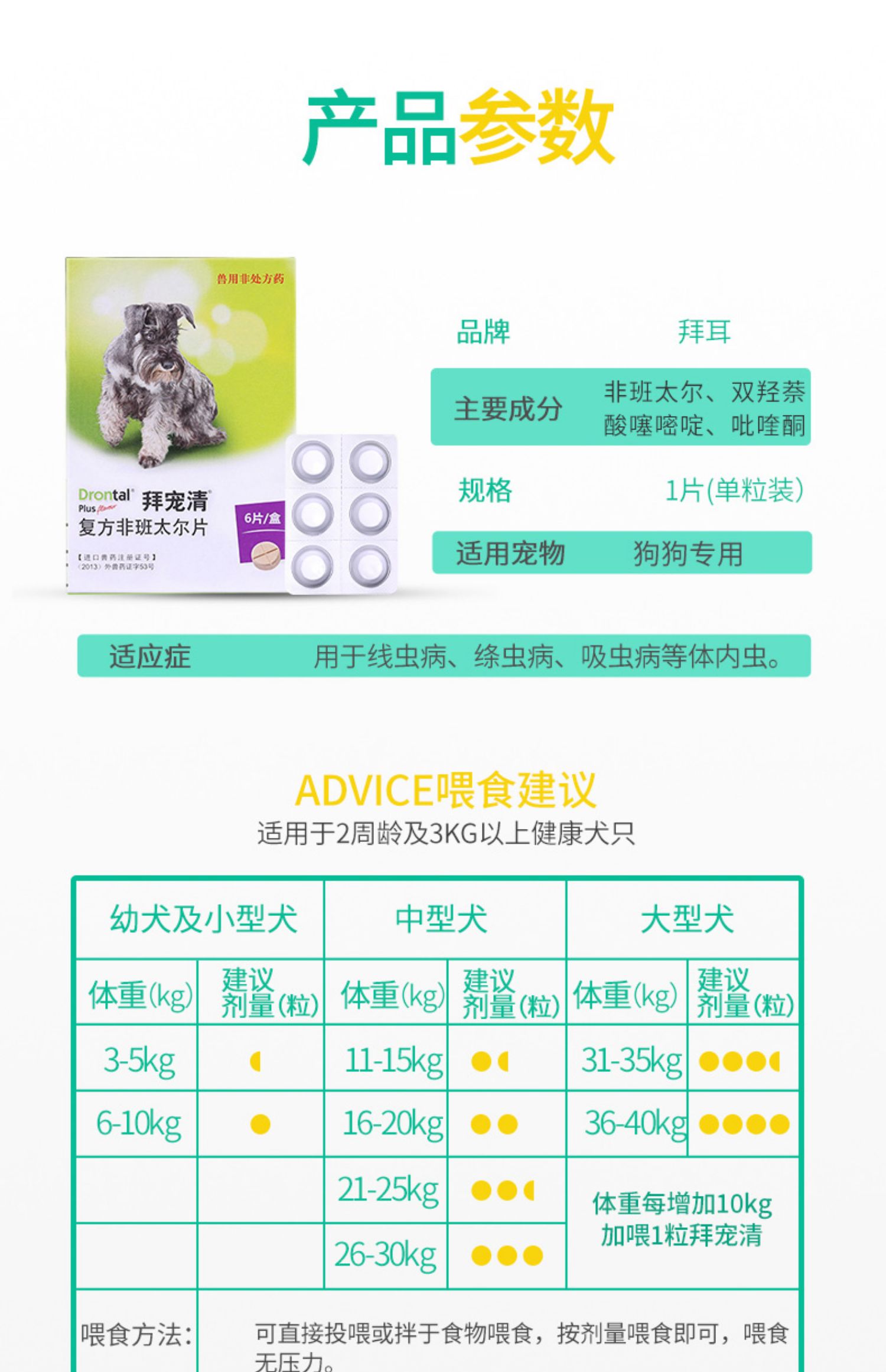 德国拜耳,医师推荐,原装进口适口性好,轻松驱虫,萌宠更活泼、汪星人喜欢~~长效呵护,可驱除8种以上处于任何阶段的绦虫、蛔虫和蠕虫等肠道体内寄生虫,专利配方安全高效