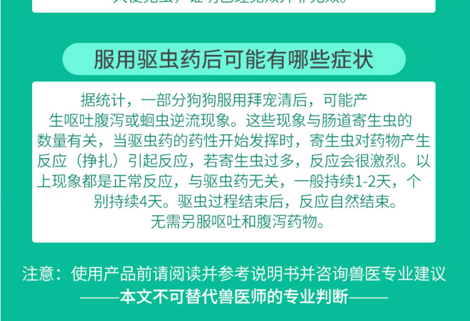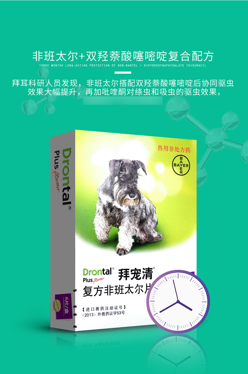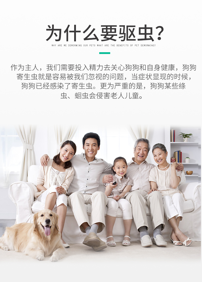 德国拜耳,医师推荐,原装进口适口性好,轻松驱虫,萌宠更活泼、汪星人喜欢~~长效呵护,可驱除8种以上处于任何阶段的绦虫、蛔虫和蠕虫等肠道体内寄生虫,专利配方安全高效