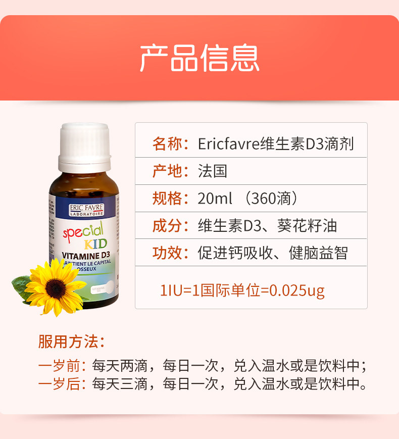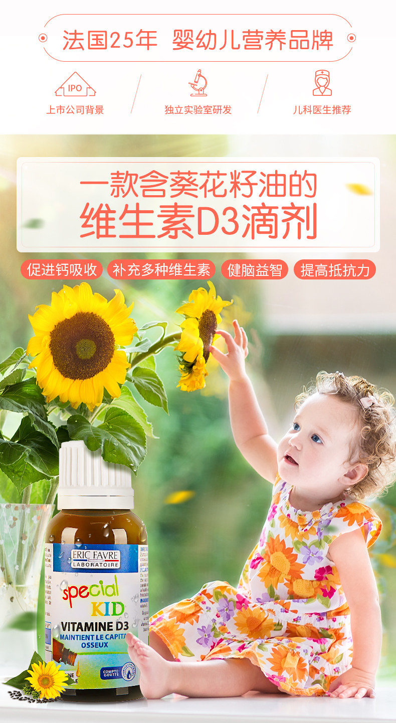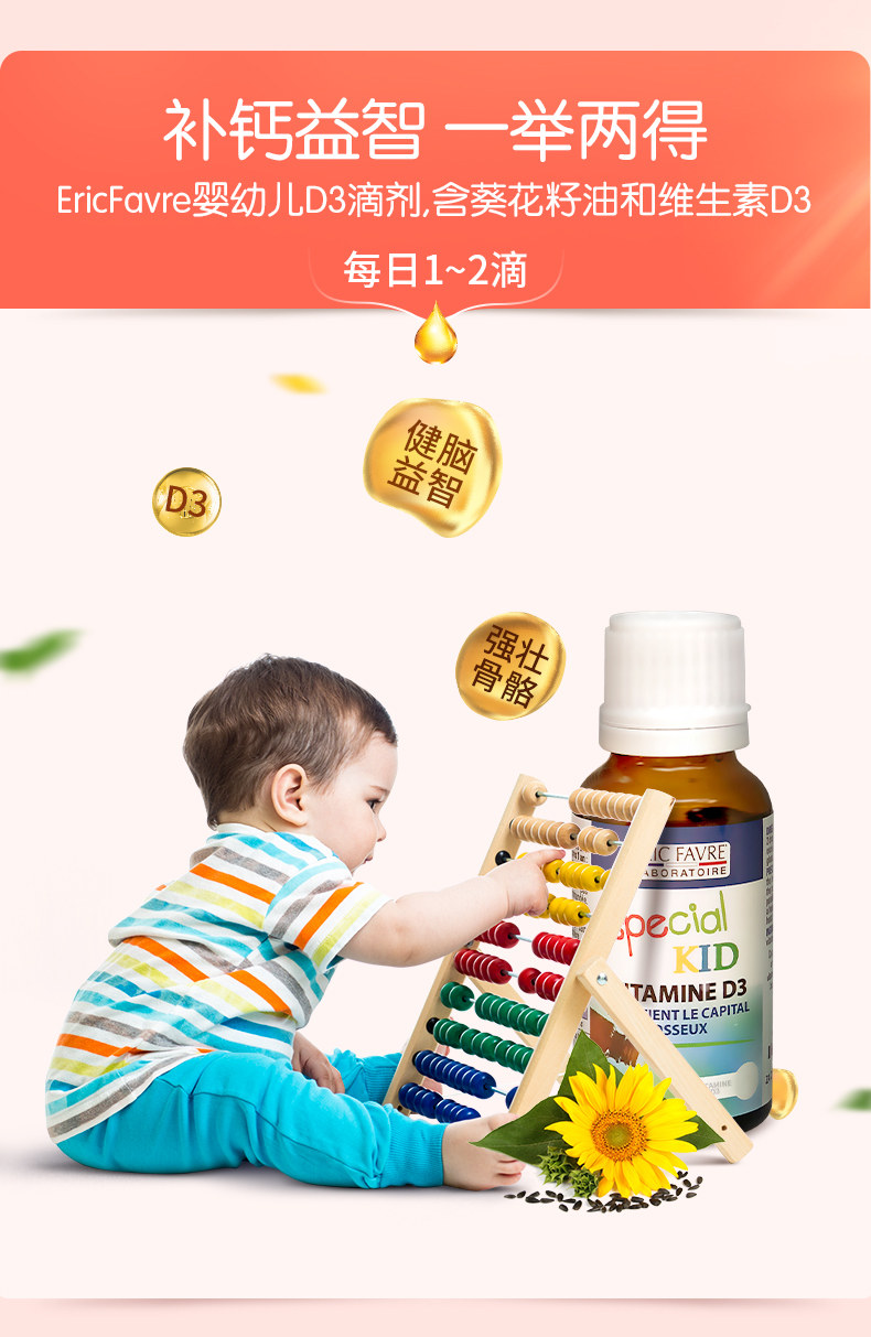 限时买五免一,法国艾瑞可,维生素d3滴剂,健脑益智,一举两得,促进钙吸收,平衡血浆钙,预防肋骨外翻,帮助大脑发育,妈妈放心好选择~~