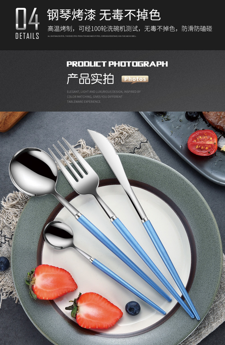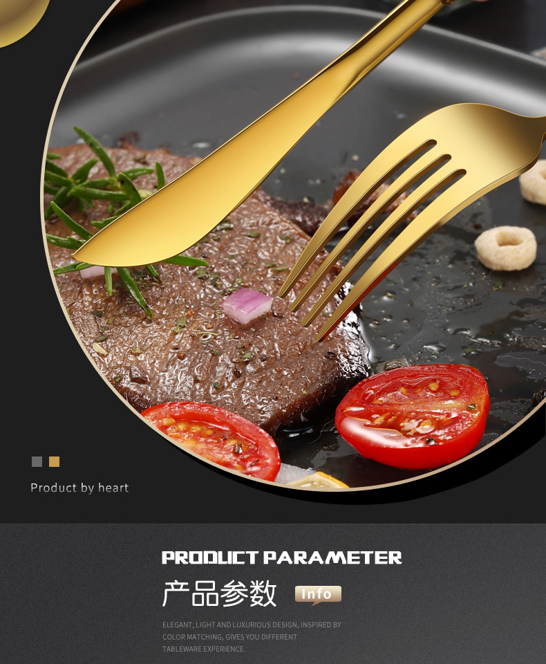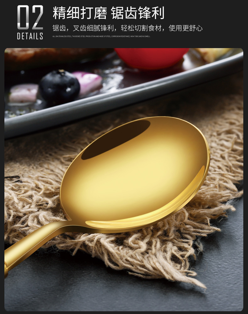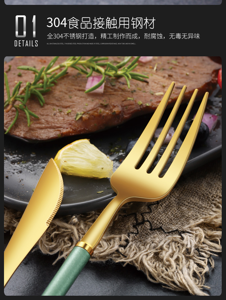 加厚304不锈钢,一体成型,镜面抛光,圆润打磨,手感舒适,切割省力,耐腐蚀,抗氧化,易清洗,有质感的牛排刀叉套装!