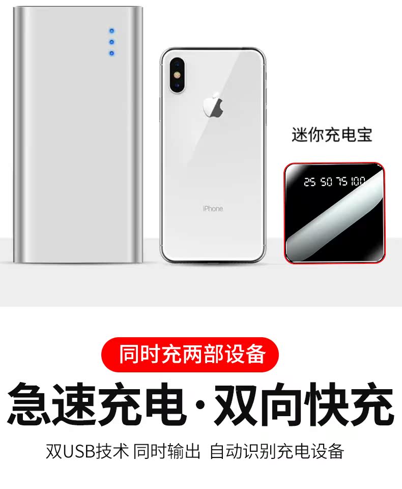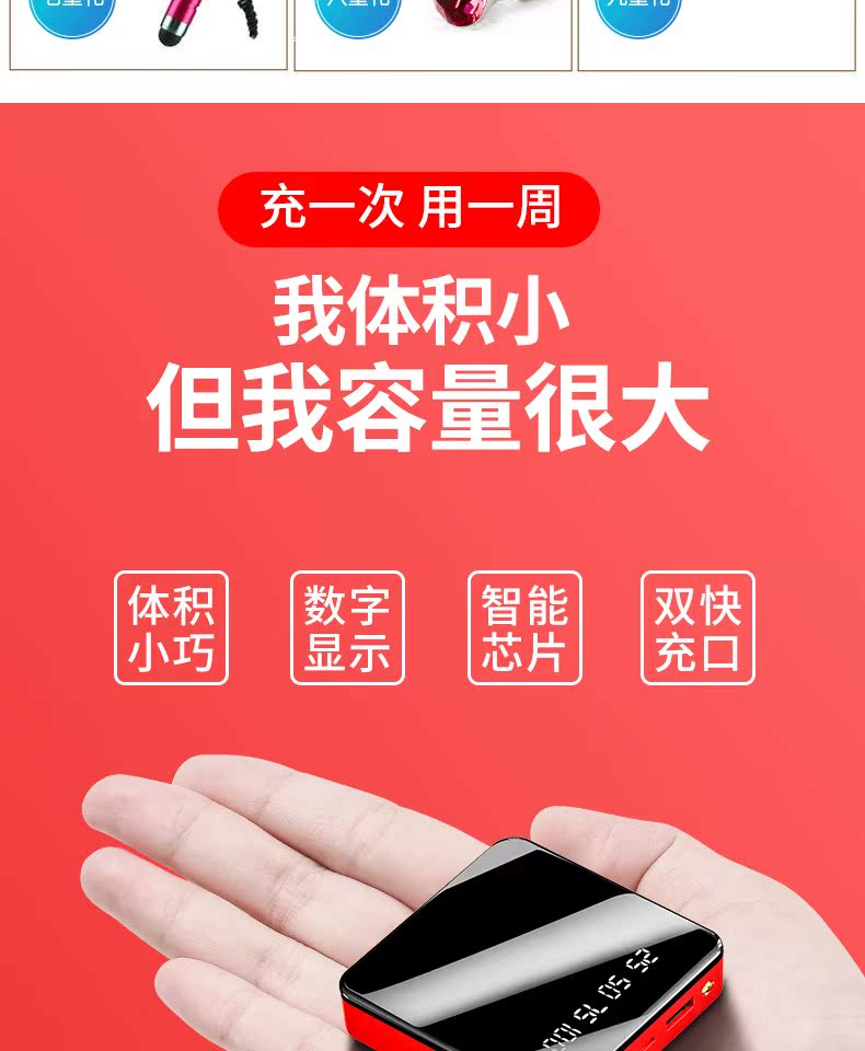 迷你充电器,体积小,容量大,急速充电,自带LED照明,高清镜面数显,七天超长待机续航双向快充不发热,充满时自动切换涓流充电,拒绝虚电,可携带上飞机,赠运费险~
