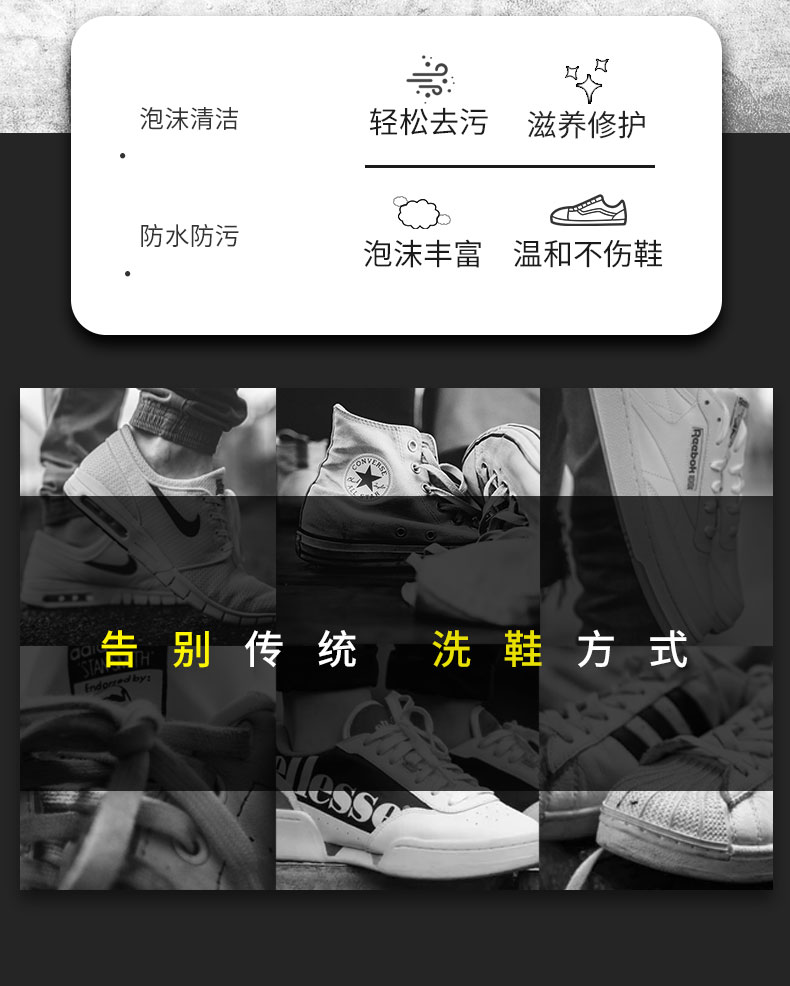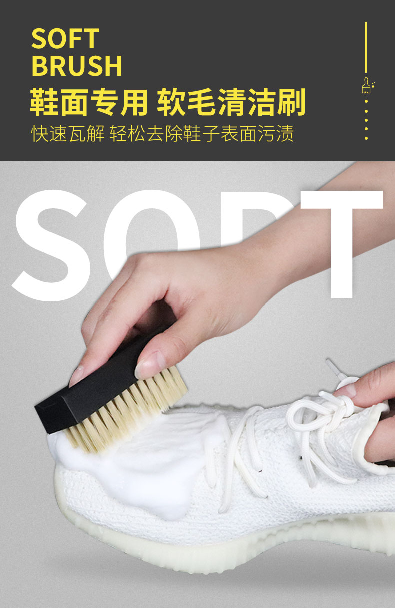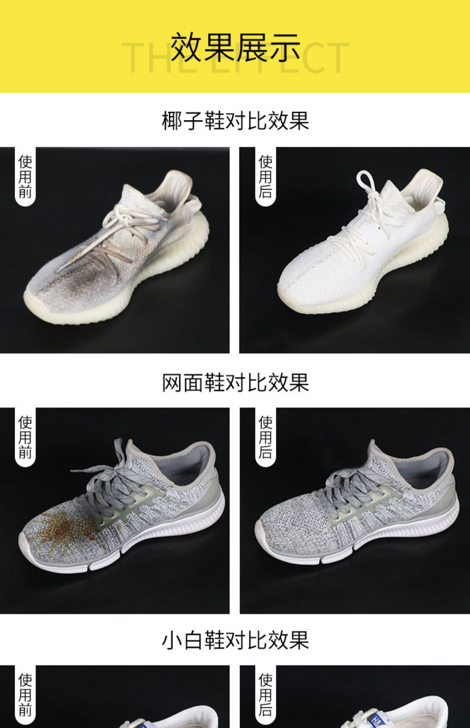 全新升级纳米活性环保配方,自带刷头使用方便,高效去污,泡沫细腻,一擦就干净,免水洗轻松清理各种污渍,快速去黄增白!
