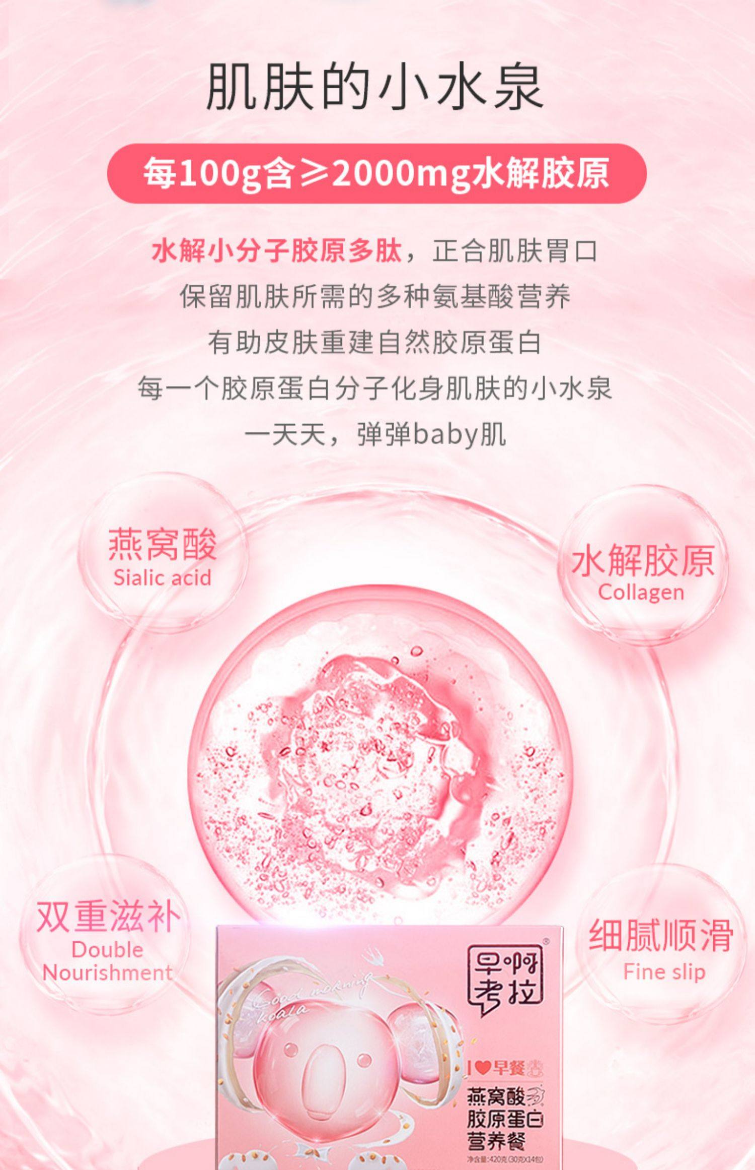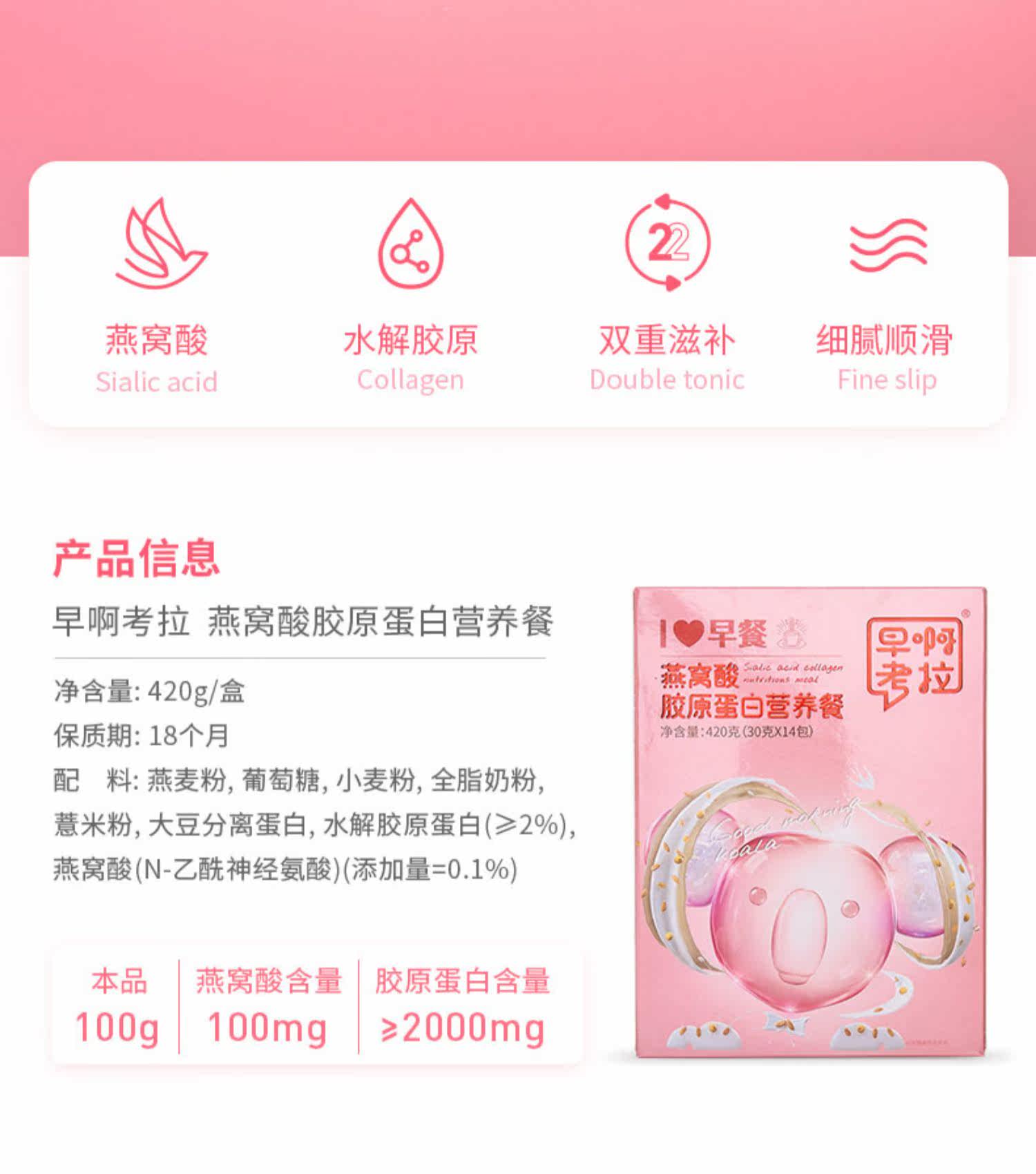 燕窝酸、水解胶原蛋白肽,营养早餐,双重滋补,细腻顺滑,喝出弹润Baby肌的早餐,多元搭配,每100g含100mg燕窝酸,不含蔗糖!
