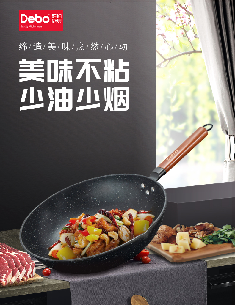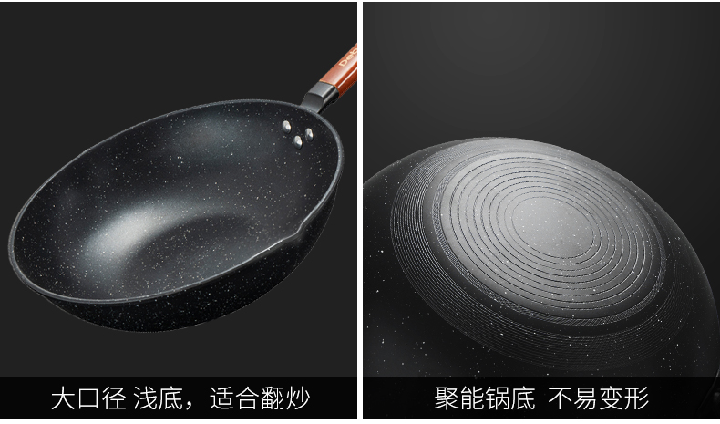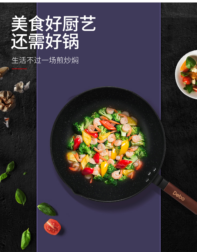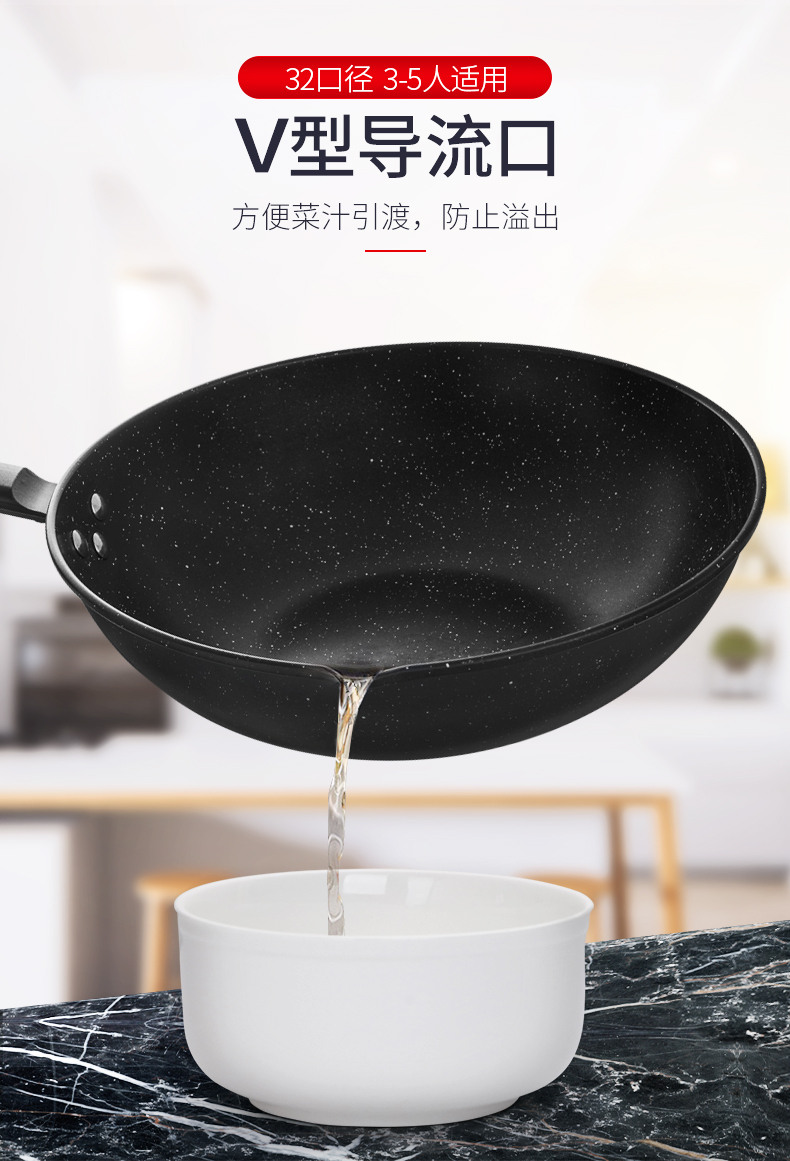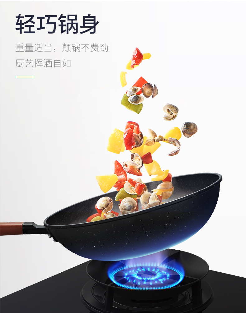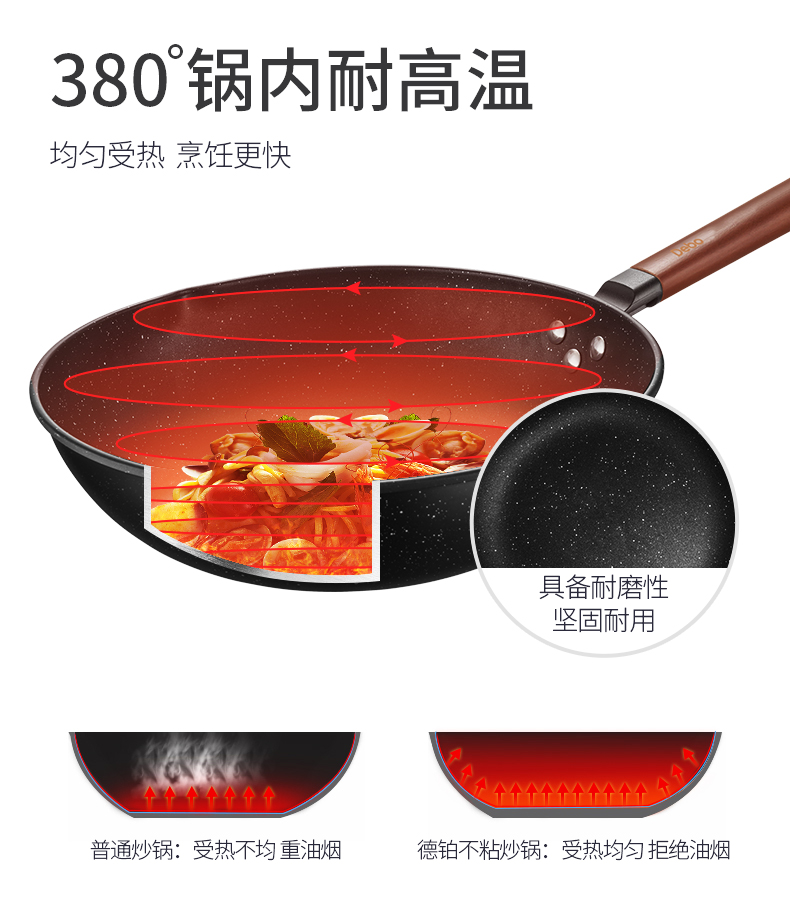 380°国内耐高温,均匀受热,烹饪更快,轻巧锅身,V型导流口,方便菜汁引渡,放心涂层,不粘锅技术,坚固耐用,易清洗,一擦即净。