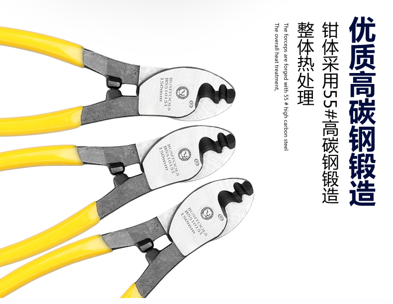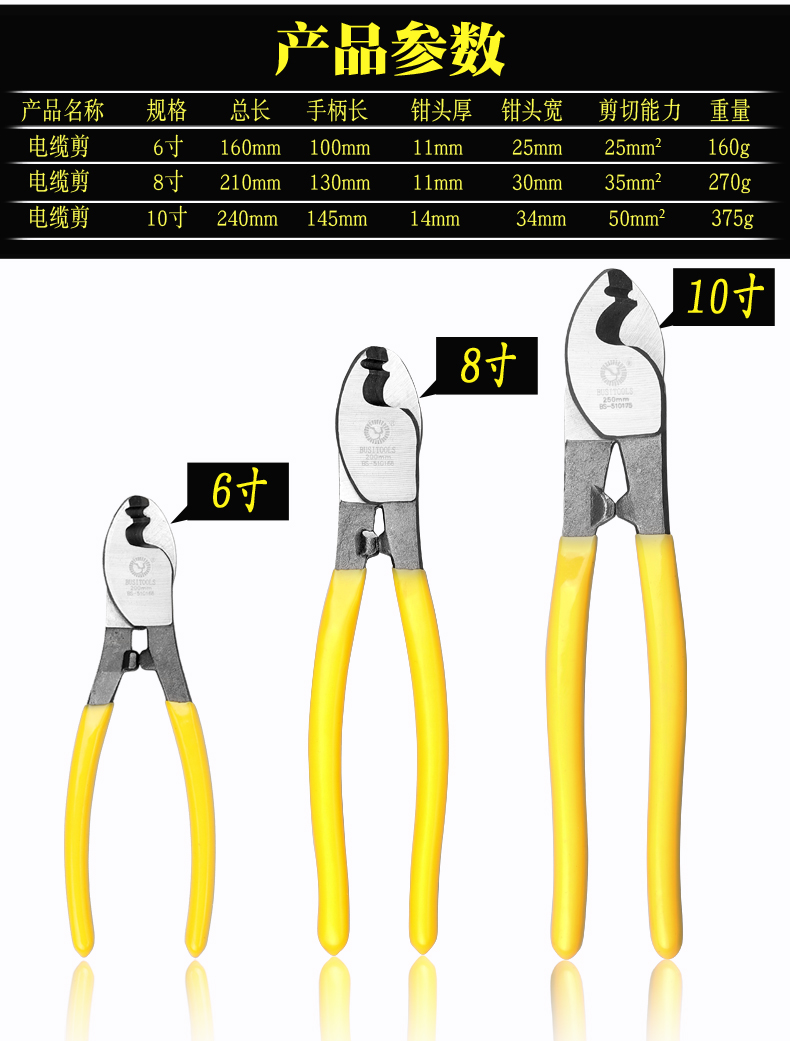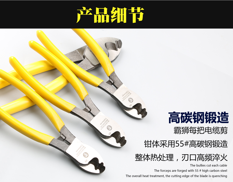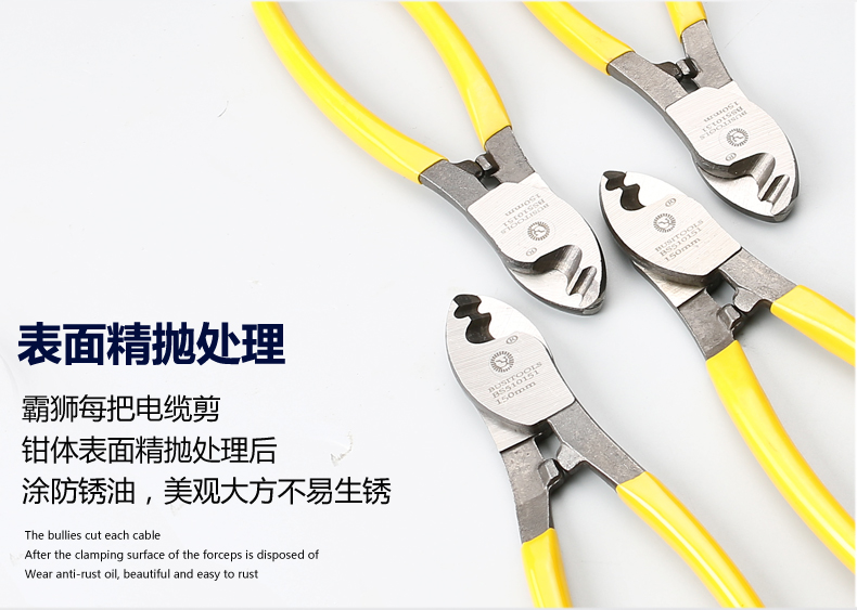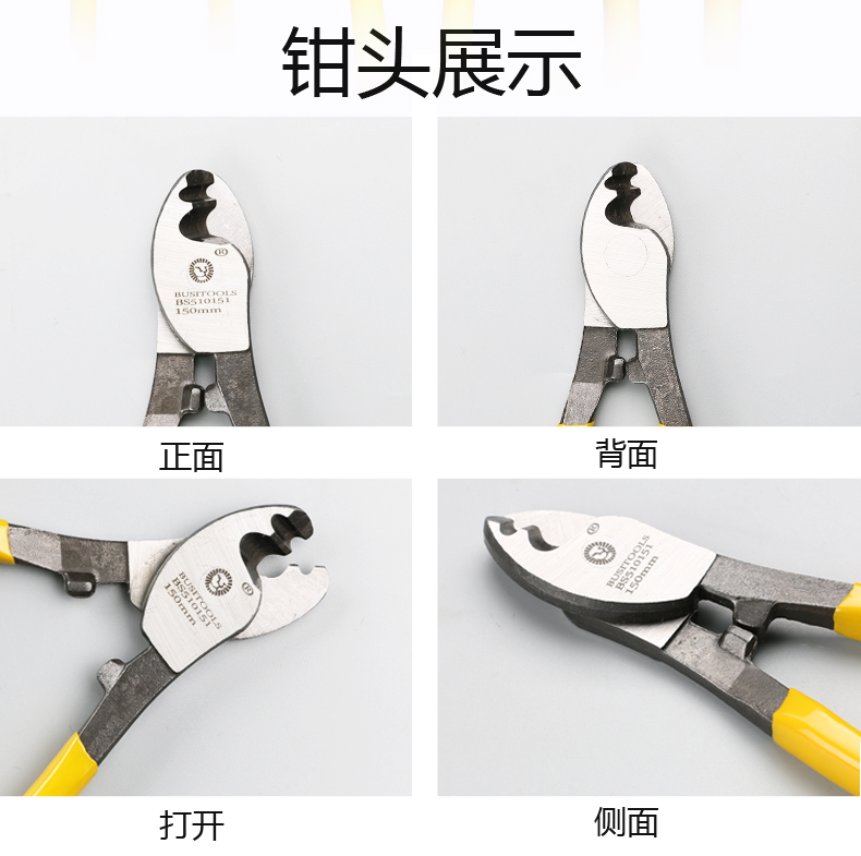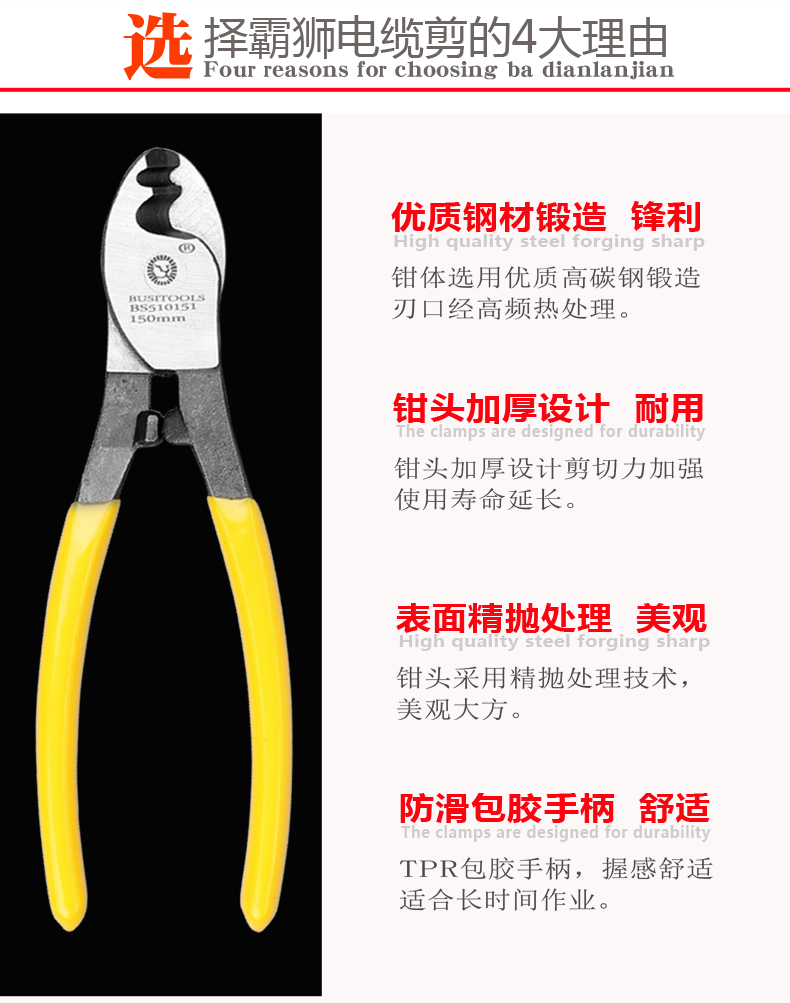 霸狮电缆剪刀,经过高碳钢锻造,整体热处理,握感舒适,寿命长,高硬度,手握不打滑,刀口锋利,轻松剪切,剥线省力,工作效率更高