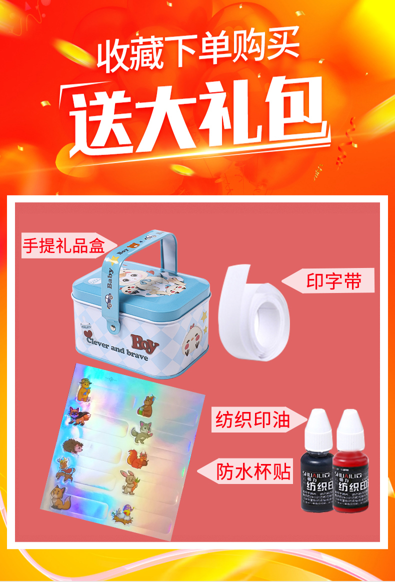 【送印字带+纺织印油+防水杯贴;下单请备注名字+样式】原装植物墨盒,无需加油,使用时间长,印迹清晰,防水洗不褪色,趣味卡通外壳,衣物、课本都能使用~孩子喜欢!