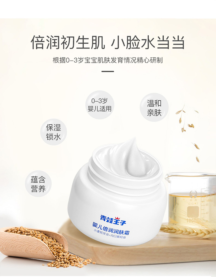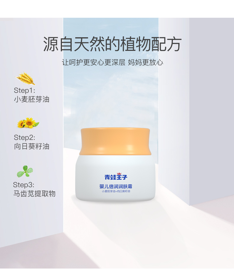青蛙王子专为婴儿精心研制,温和易吸收,蕴含多种天然植物精华,营养倍润,持久滋润保湿,全方位呵护宝宝肌肤,妈妈的放心选择~
