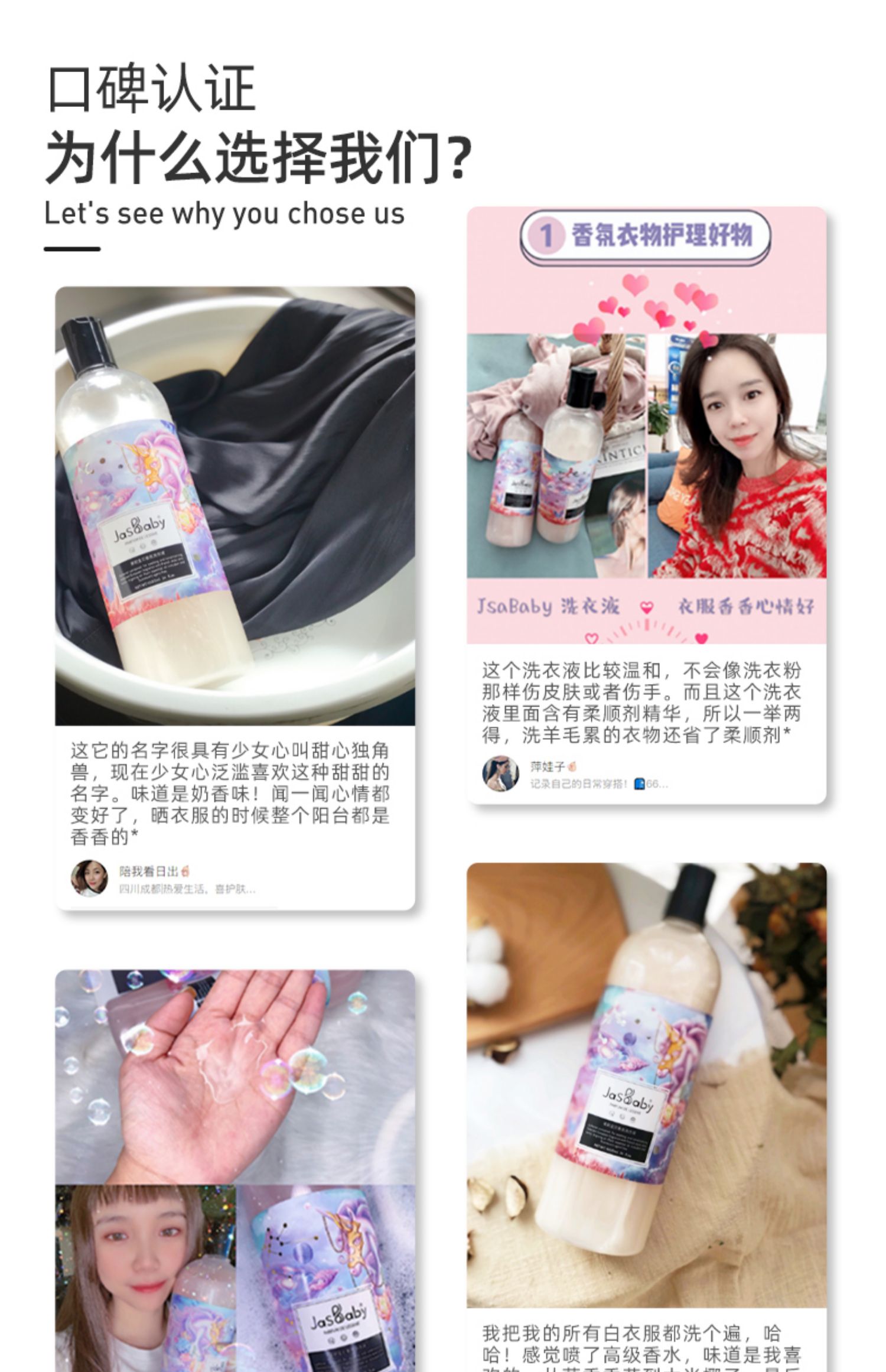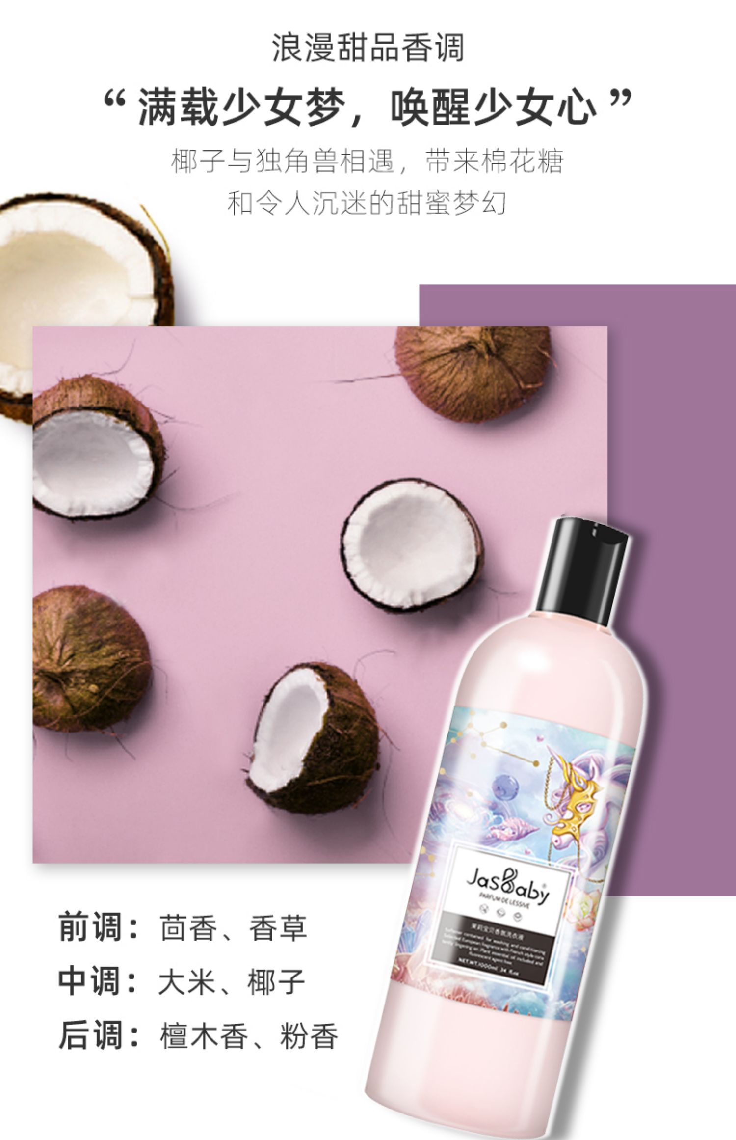 【JasBaby茉莉宝贝】椰子碰撞甜蜜诱人,像跌进了一朵饱满的棉花糖云朵,少女心爆棚~悦享衣物法式浪漫,甜心独角兽。呵护衣物,洁净柔顺,留香持久。
