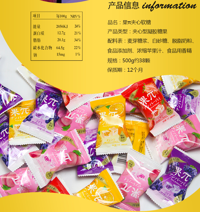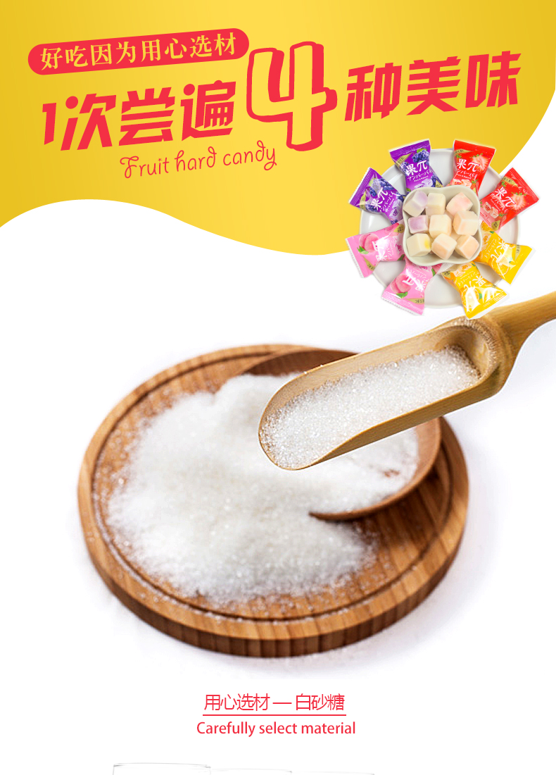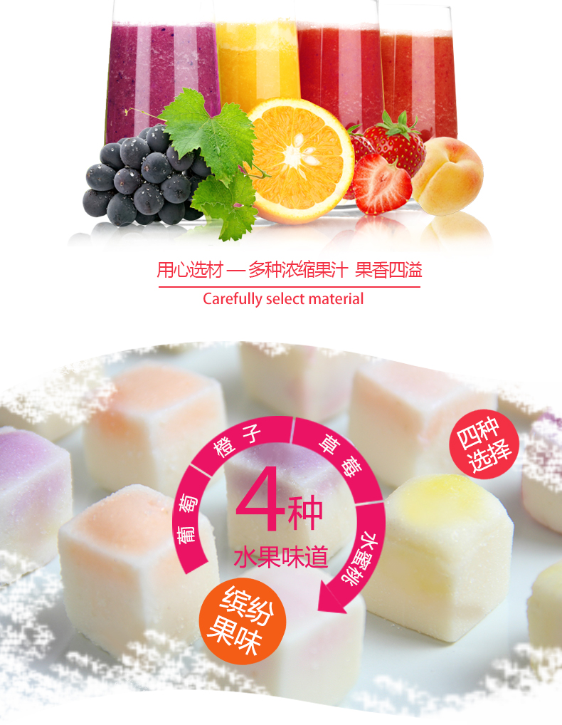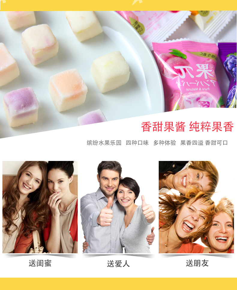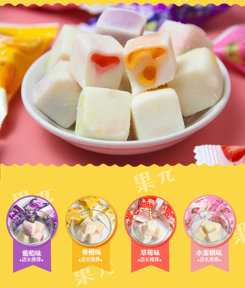 4种口味,春节糖果,水果夹心软糖,纯粹果香四种口味,添加果汁原浆,口感酸甜,一次尝遍四种美味,好吃因为用心选材多种浓缩果汁,果香四溢,独立小包装,方便携带,随时随地分享美味。