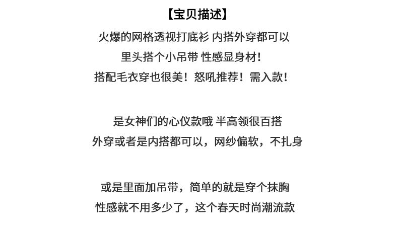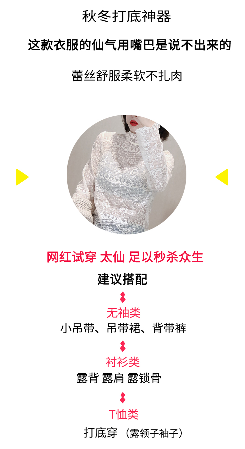 2020新款蕾丝、高品质纱线编织设计。时尚性感,上身效果超好,显瘦好搭衣服,不一样的性感,不一样的时尚。舒适面料,弹力显瘦!