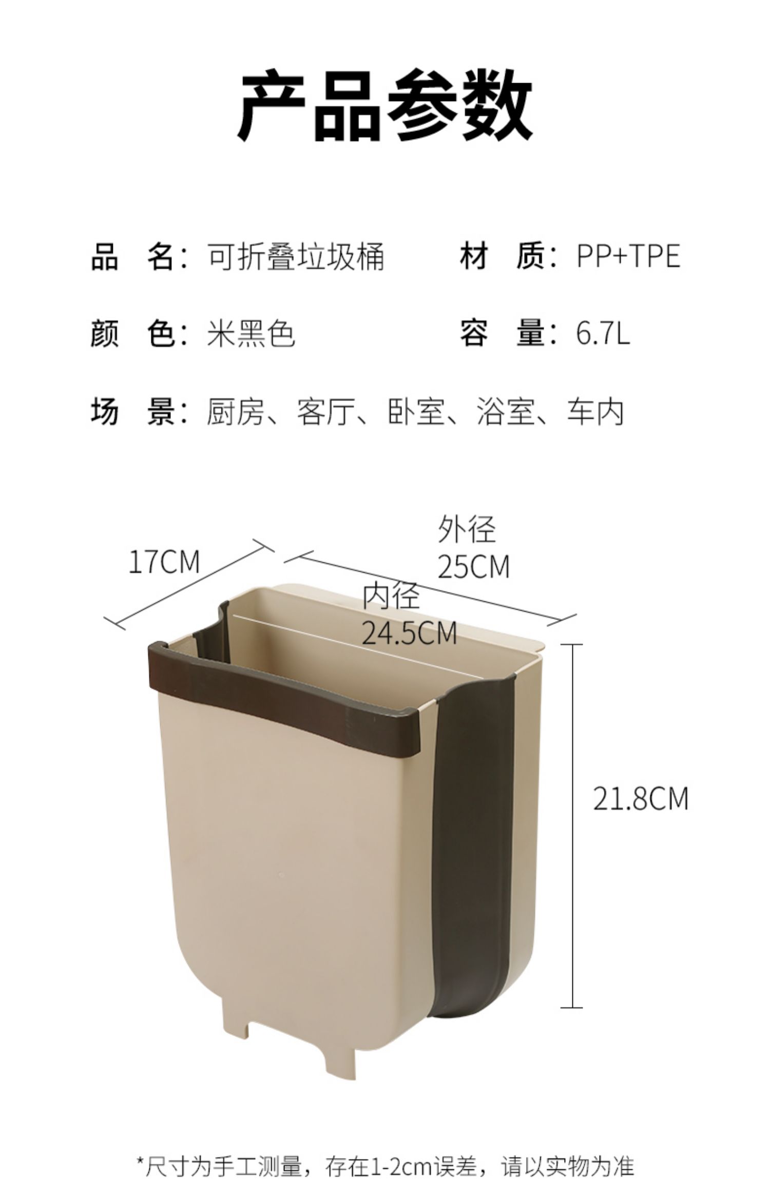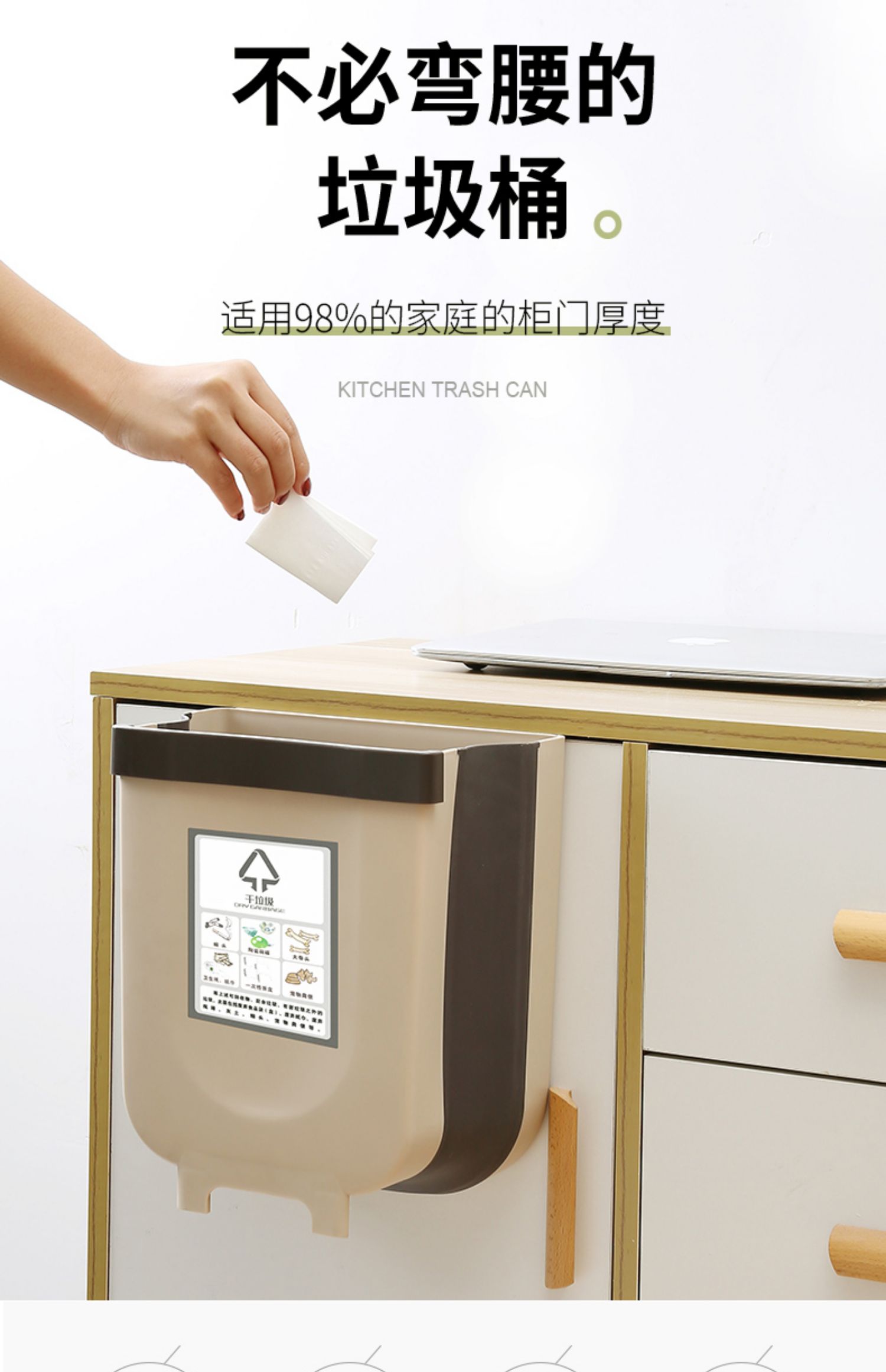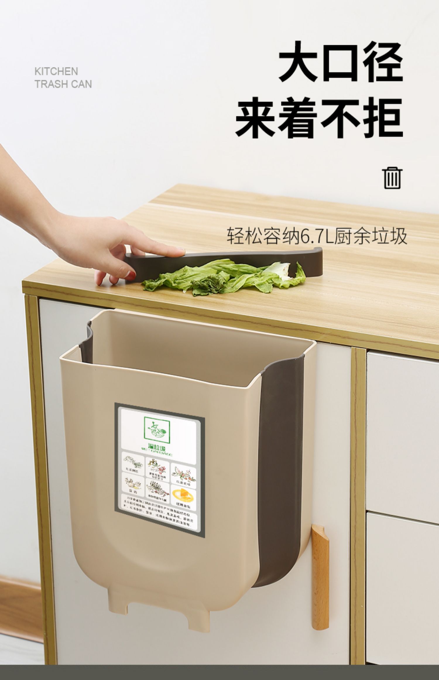 【推荐理由】:不用你弯腰的垃圾桶,全新概念折叠设计,不占空间,节省空间,使用方便,垃圾桶自带固定板,厨房,办公室,客厅,卧室随处可挂。