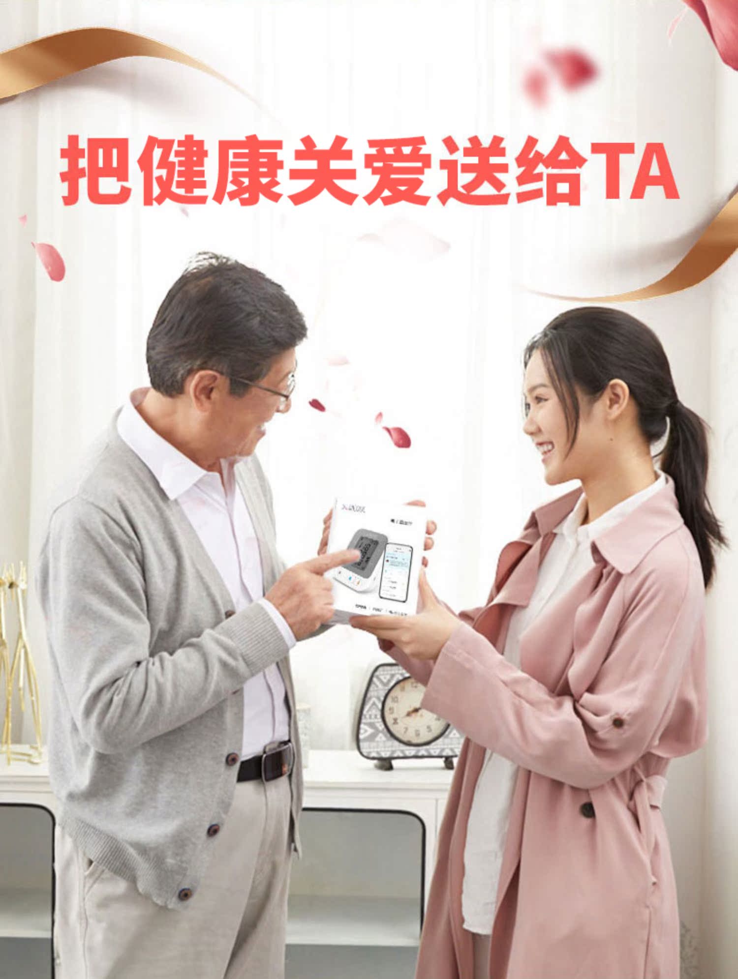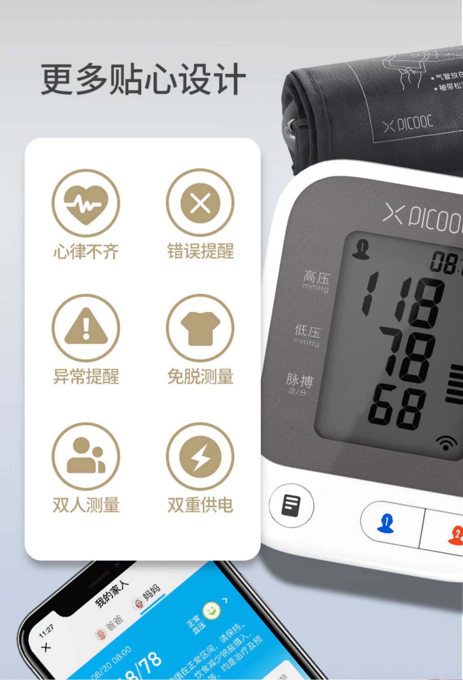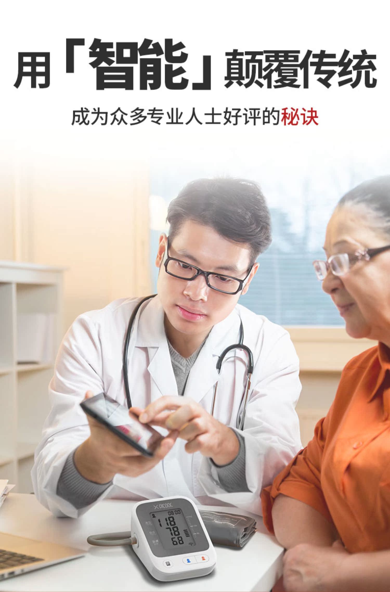 【4.9高评分】上臂式电子血压计,大屏显示,智能加压,测量平均值,语音播报,360度立体袖带。双人2×120条数据,一键式操作,微信实时呈现爸妈的血压报告,适应各类人群使用。