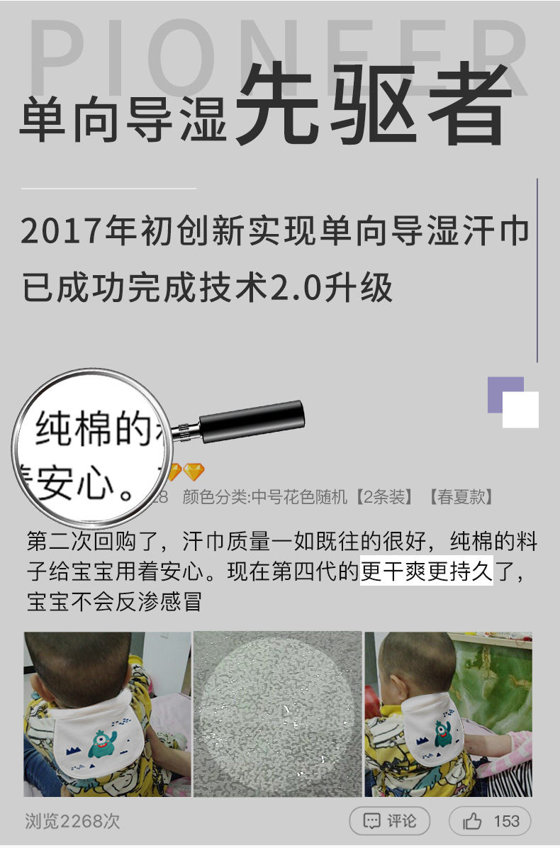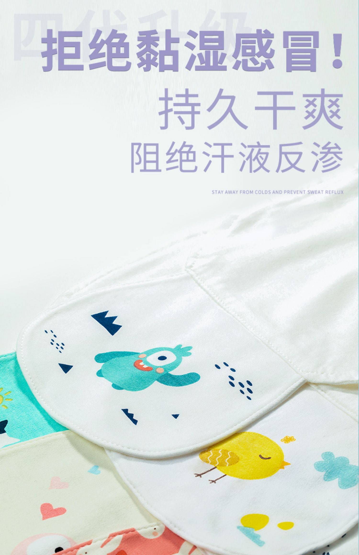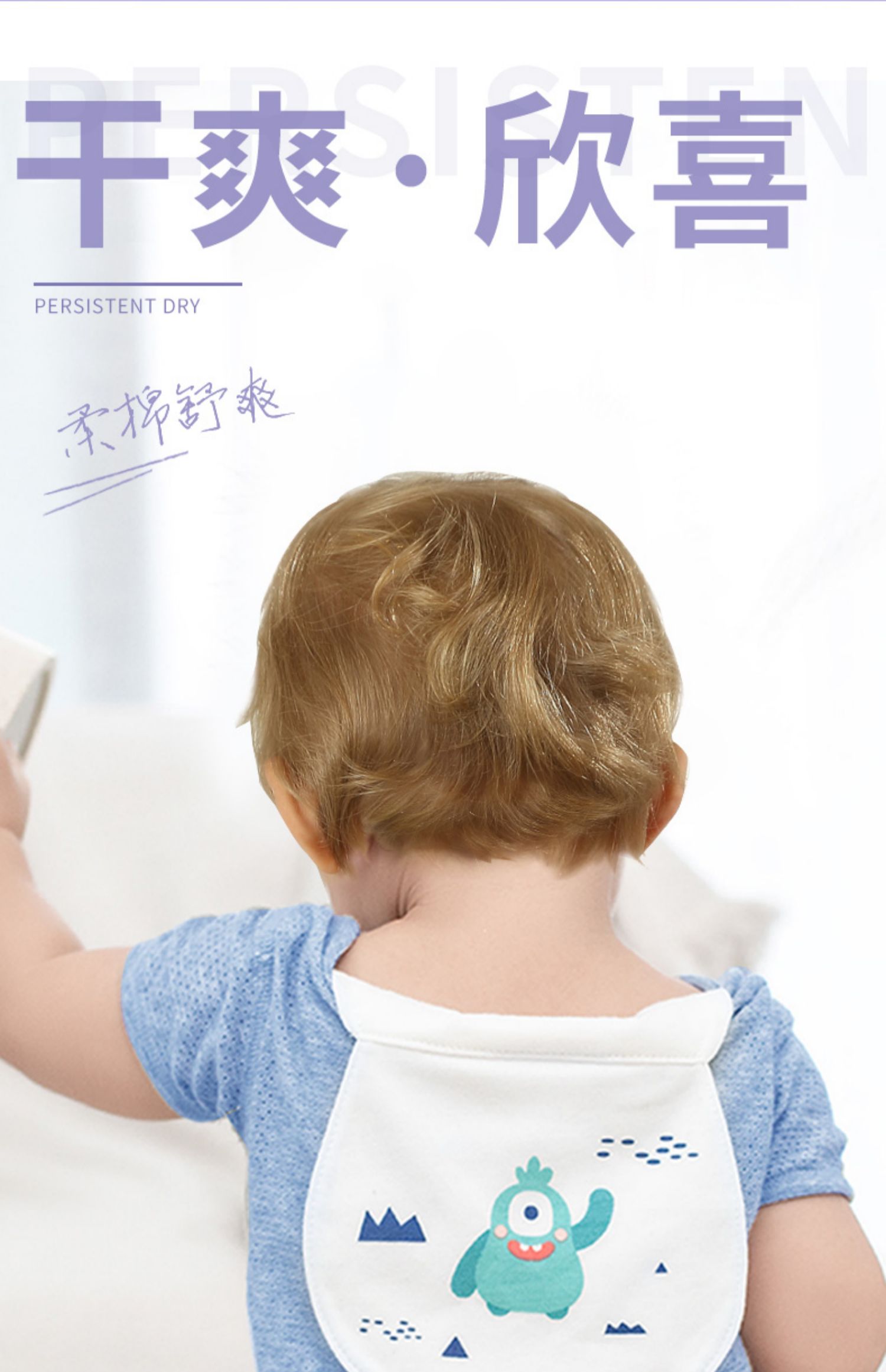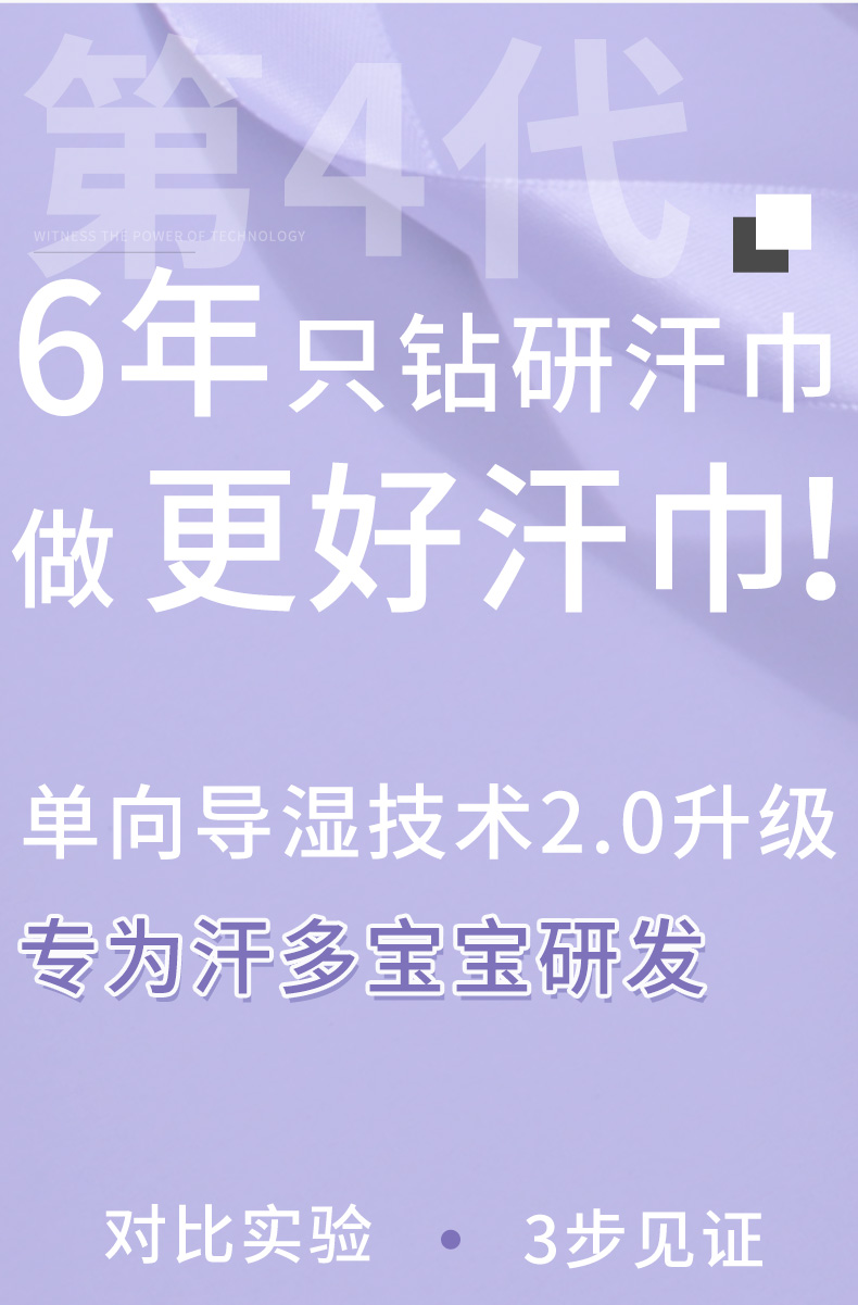 纯棉吸汗巾,第4代单向导湿技术,专为汗多宝宝研发,吸湿排汗,快速蒸发,持久干爽不闷黏,质感柔软,与肌肤接触无任何刺激,用起来心情美美哒~
