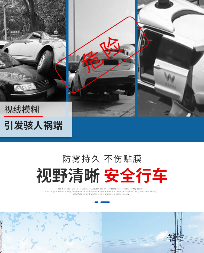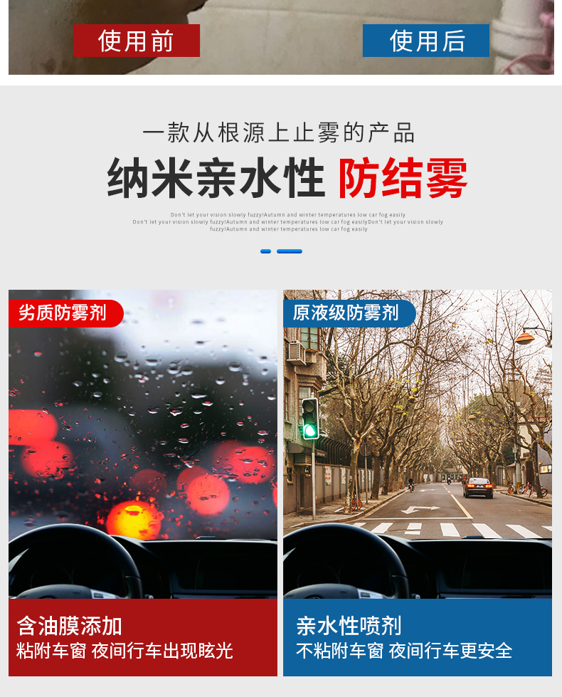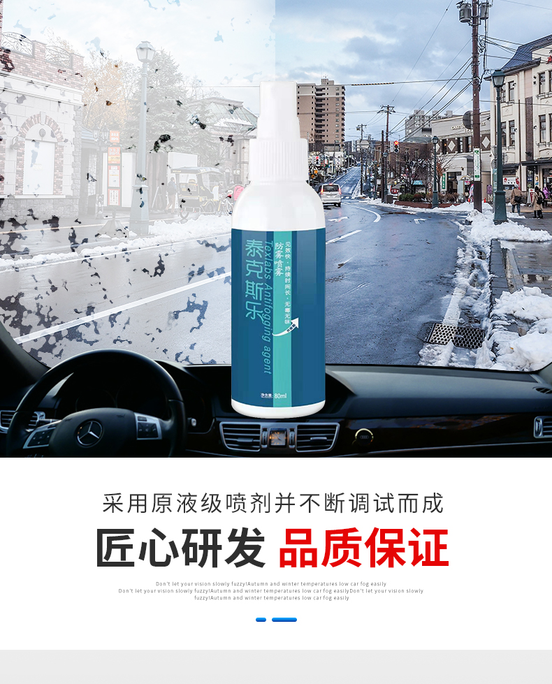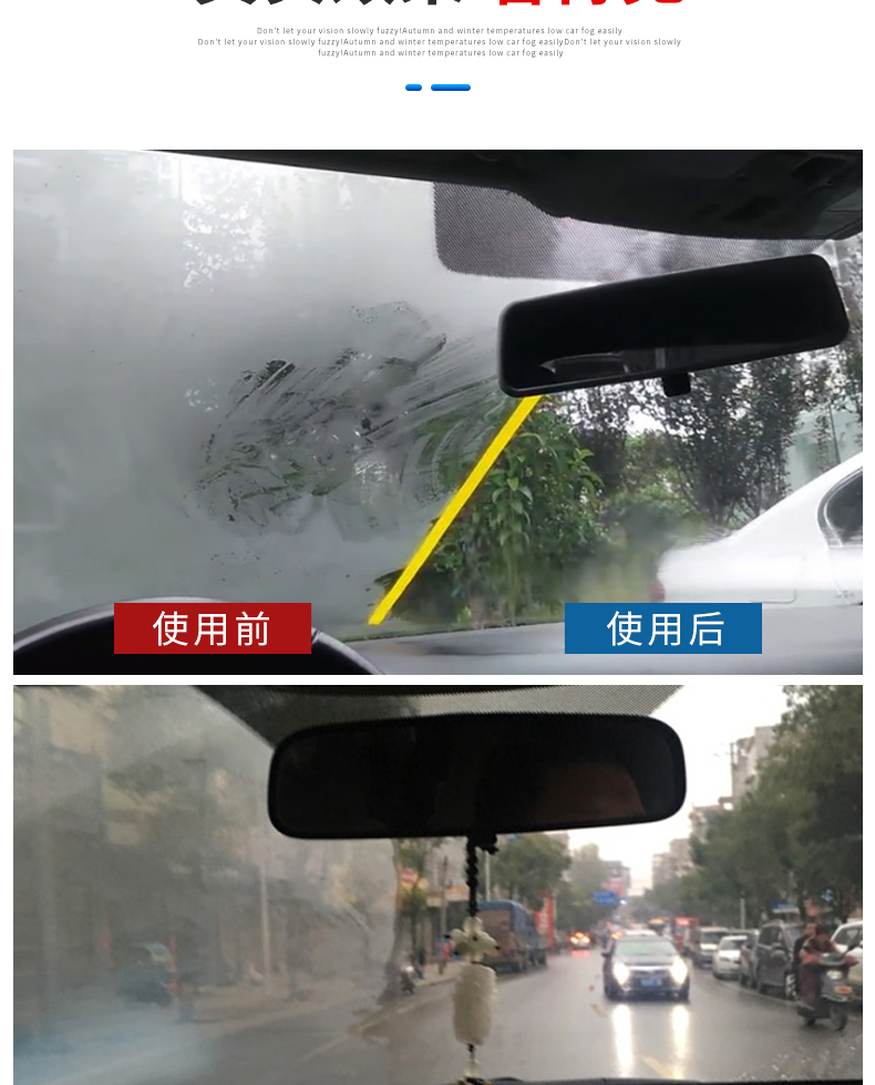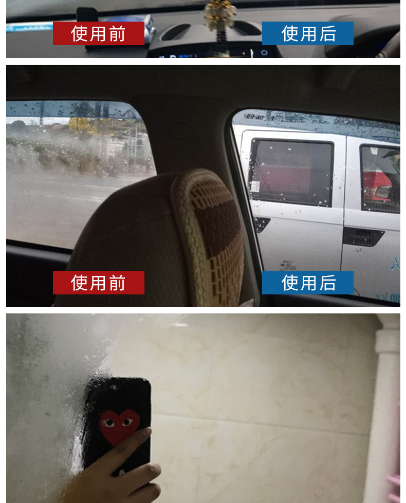 一次喷涂,防雾30天,不伤手,不伤膜,更清晰。保证行车安全,纳米亲水性防结雾,从根源解决问题,匠心研发品质保证,真实效果看得见!