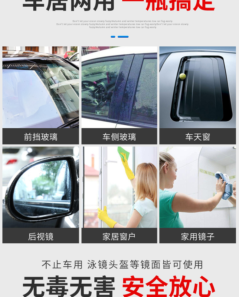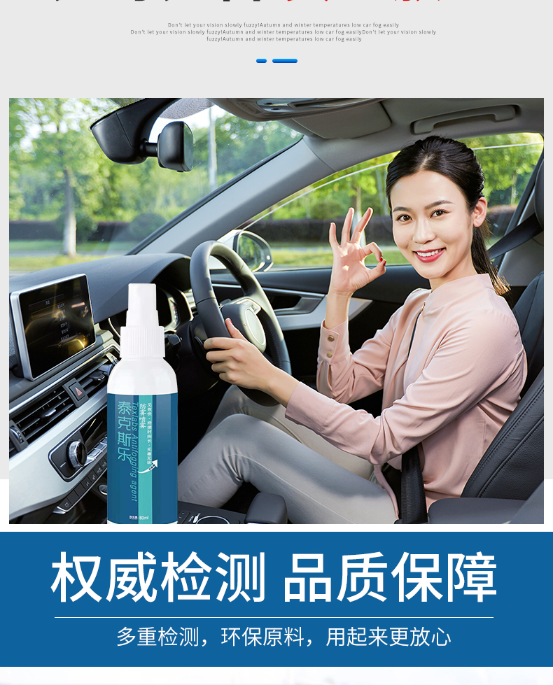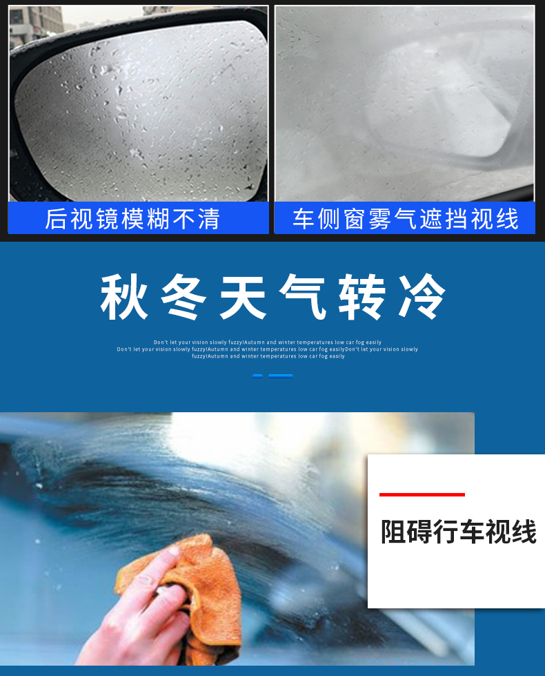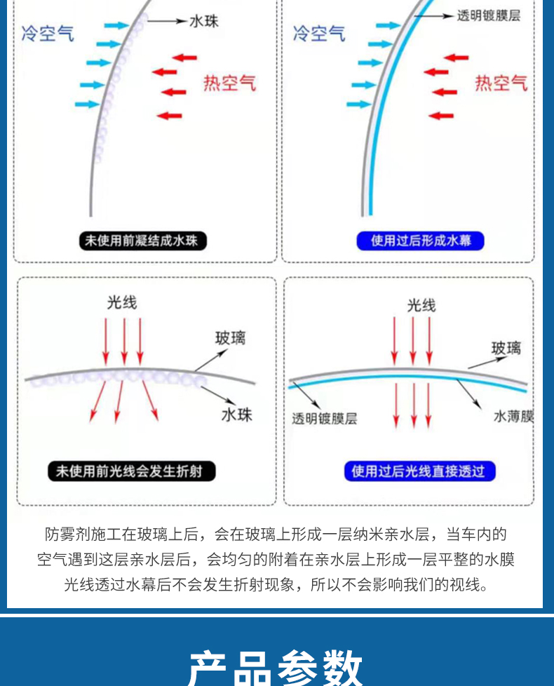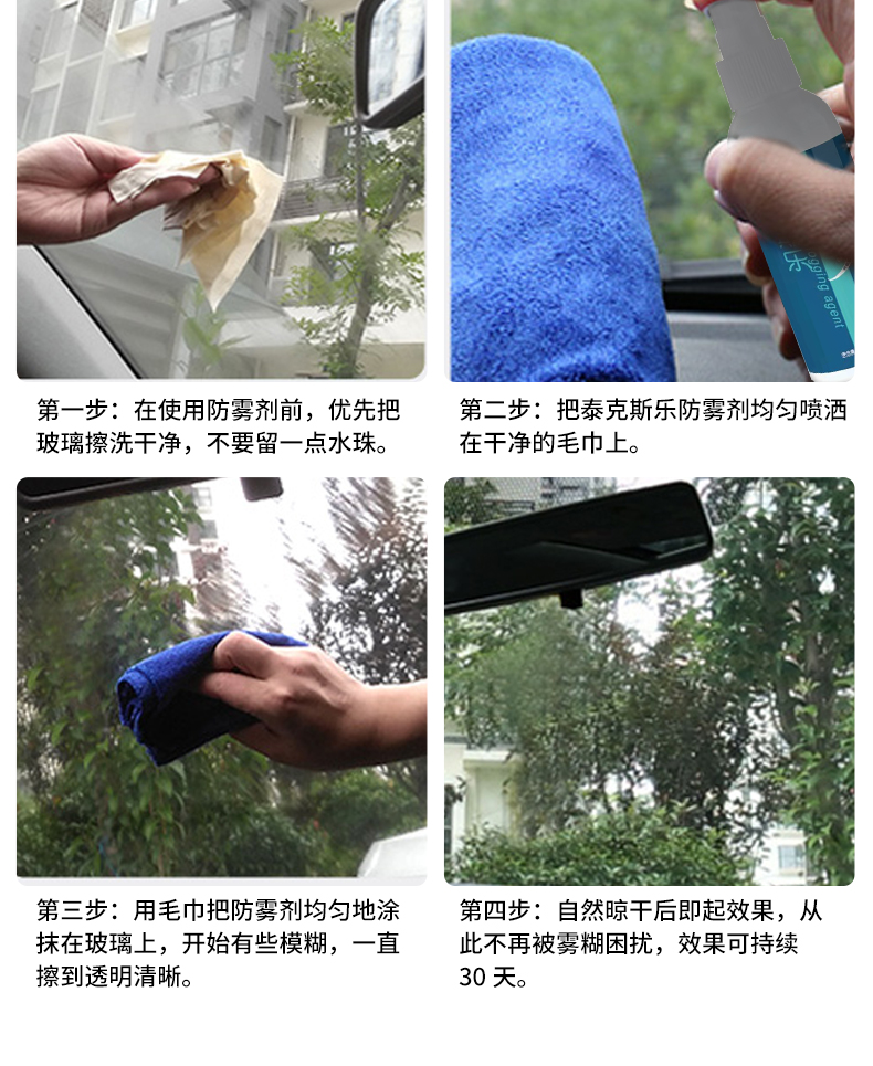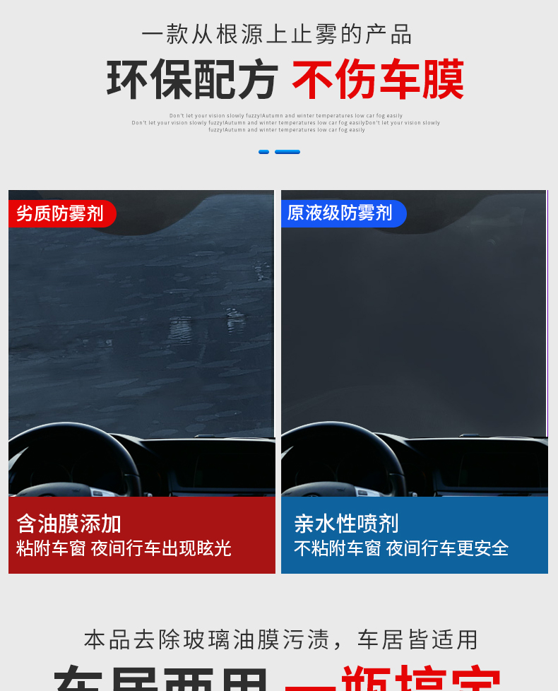 一次喷涂,防雾30天,不伤手,不伤膜,更清晰。保证行车安全,纳米亲水性防结雾,从根源解决问题,匠心研发品质保证,真实效果看得见!