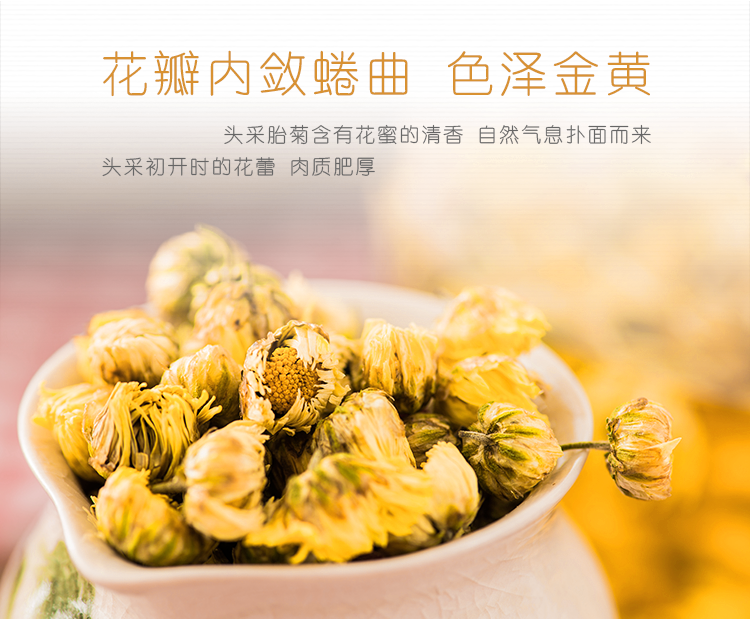 天然采摘,颗粒饱满,色泽金黄,安全无添加。清甜可口后味回甘,清热解火!吃完火锅,熬完夜,给自己来一杯菊花茶!
