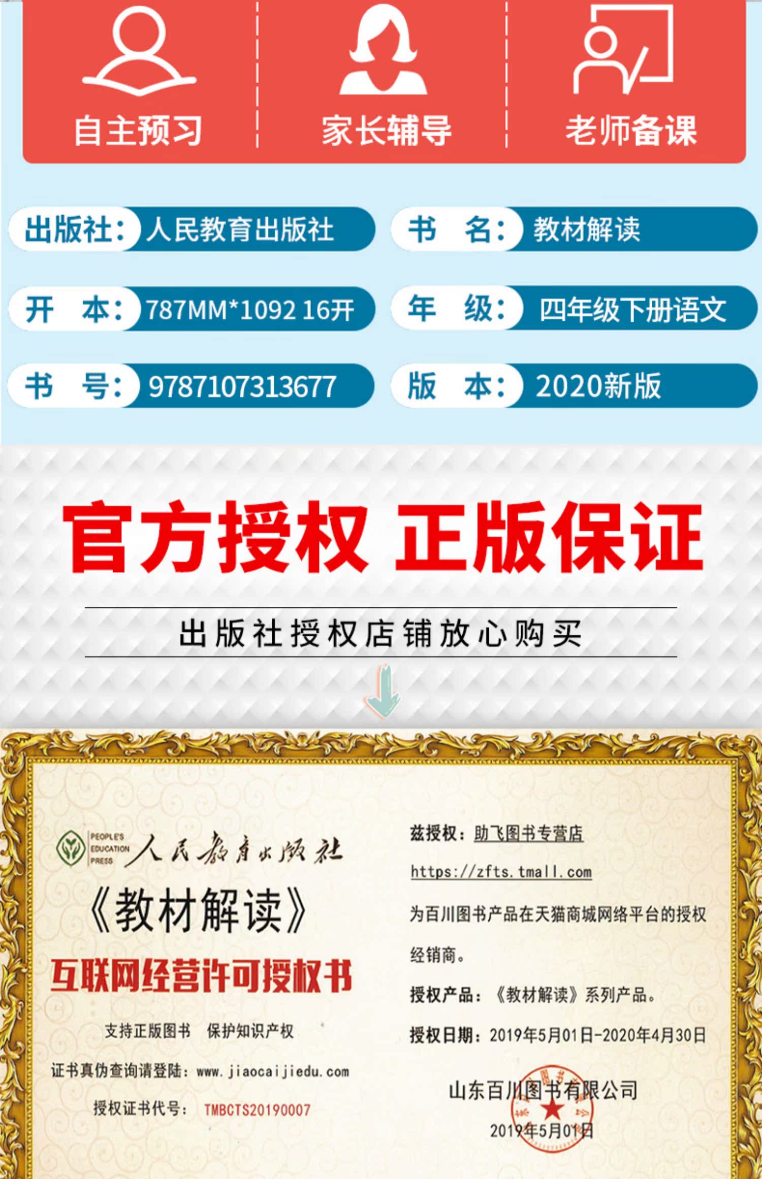 【助飞书店】【买一发七】四年级下册语文教材解读,全面的家教老师,父母的好帮手。同步教材,讲练结合,16大开本,字迹清晰,插花精美,培养学生思考能力,增强应用意识!比别人学习更快一步!
