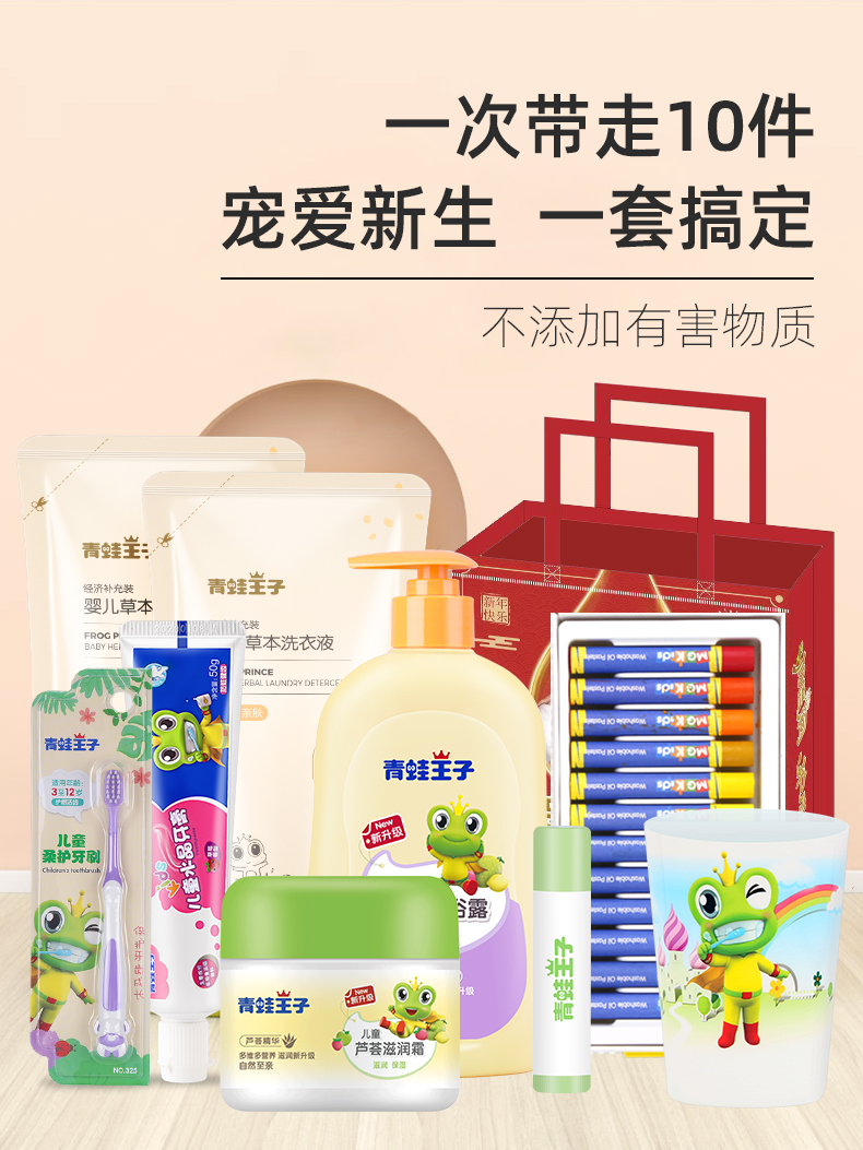 【过年送礼,青蛙王子专卖店!超值10大件】婴儿草本洗衣液2大瓶+牙刷牙膏口杯套装+洗发沐浴露+芦荟滋润霜+补水润唇膏+青蛙王子礼袋+油画棒礼盒!一整套大牌子带回家里,超划算!!【赠运费险】