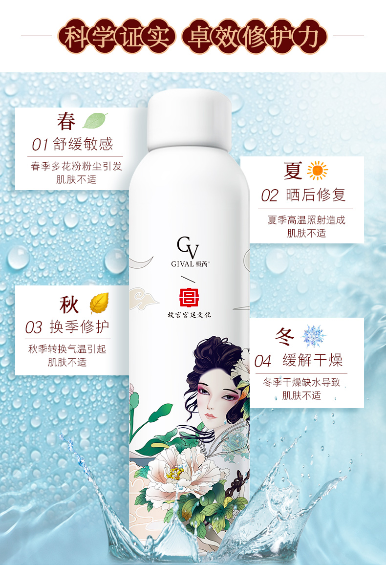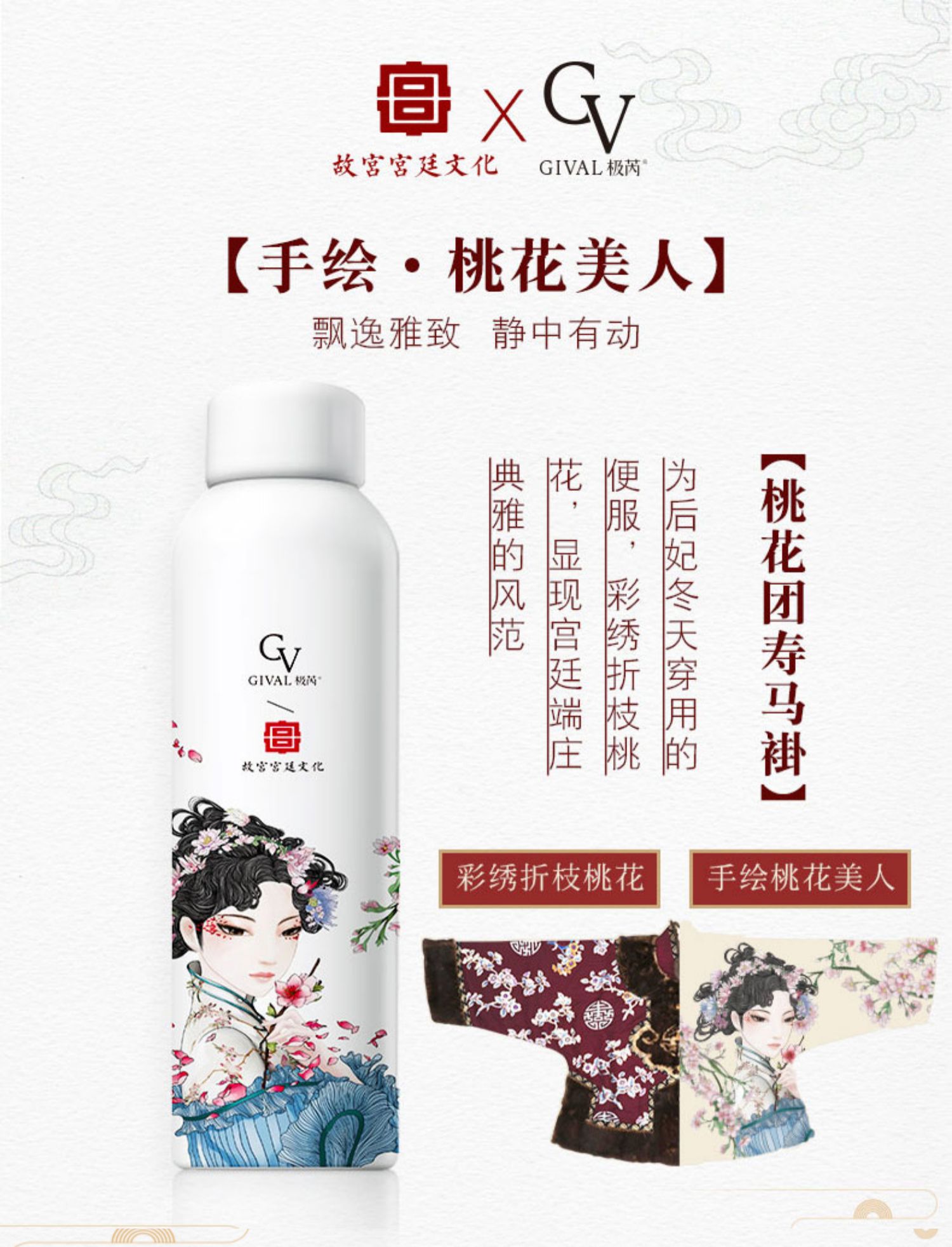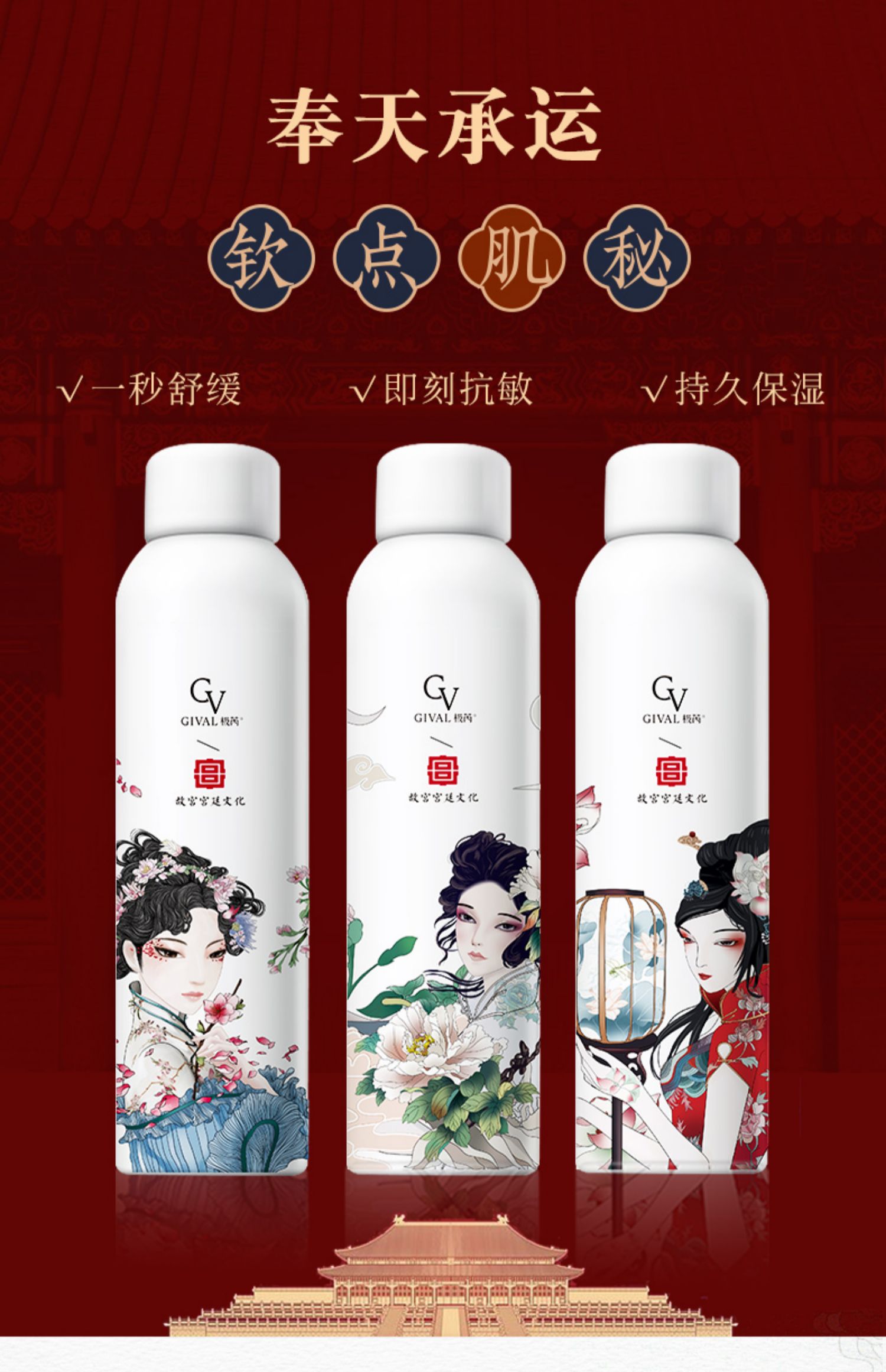 与故宫文化联合打造的GIVAL/极芮故宫喷雾抗敏感爽肤水手绘瓶身,颜值超高!快速补水,锁住水分流失,抵抗衰老!采用植物精华,适用于任何皮肤!还有淡淡的茉莉花香,好闻不腻!只要19元就能带回家!