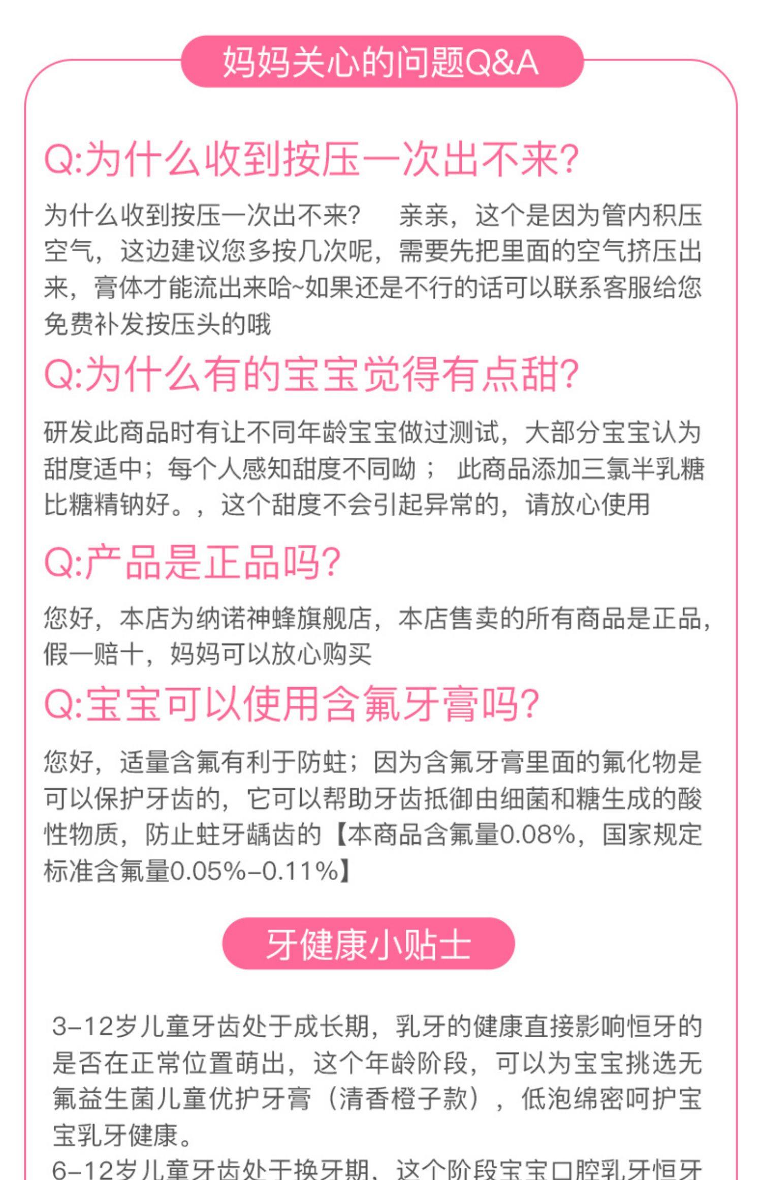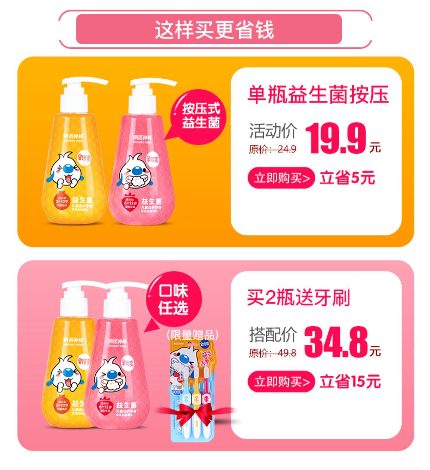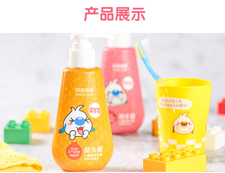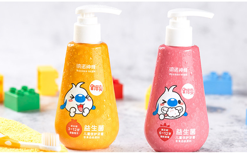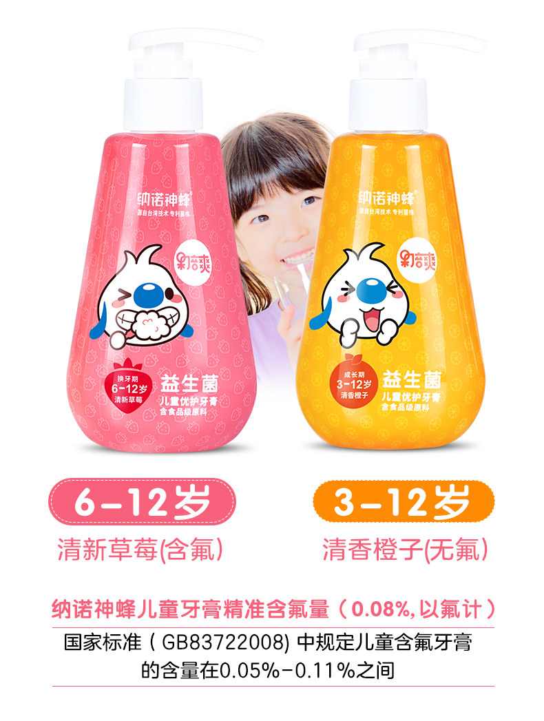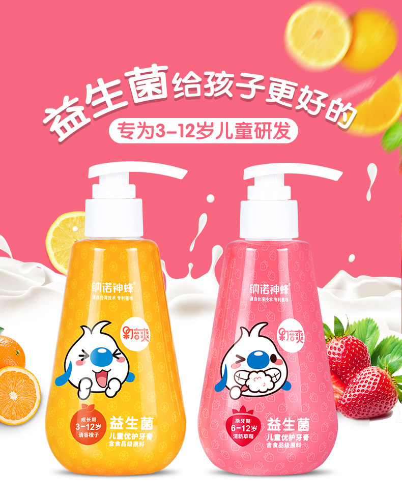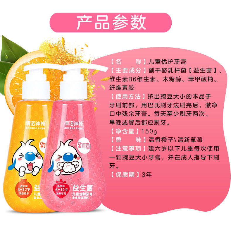 按压式益生菌儿童牙膏150g超大容量,专为3~12岁儿童研制!专利认证,安全可吞咽,平衡口腔菌群,奶香水果味,让宝宝爱上刷牙!