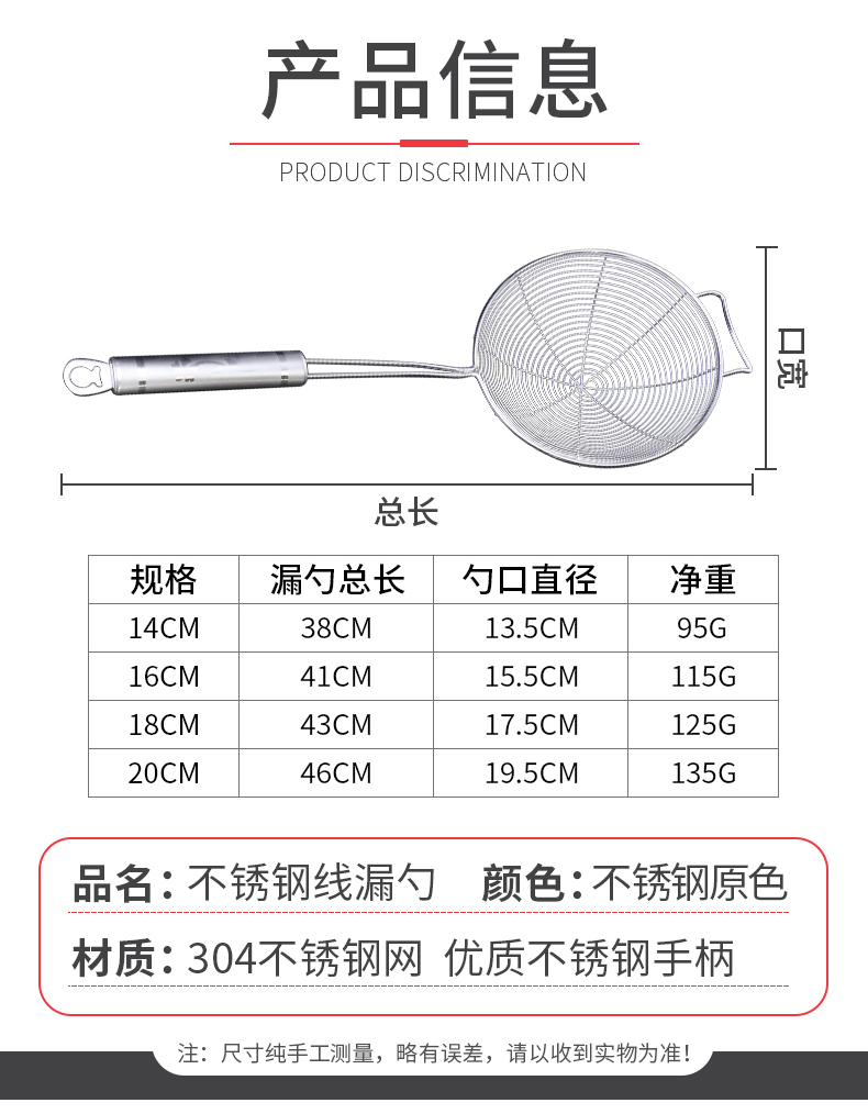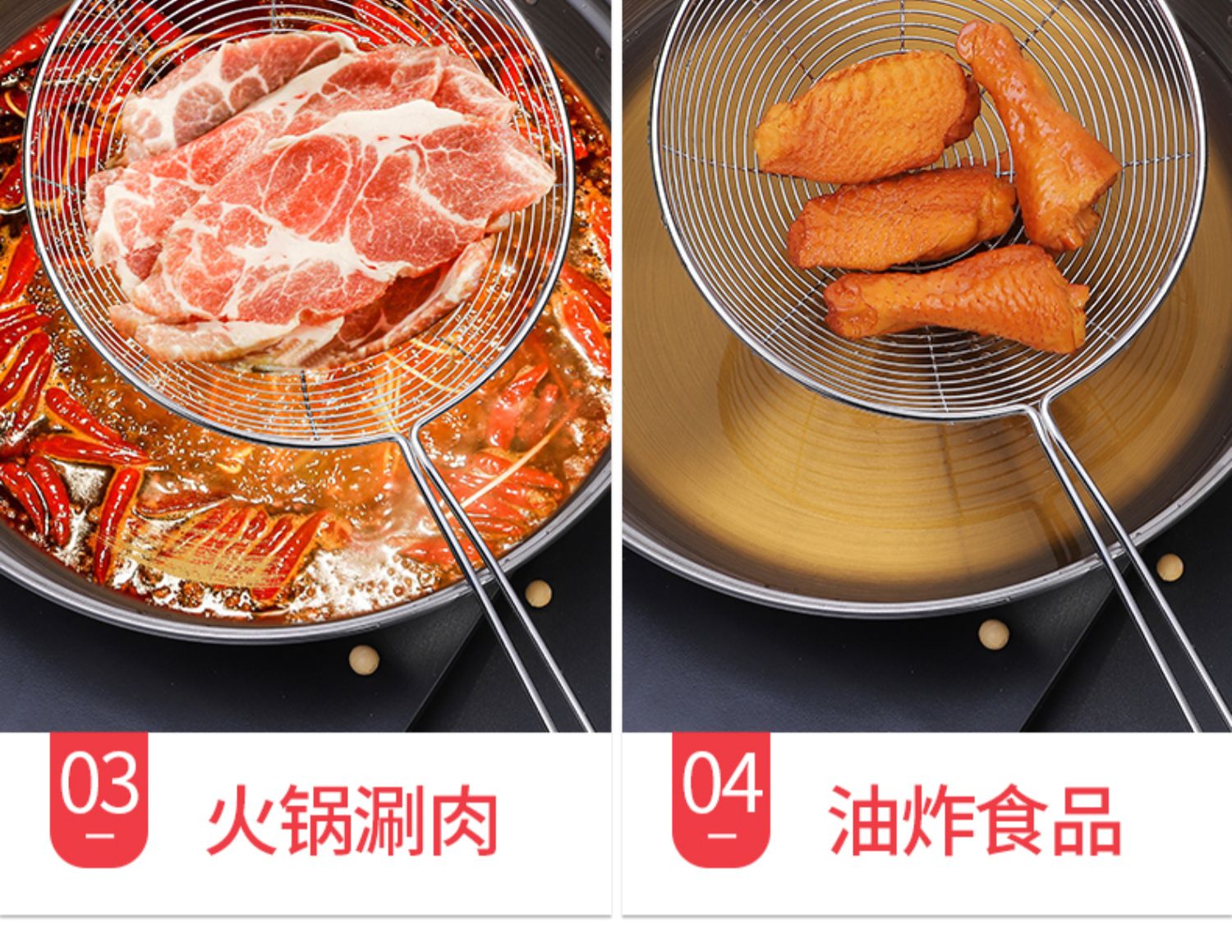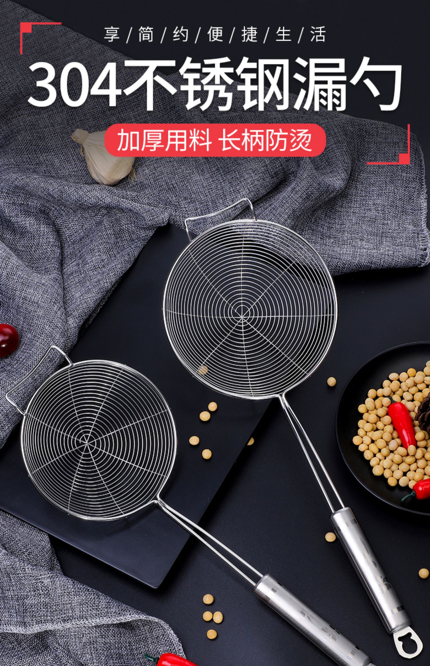 【加厚不锈钢,捞饺子/面条/炸东西样样行】不锈钢捞勺,线柄加粗,结实耐用。一体成型,沥水均匀!长手柄防烫,耳勾设计,可挂在锅边涮肉,中空握柄,可悬挂收藏,过年炸东西一定要买的哦!【送运费险】
