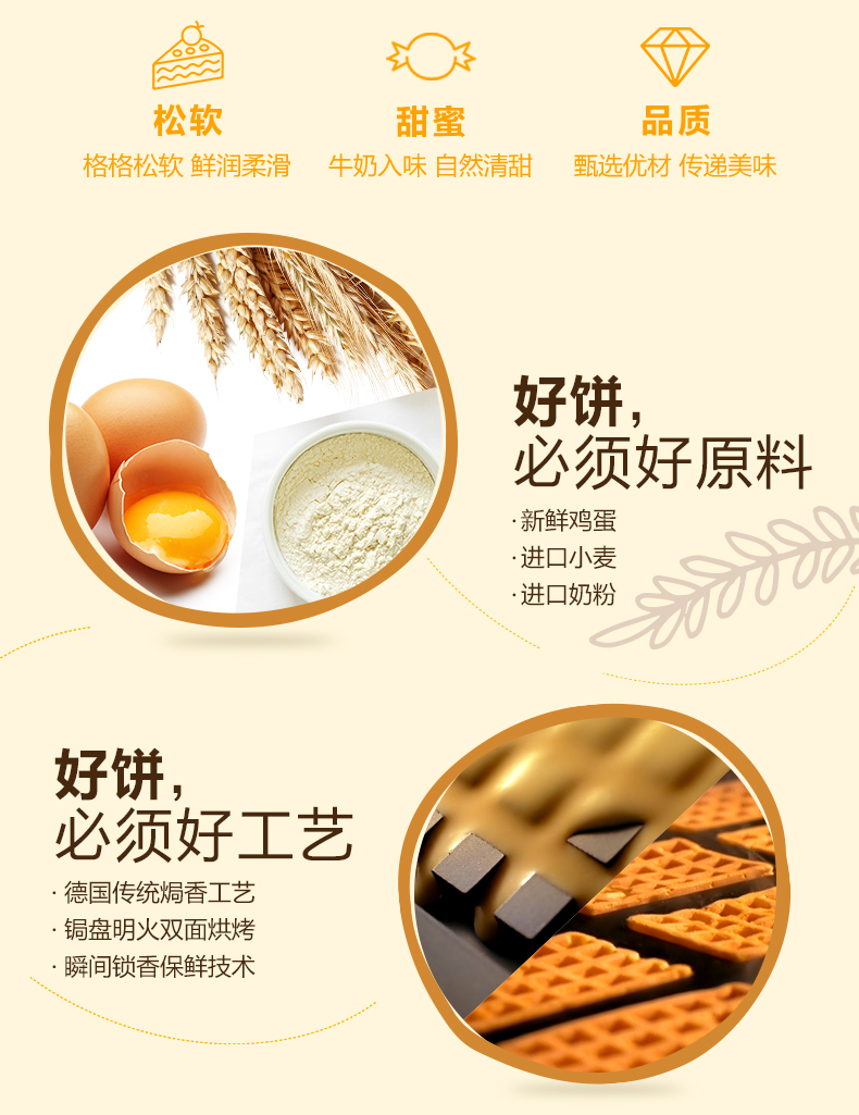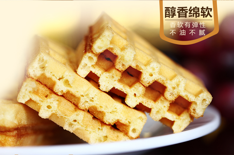 4.9高评分,零差评,没有比这更好吃的华夫饼了,新鲜鸡蛋,进口奶粉,进口小麦,吃起来满口的奶香味,早餐零食来两包,简直是不要太美味了,年货节大促,赶紧抢起来!