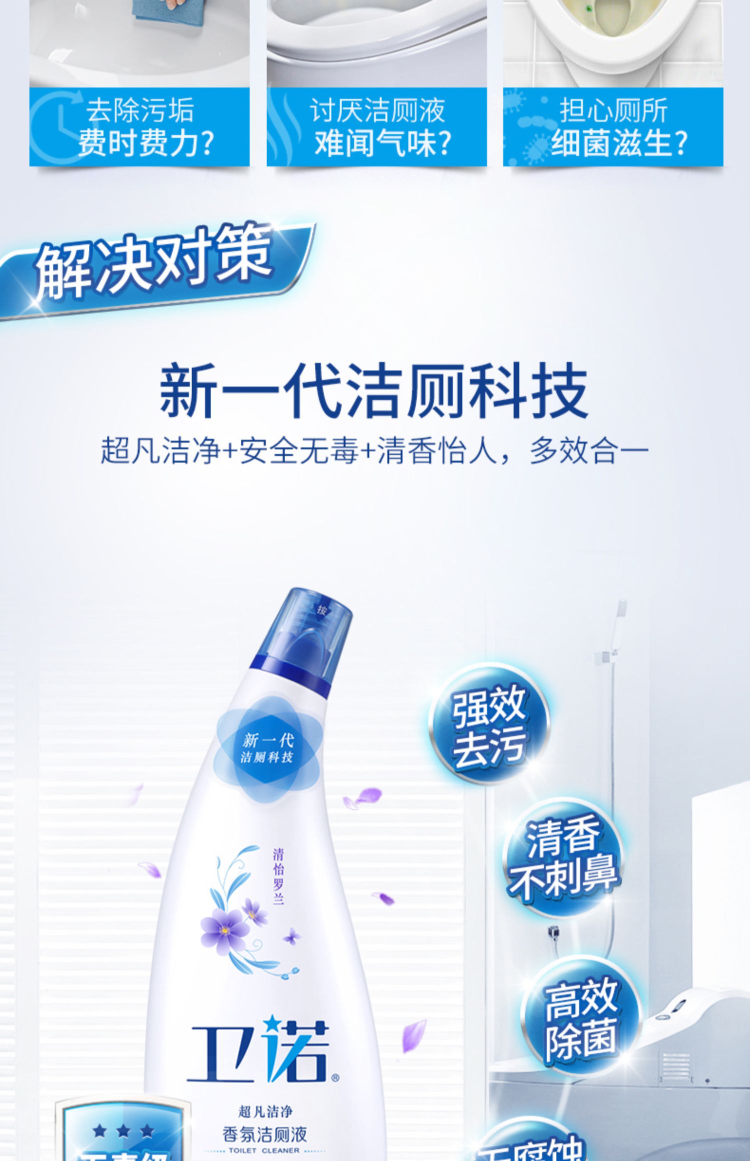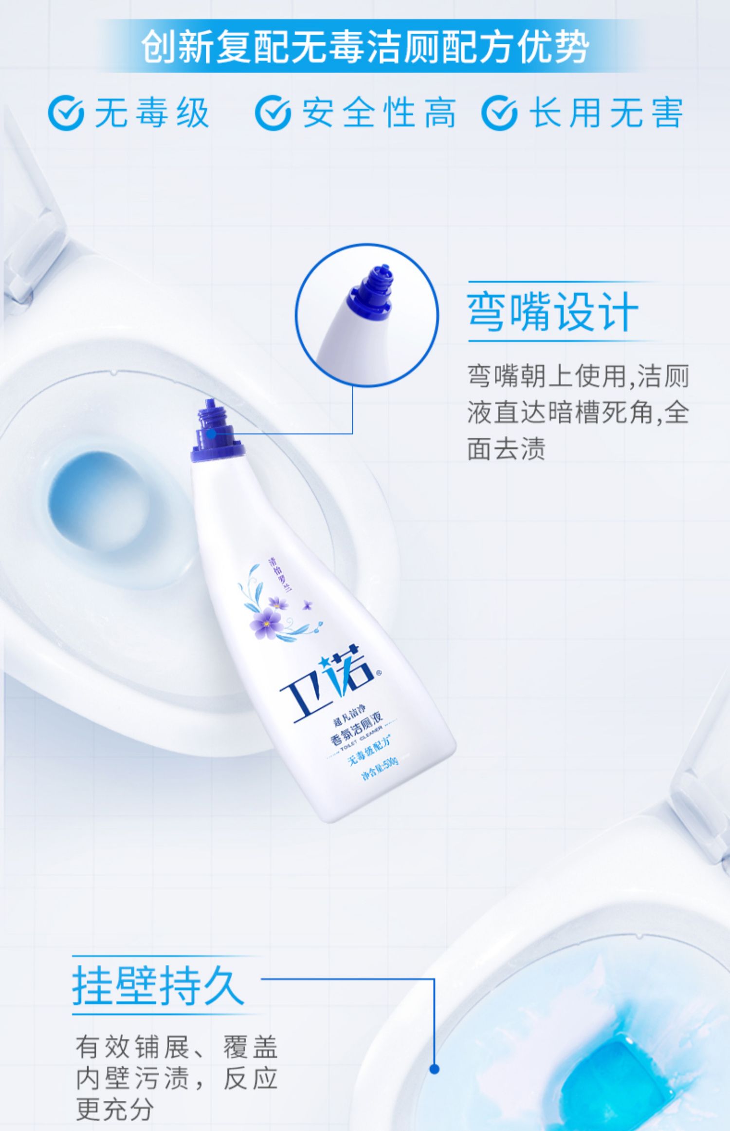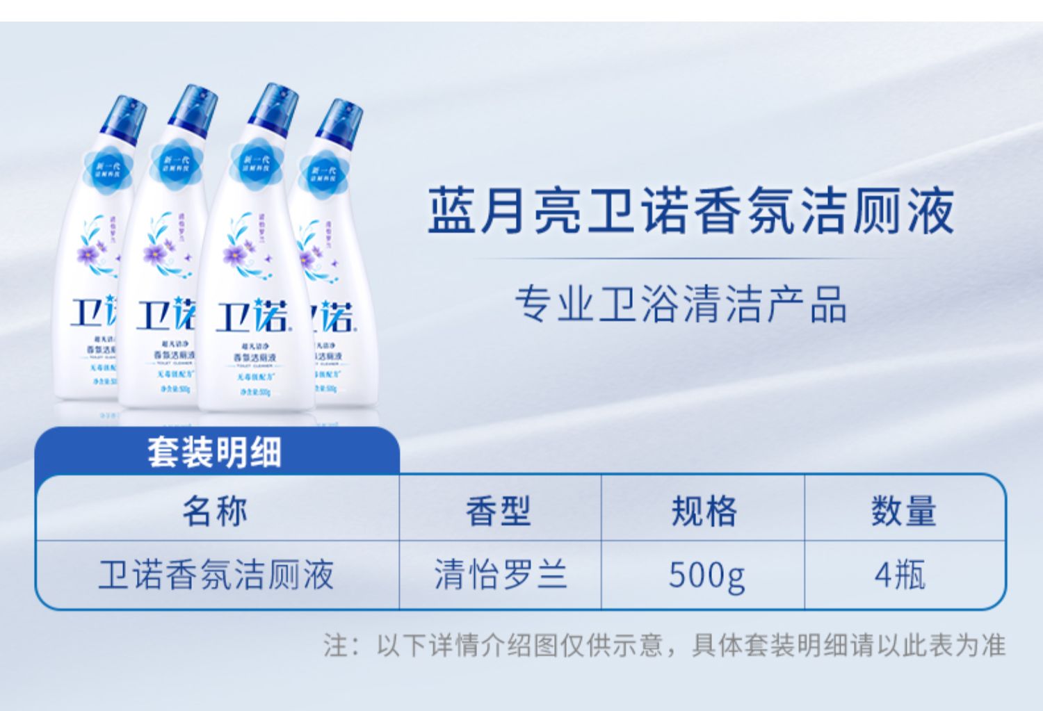 【蓝月亮大牌】卫诺洁厕液,拍1件是4瓶500ml滴,约半年用量,清香型洁厕液,解决你的四大烦恼,快速去除臭味,强力清洁去污,去垢,让马桶洁净保洁,清新怡人!
