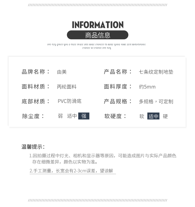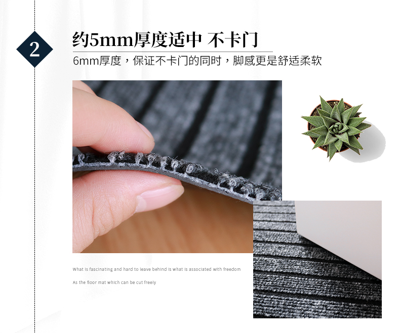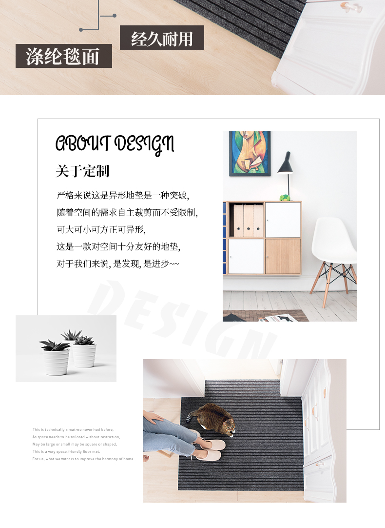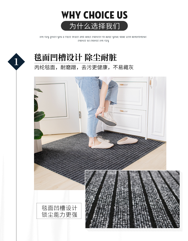 门厅除尘防滑,防湿防潮,丙纶毯面,耐磨蹭,去污更健康,PVC强力防滑底,环保无异味,让各个房间都远离油污!