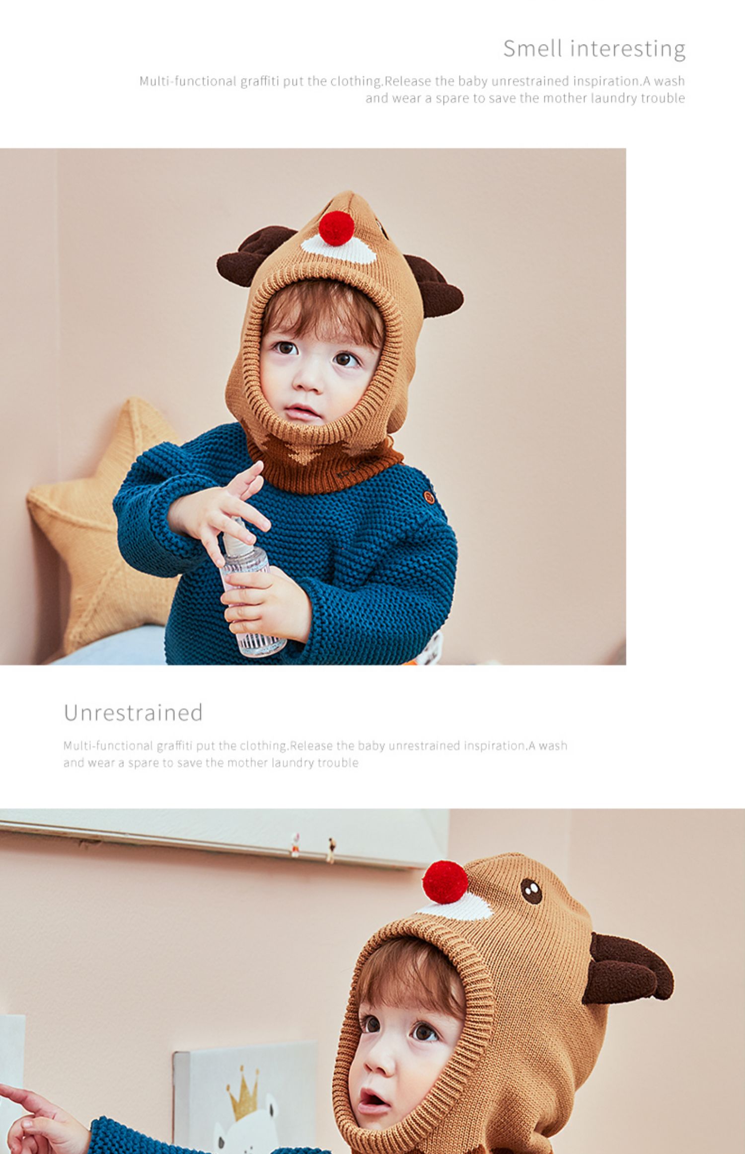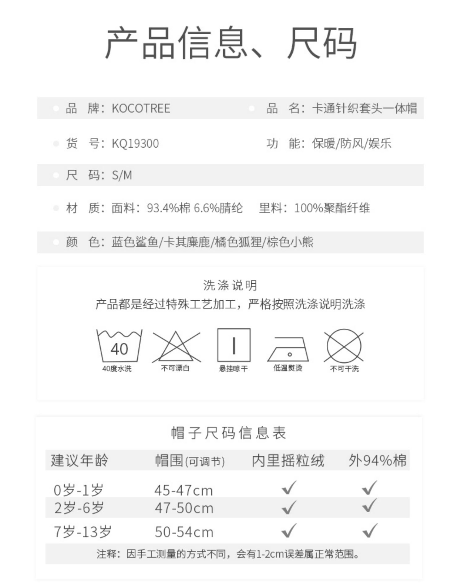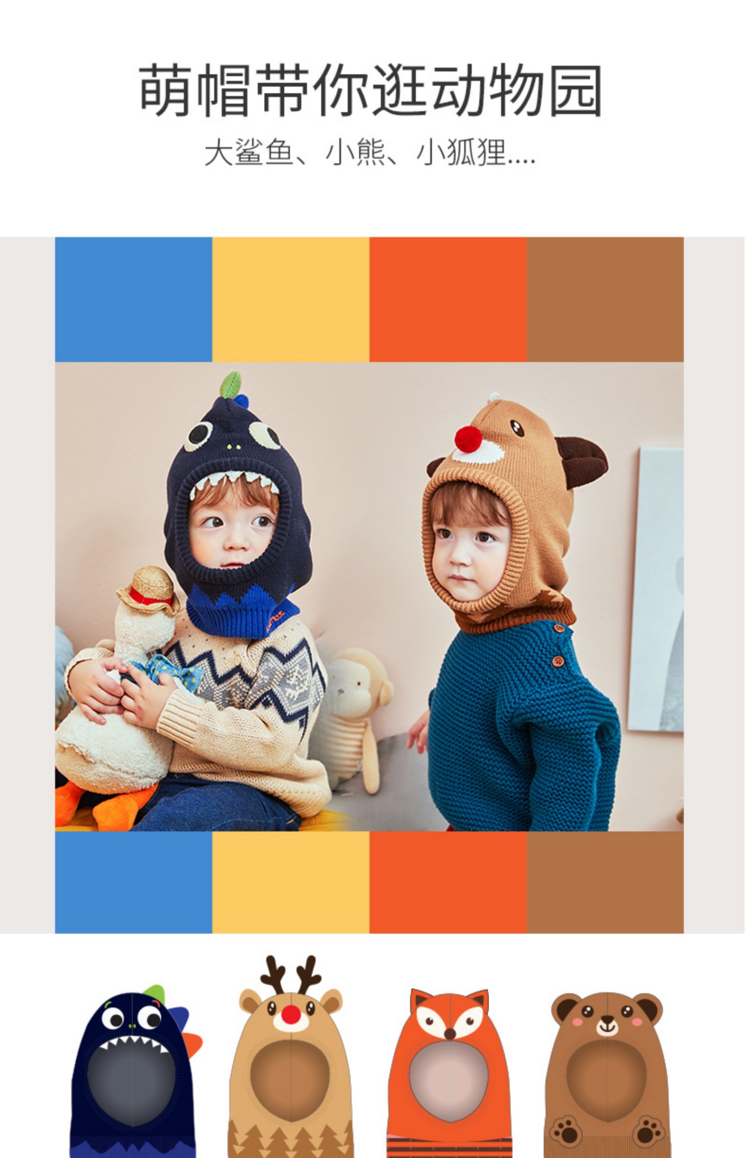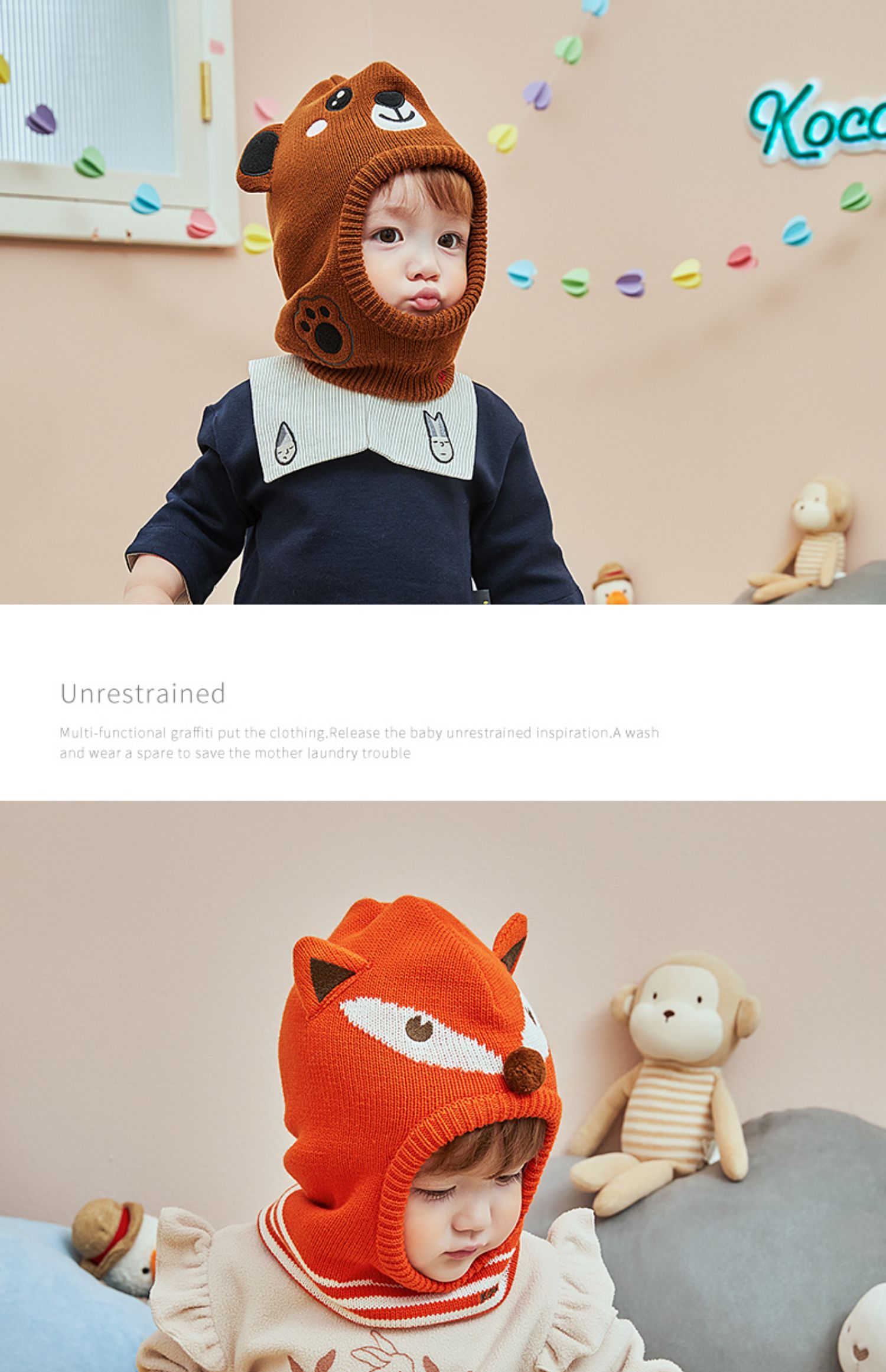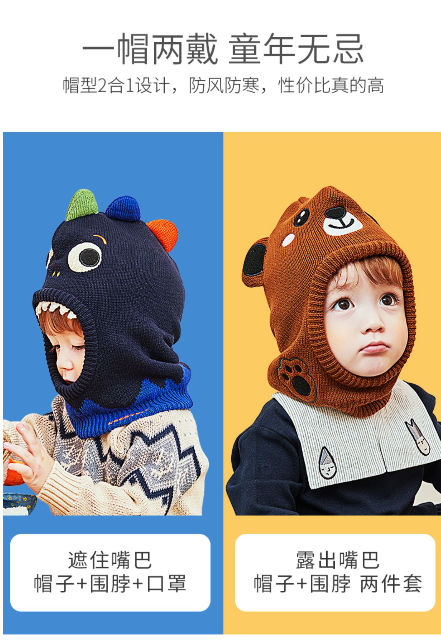 【满2件9折;满3件8.5折】卡通动物一体套头帽,无甲醛无有害物质,A类标注,安全认证,主要妈妈买的安心。保暖卖萌两不误,一帽两戴,不怕买错款,宝贝怎么戴都可爱。