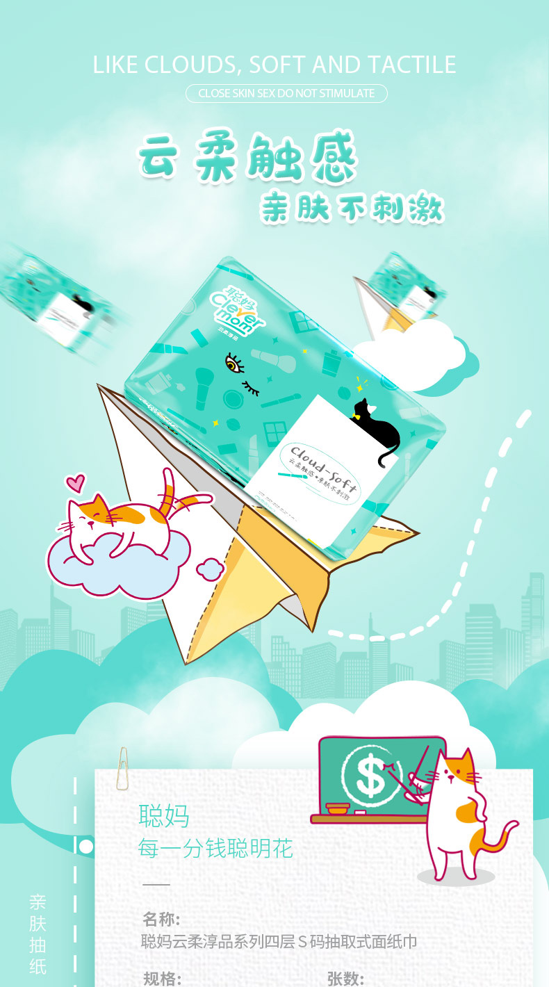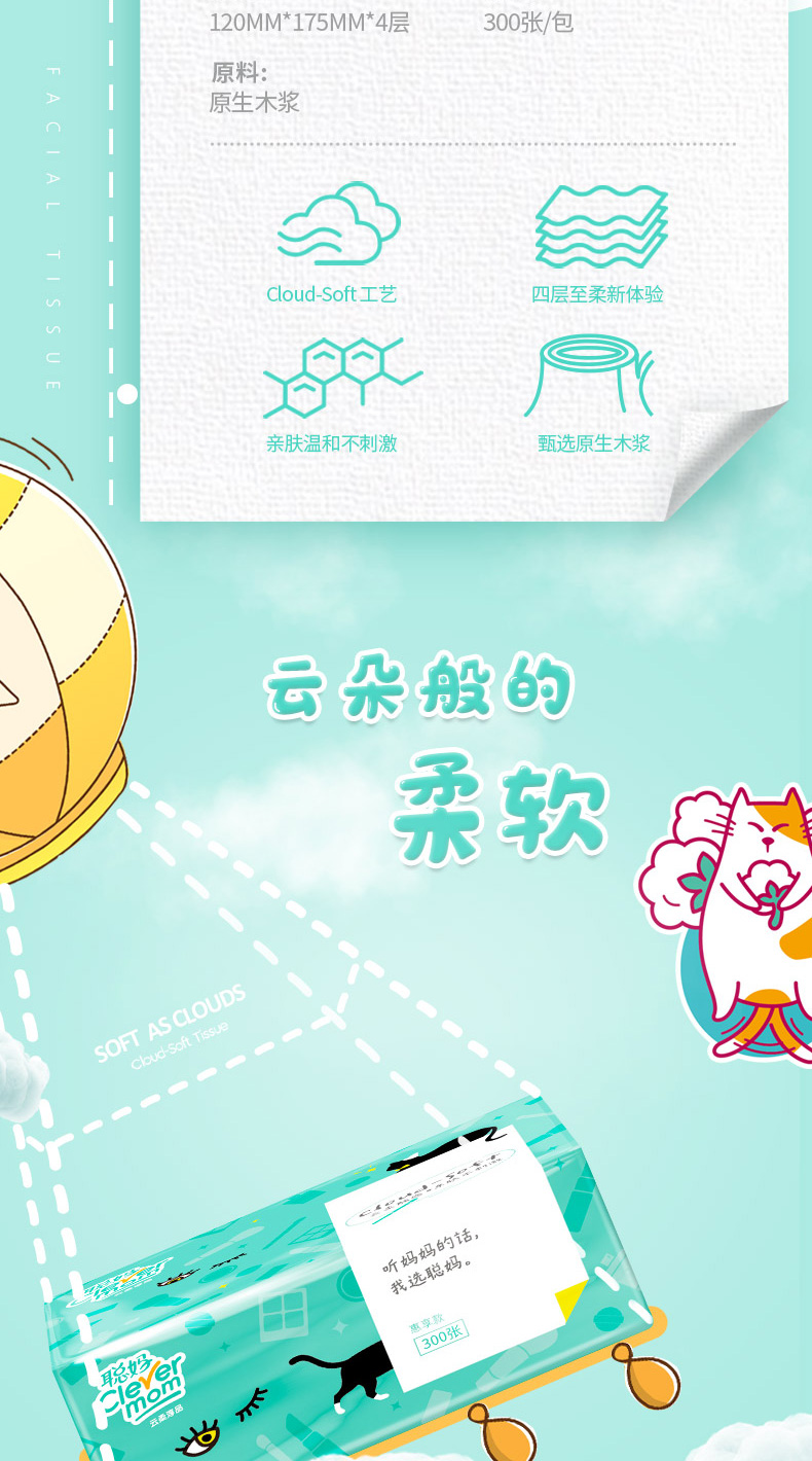 抢【天猫单件包邮款】40包聪妈云柔4层300张抽纸,1包到手价仅7毛钱!原生木浆,4层加大加厚,云柔触感,亲肤不刺激,无添加,不漂白,高品质抽纸,湿水不易破,超划算~