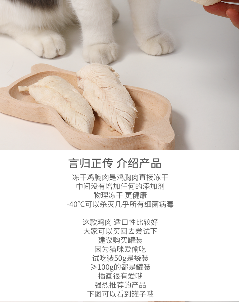 整只新鲜鸡胸肉冻干,急速冷冻,锁住营养,安全卫生无添加,干脆可口,易咀嚼易消化,干湿两吃,营养不流失