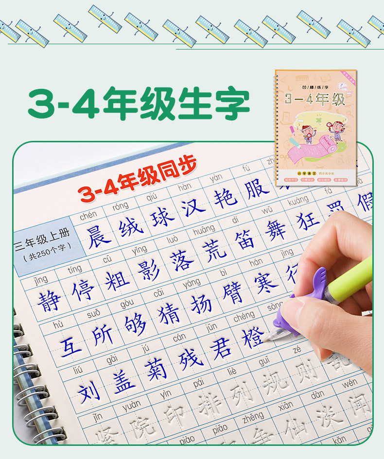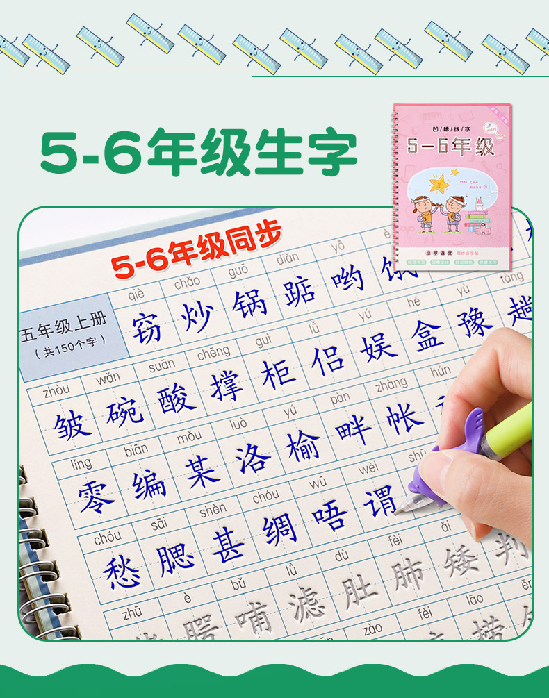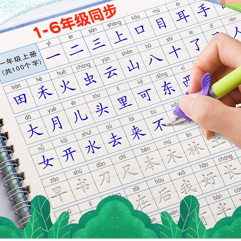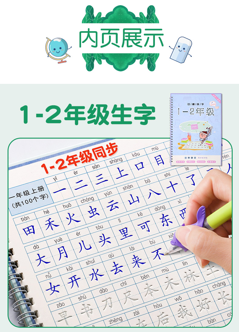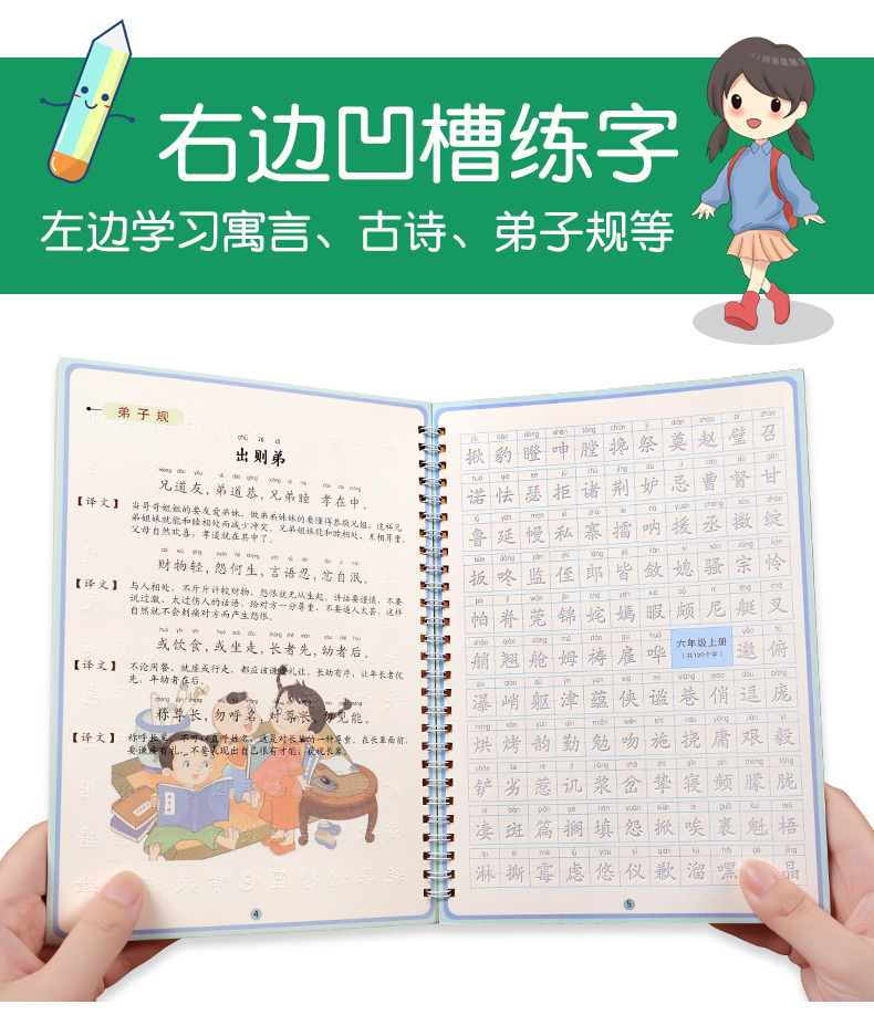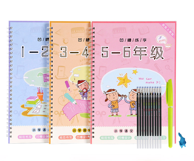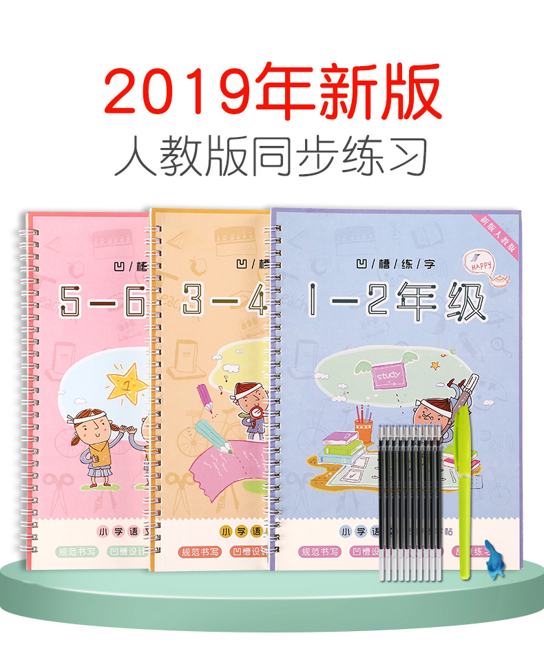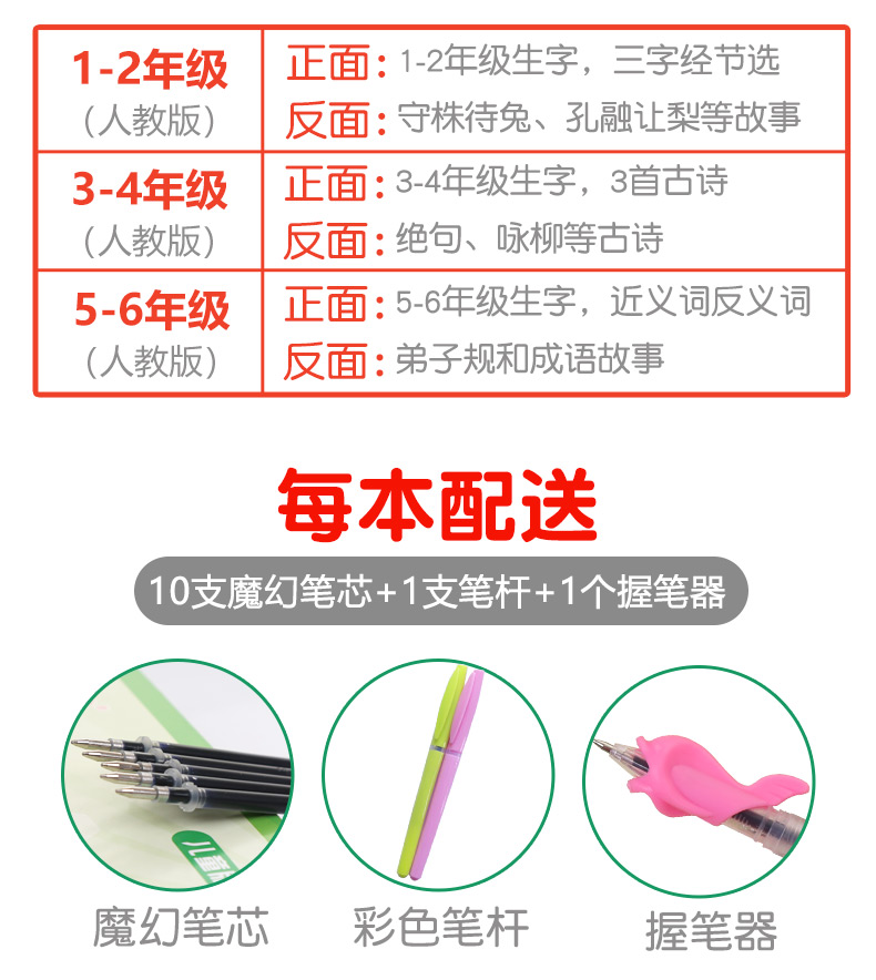 【送10支笔芯+1支笔杆+1个握笔器】1到6年级同步练字帖!纸张厚实,立体凹槽,环圈装订,正面生字,反面故事,专用笔芯出水流畅,字迹自动消失,可反复使用。为孩子的学习成长做好准备!【七天无理由退换】