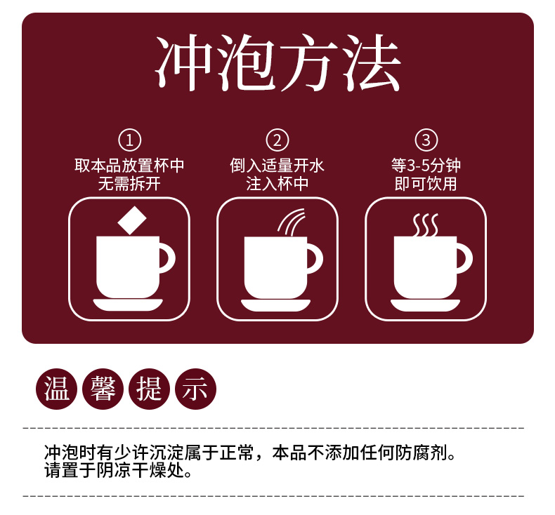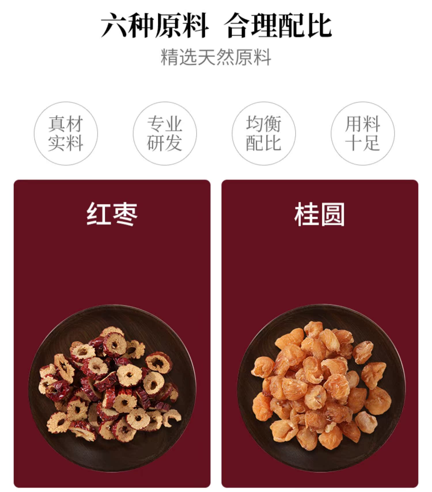 三种原料科学配比,真材实料营养更足,无核桂圆肉,果肉饱满甜而不腻,宁夏枸杞颗颗精选口感清甜,无核枣片香甜可口。独立包装便携冲泡,每日一袋喝出健康好气色!【赠运费险】