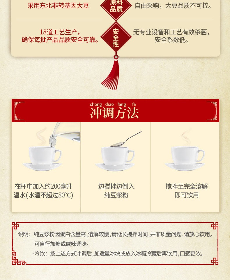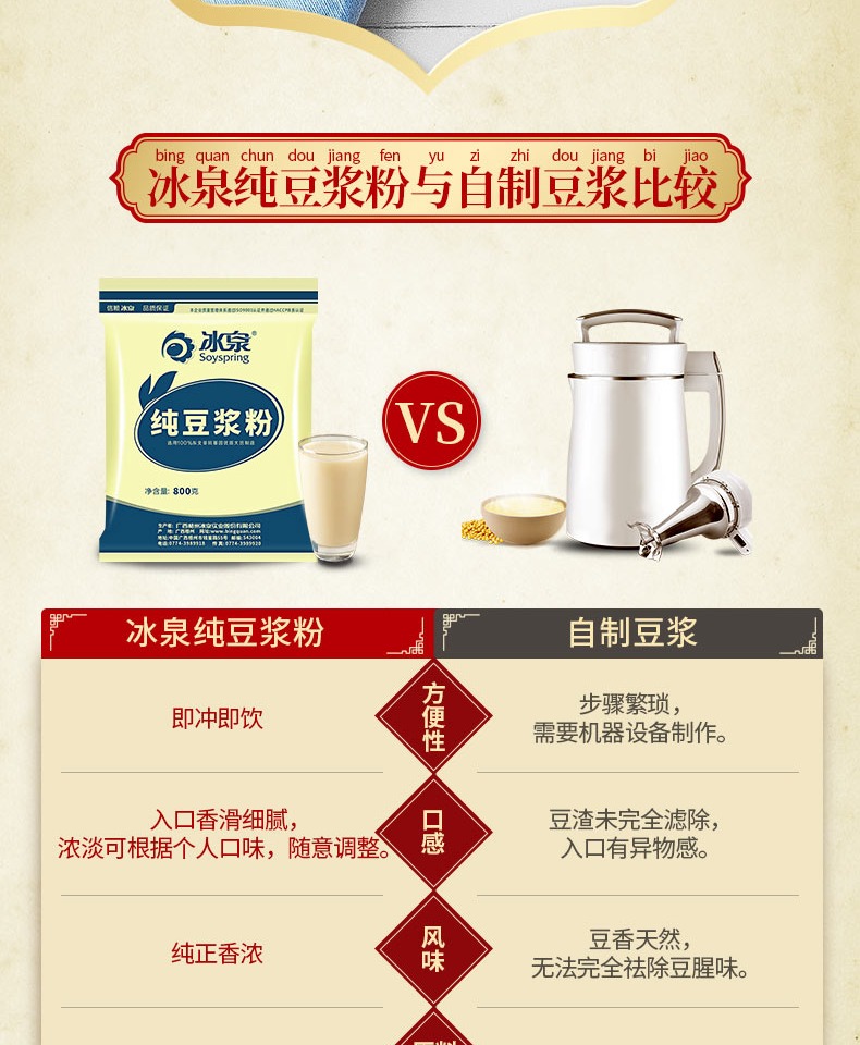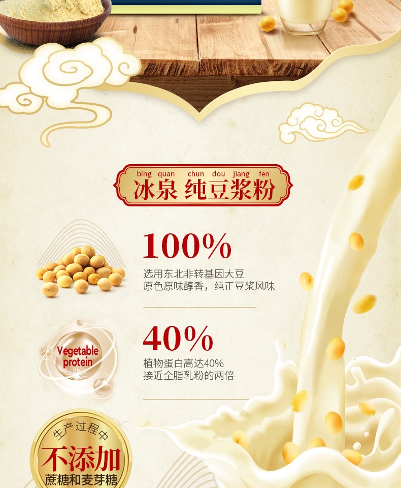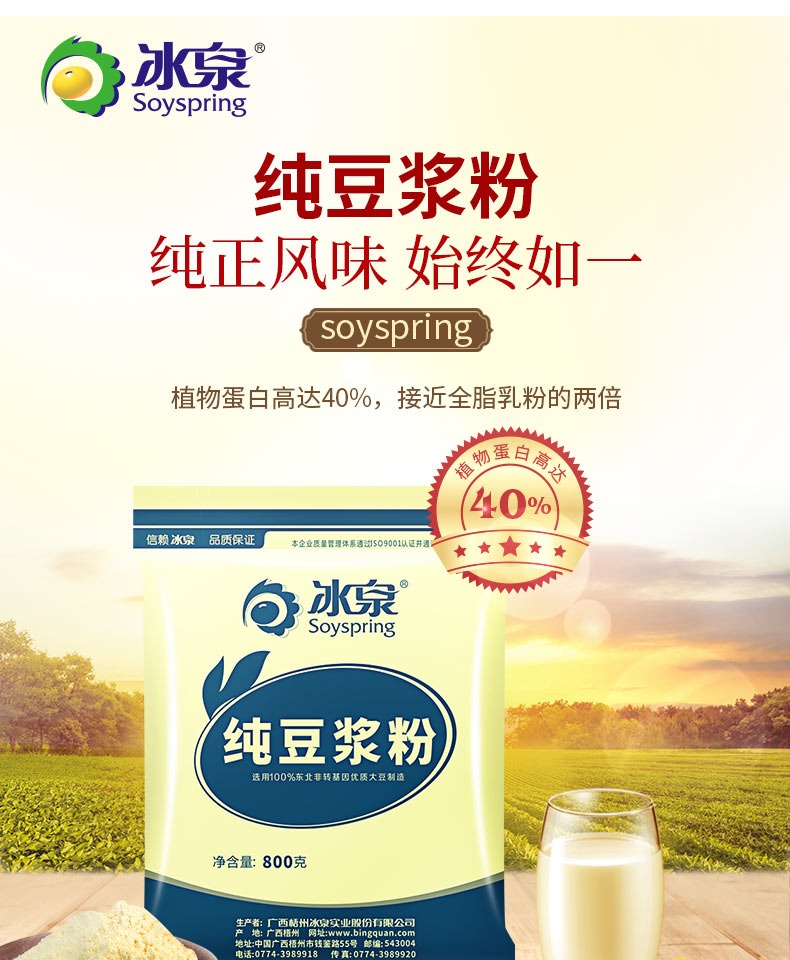 蛋白质含量40克,1杯冰泉纯豆浆的蛋白质含量超过1个70克的鸡蛋,在黑龙江拥有大豆生产基地,全部采用非转基因大豆,18道工序物理制造而成,无化学添加。
