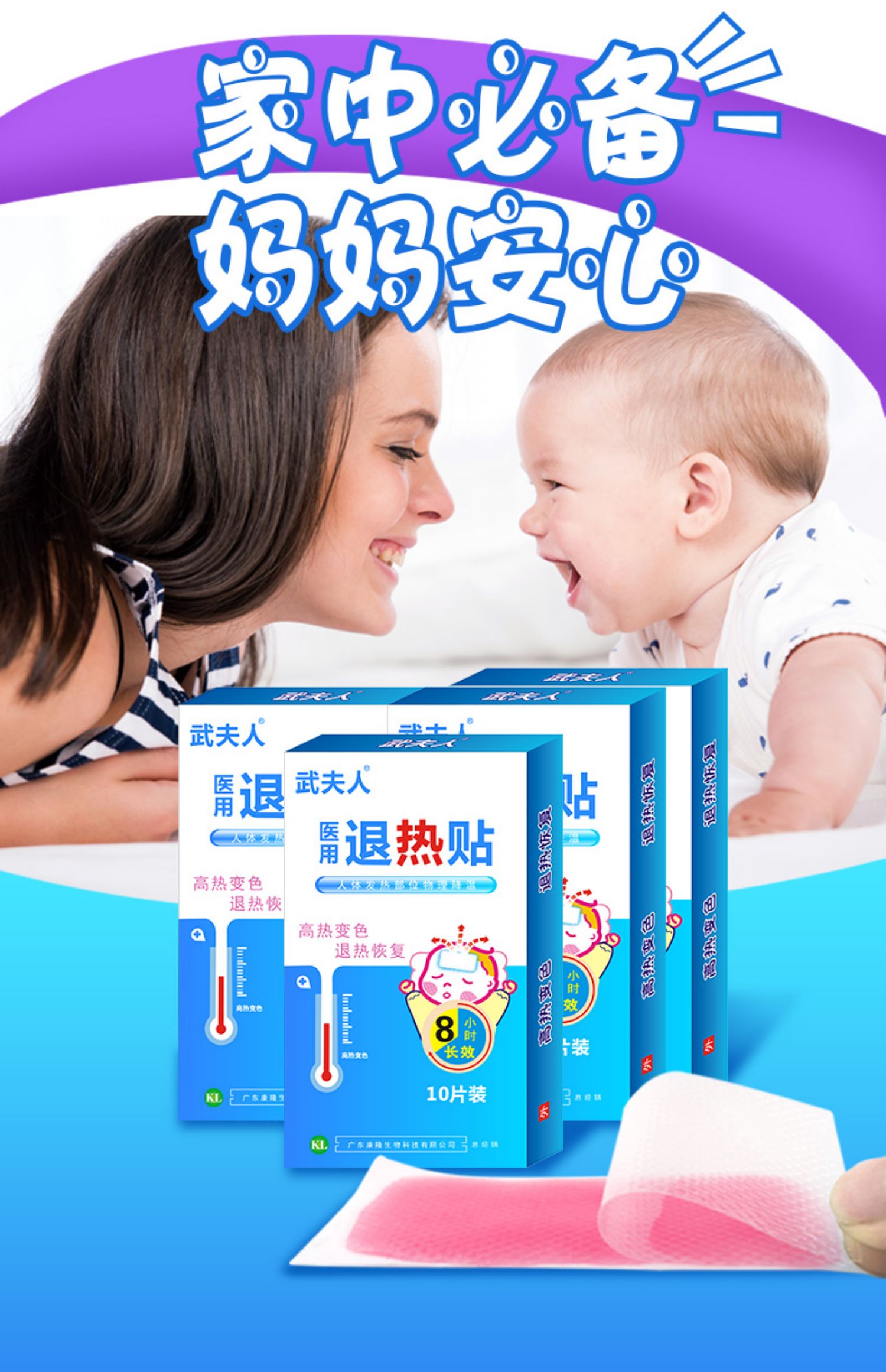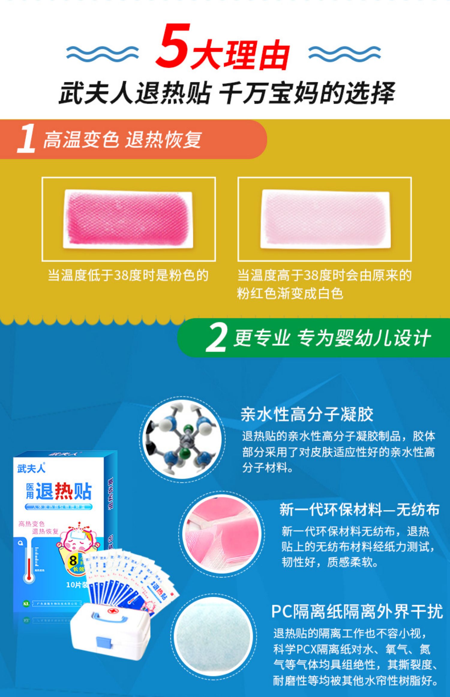 药监局备案!人难免会感冒发烧,武夫人医用退热贴,高温变色,退烧恢复!物理降温,退烧退热,融合TDDS技术、薄荷提取物、亲水性高分子凝胶,双效冷却!成人儿童均可用,每个家庭放心的选择!