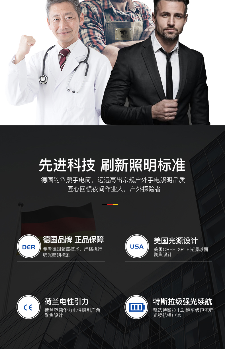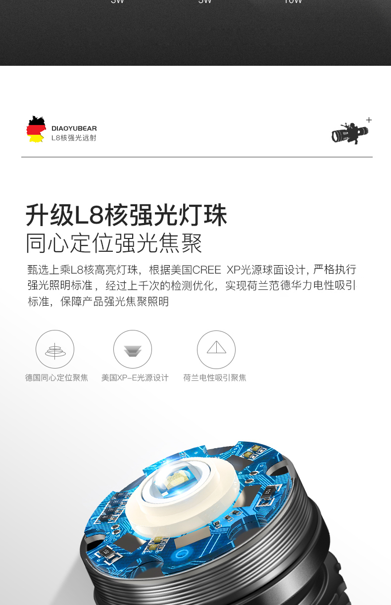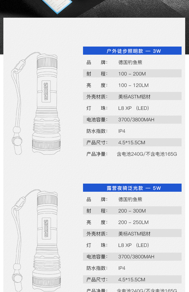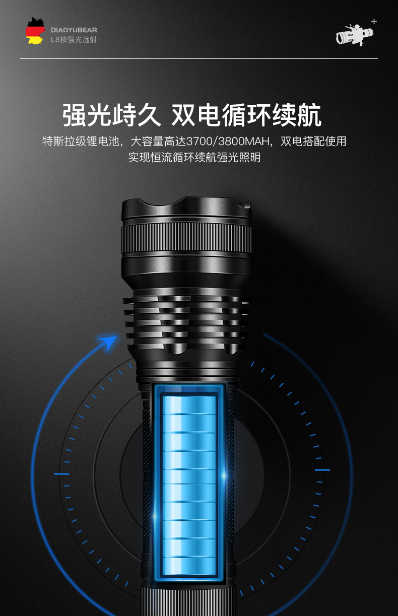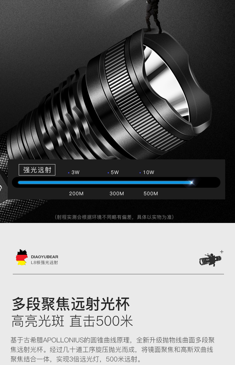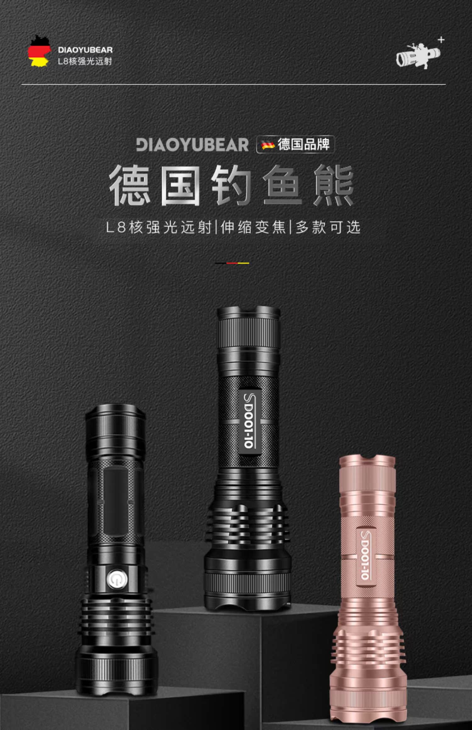 【德国钓鱼熊户外天猫手电筒销售第1名】6w+消费者好评,品质值得信赖!L8核强光远射,3倍远光灯,直射500m!电池可充电两用,4种照明模式,,多用途,外出居家必备,送原装充电线+电池+挂绳!【赠运费