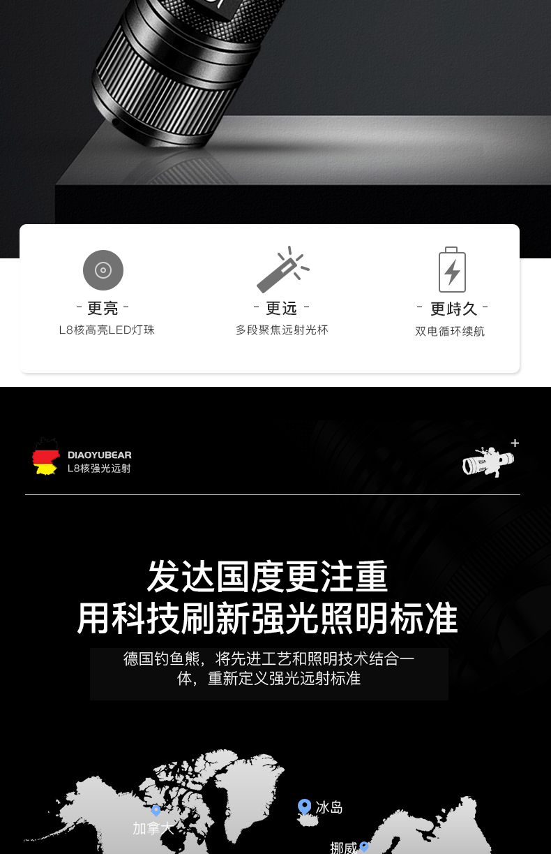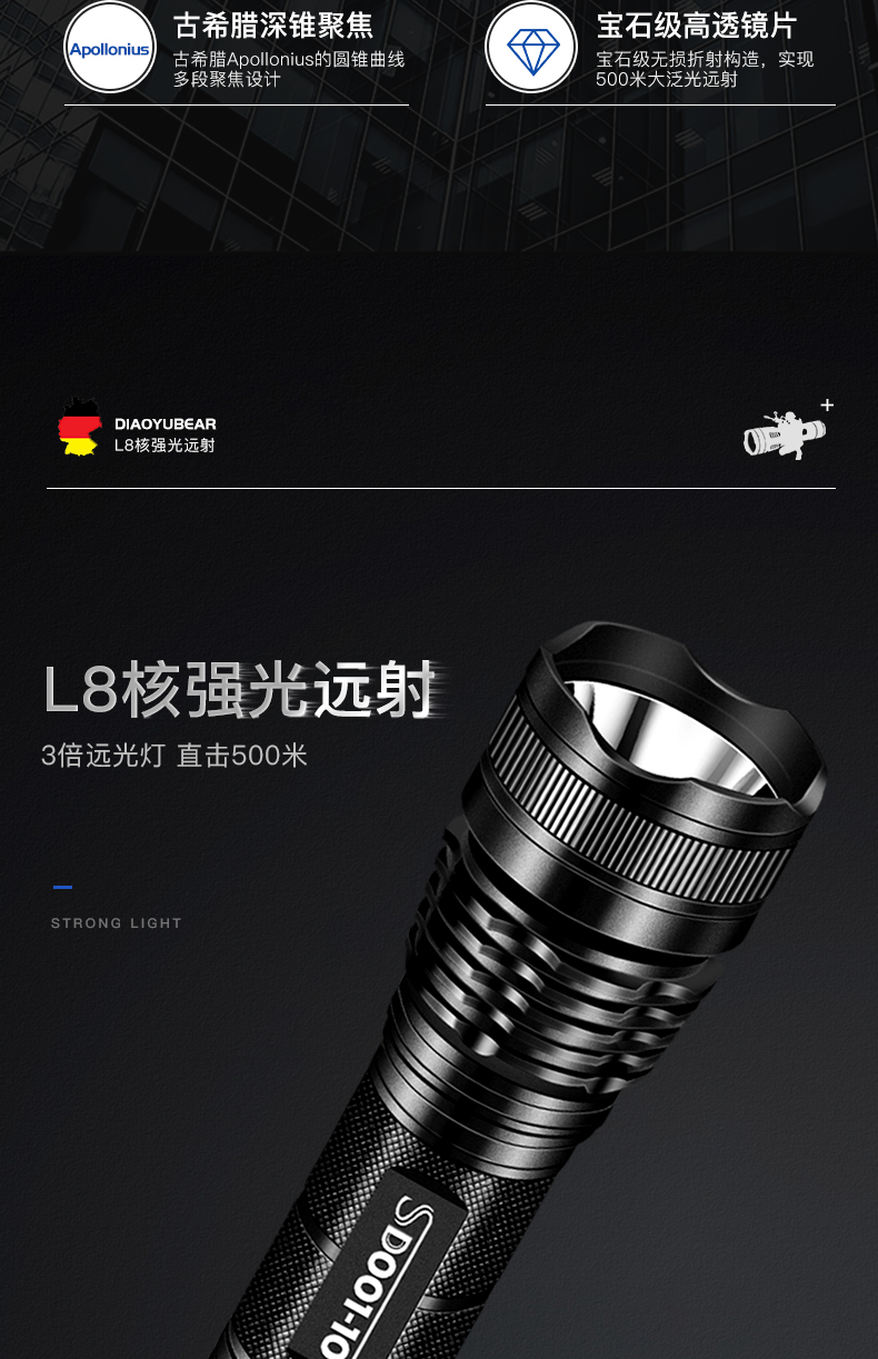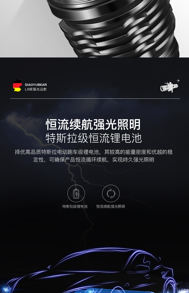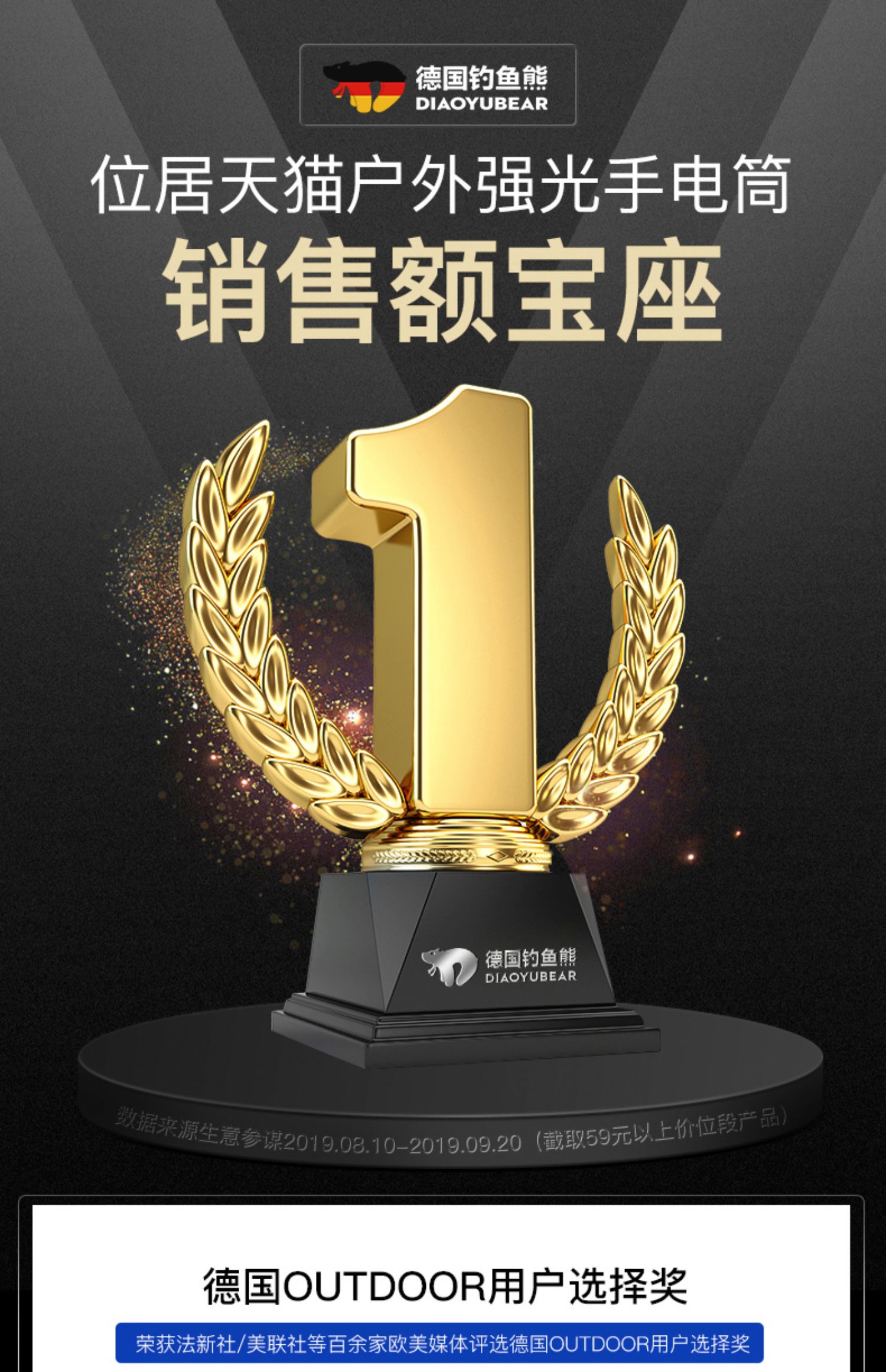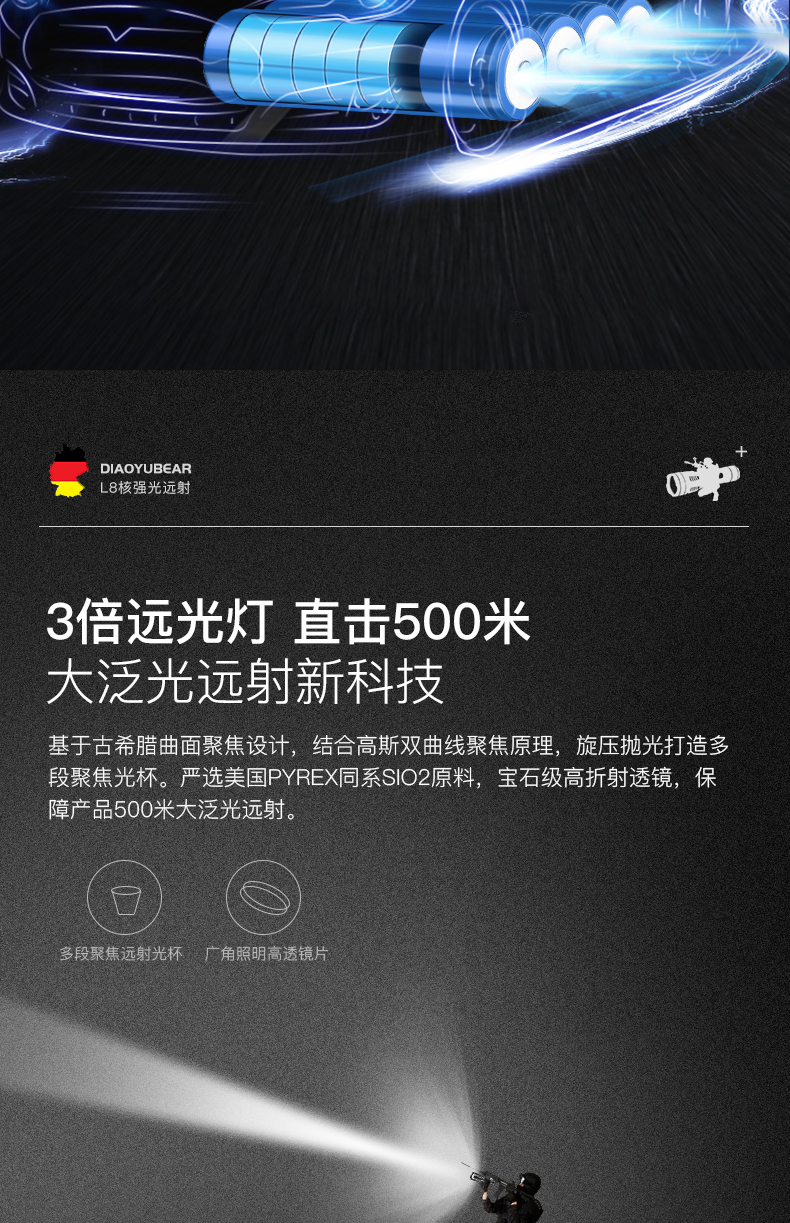 【德国钓鱼熊户外天猫手电筒销售第1名】6w+消费者好评,品质值得信赖!L8核强光远射,3倍远光灯,直射500m!电池可充电两用,4种照明模式,,多用途,外出居家必备,送原装充电线+电池+挂绳!【赠运费