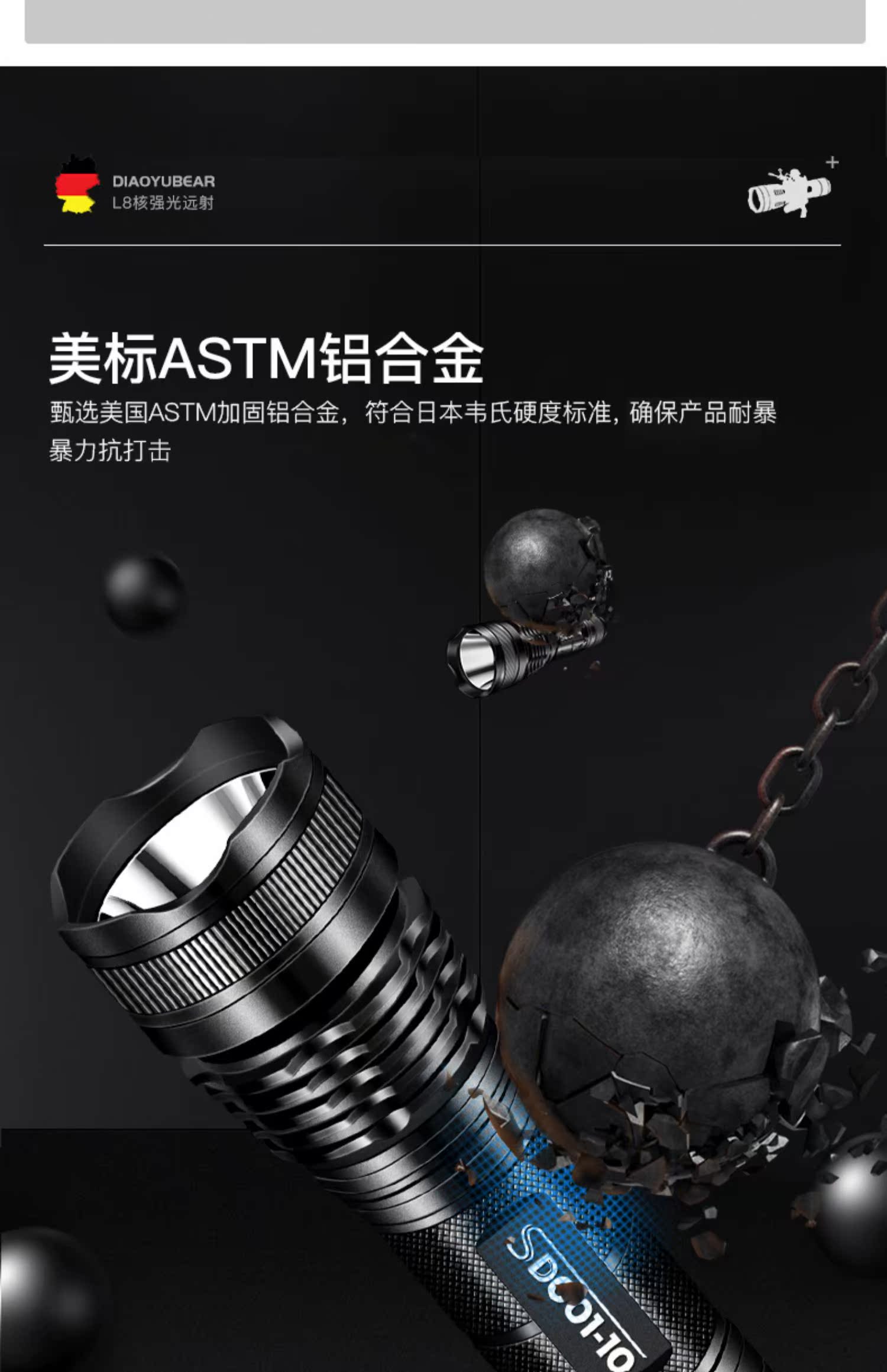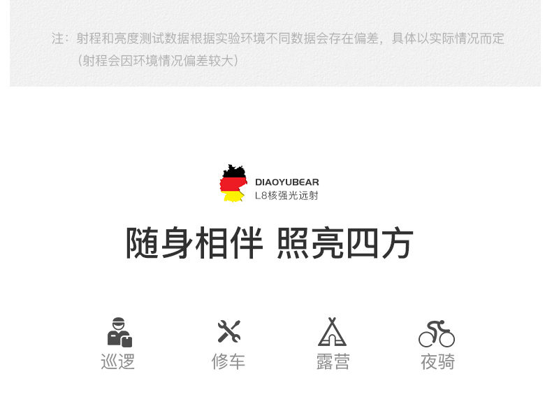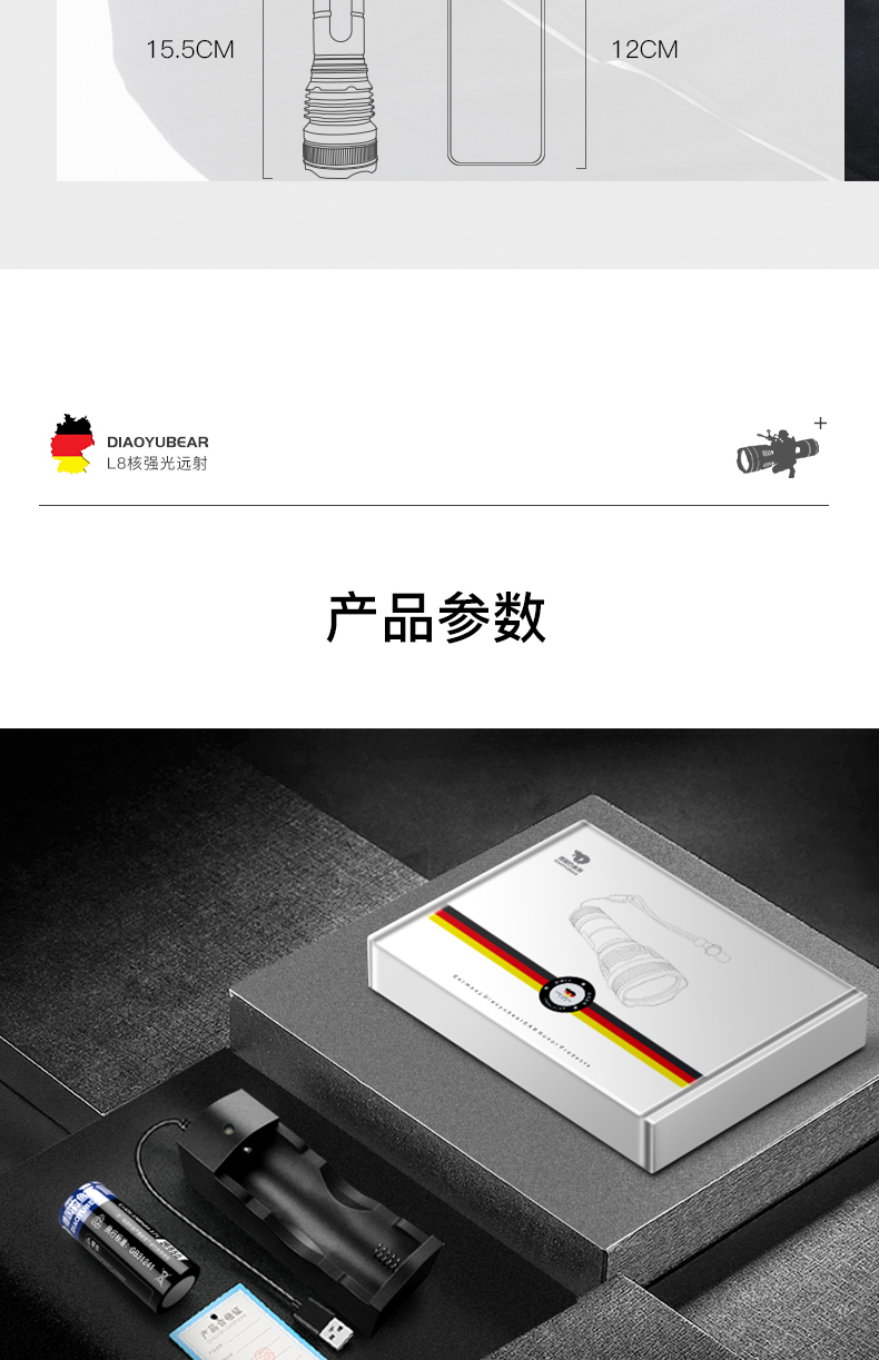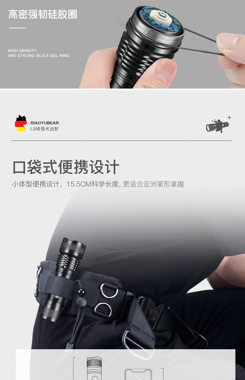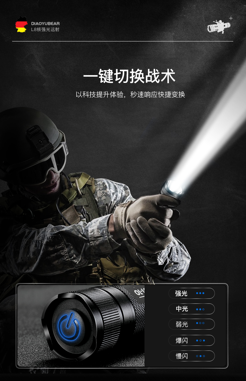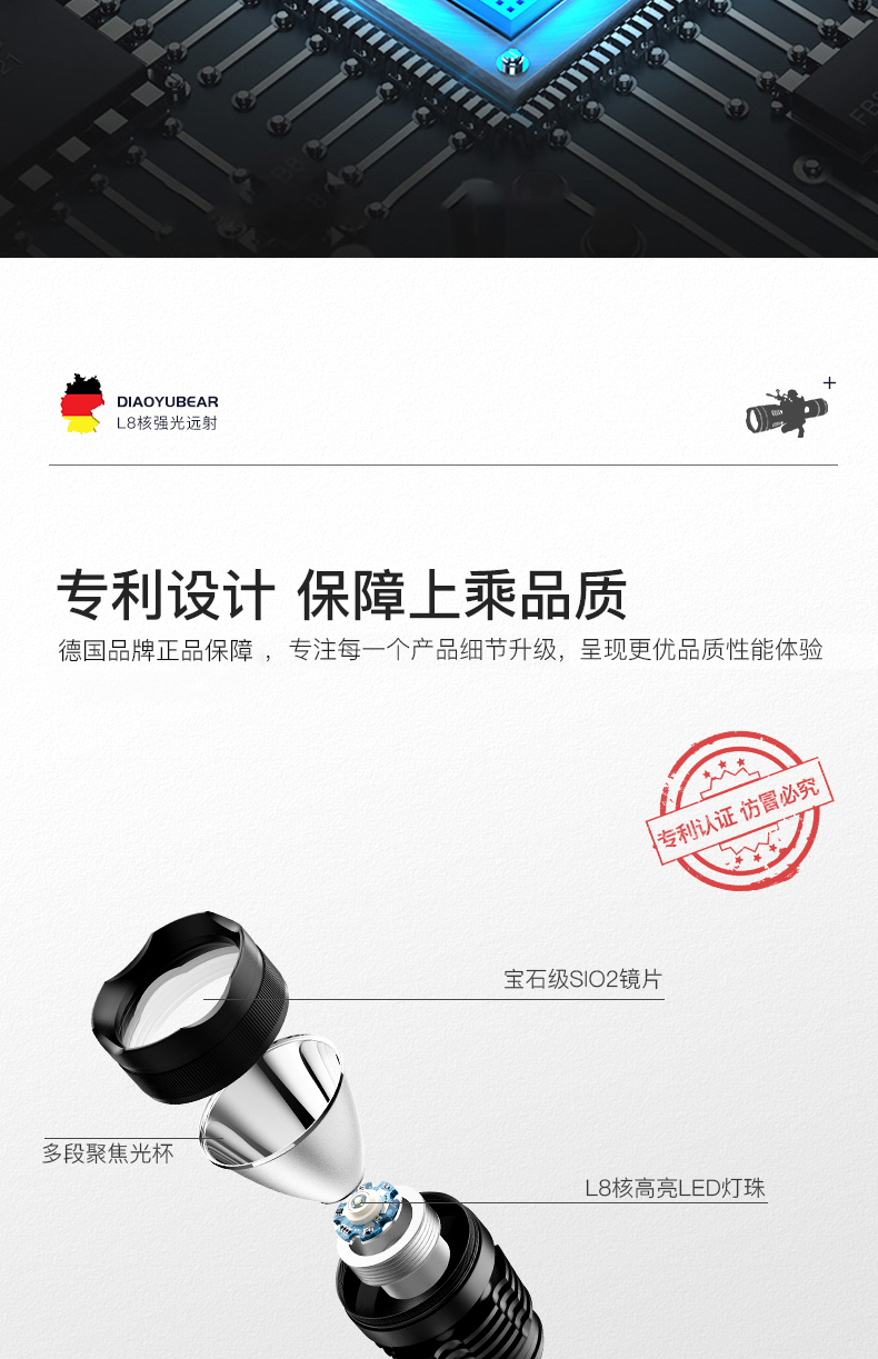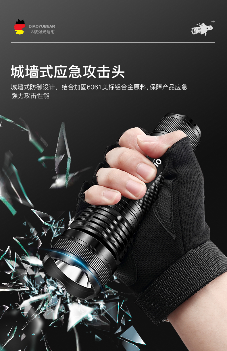 【德国钓鱼熊户外天猫手电筒销售第1名】6w+消费者好评,品质值得信赖!L8核强光远射,3倍远光灯,直射500m!电池可充电两用,4种照明模式,,多用途,外出居家必备,送原装充电线+电池+挂绳!【赠运费