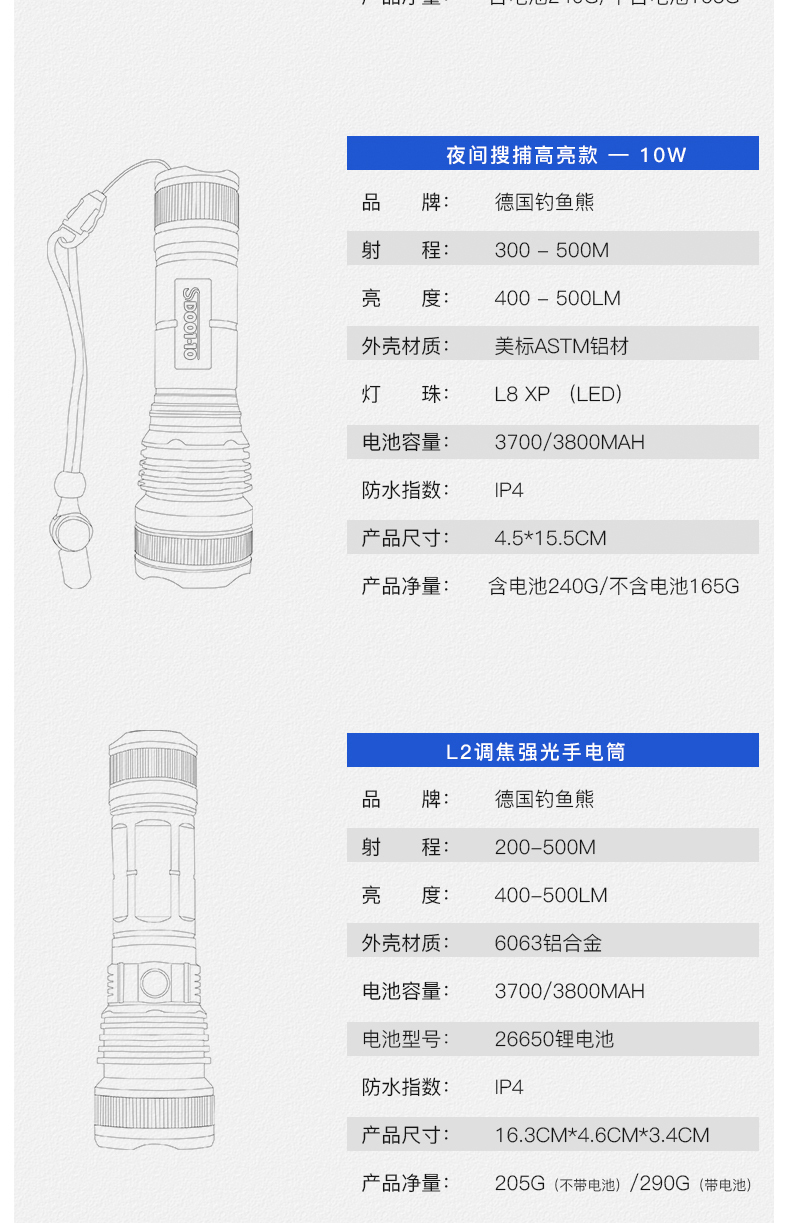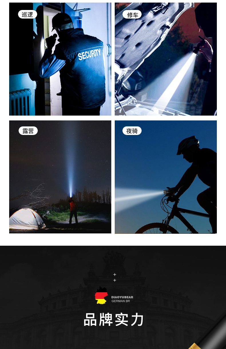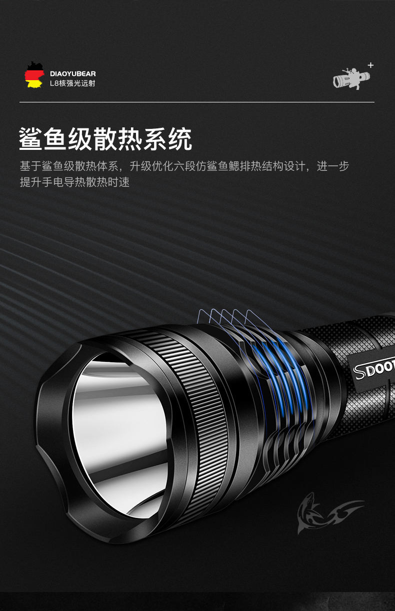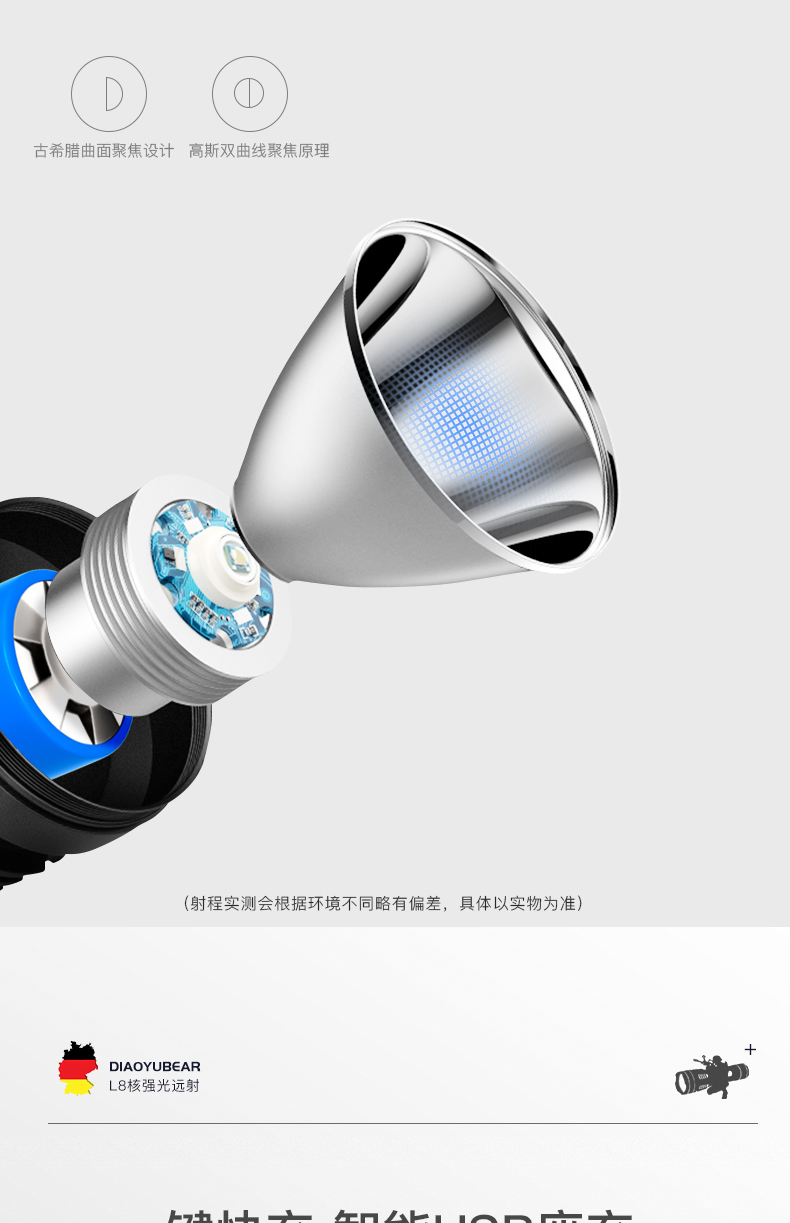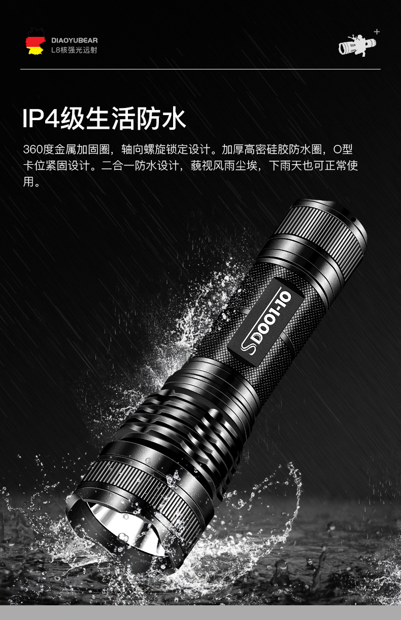 【德国钓鱼熊户外天猫手电筒销售第1名】6w+消费者好评,品质值得信赖!L8核强光远射,3倍远光灯,直射500m!电池可充电两用,4种照明模式,,多用途,外出居家必备,送原装充电线+电池+挂绳!【赠运费
