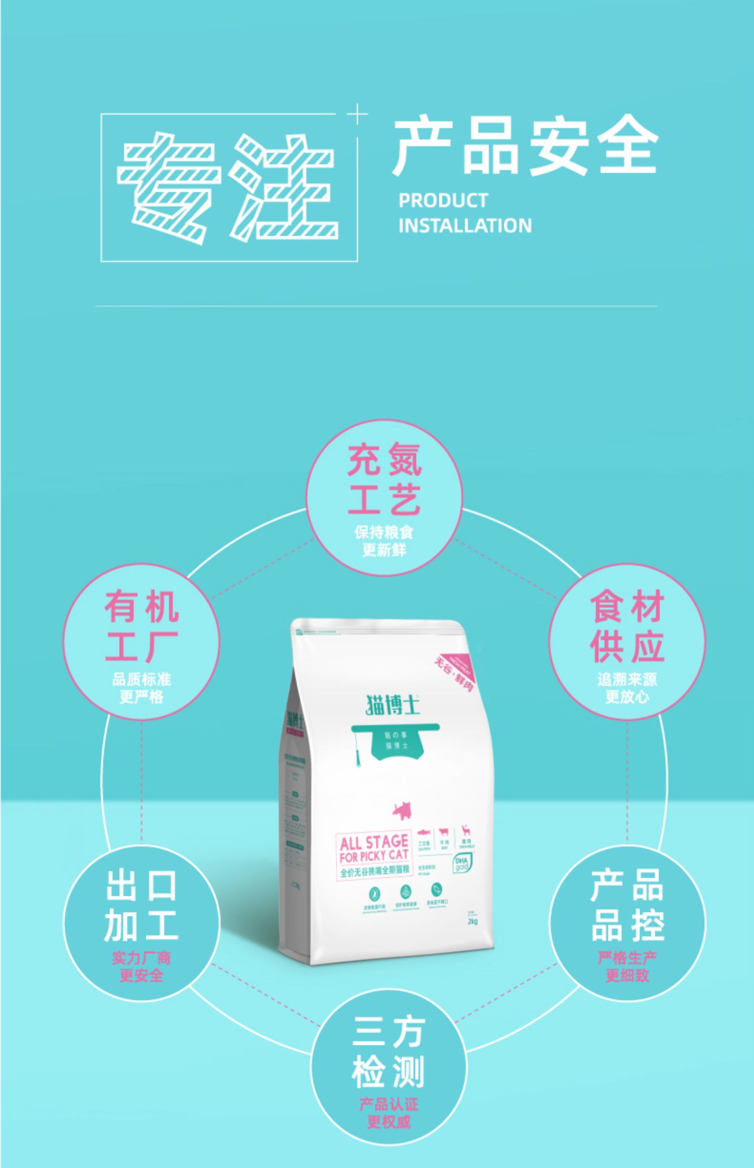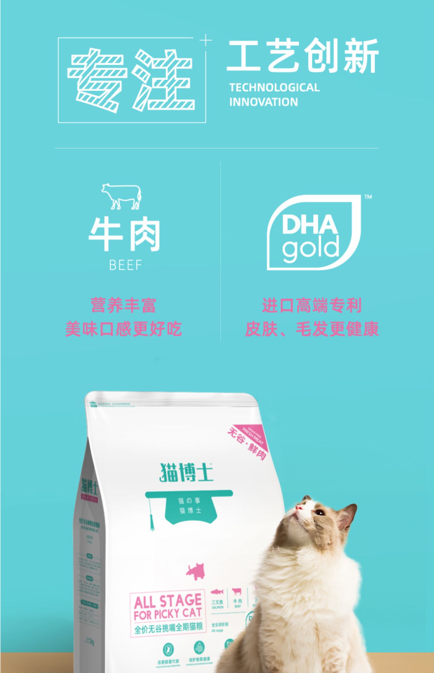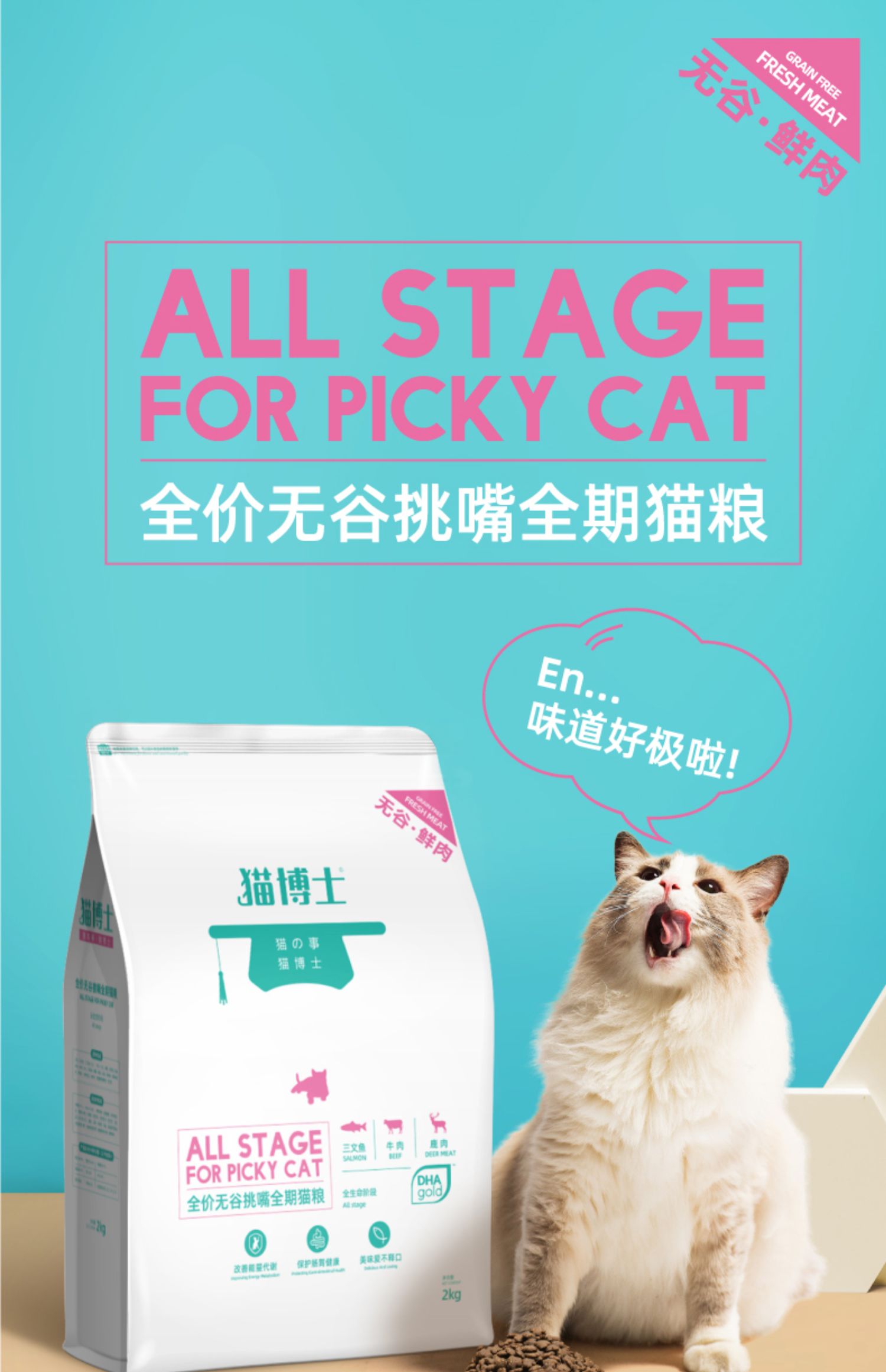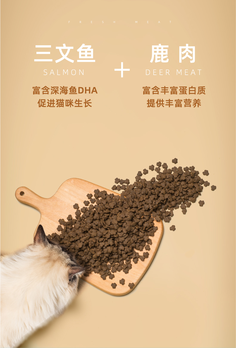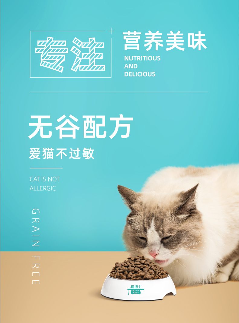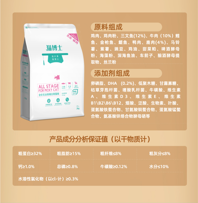 猫博士自家有机工厂,配料表前9位都是鲜肉,真无谷,爱猫不过敏!真添加DHA原料(进口高端专利),拒绝挑嘴,增强免疫,促进生长