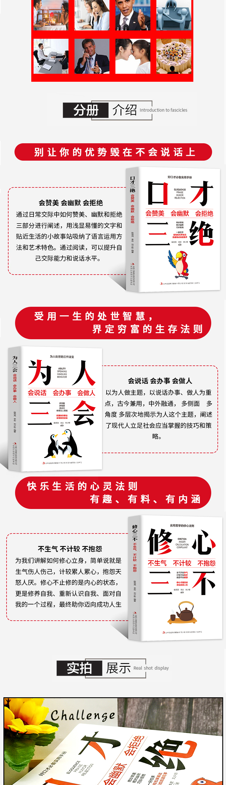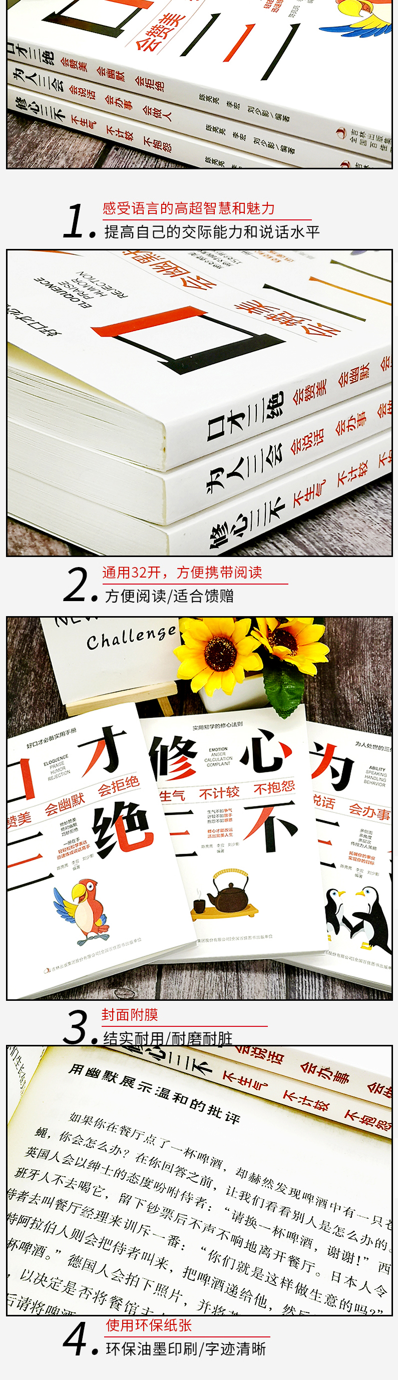 抖音热门爆款书籍,修心三不+口才三绝+为人三会青春励志书籍。口才三绝:会赞美,会幽默,会拒绝;修心三不:你生气,不计较,不抱怨;为人三会:会说话,会办事,会做人,熬夜也要读完这3本书。