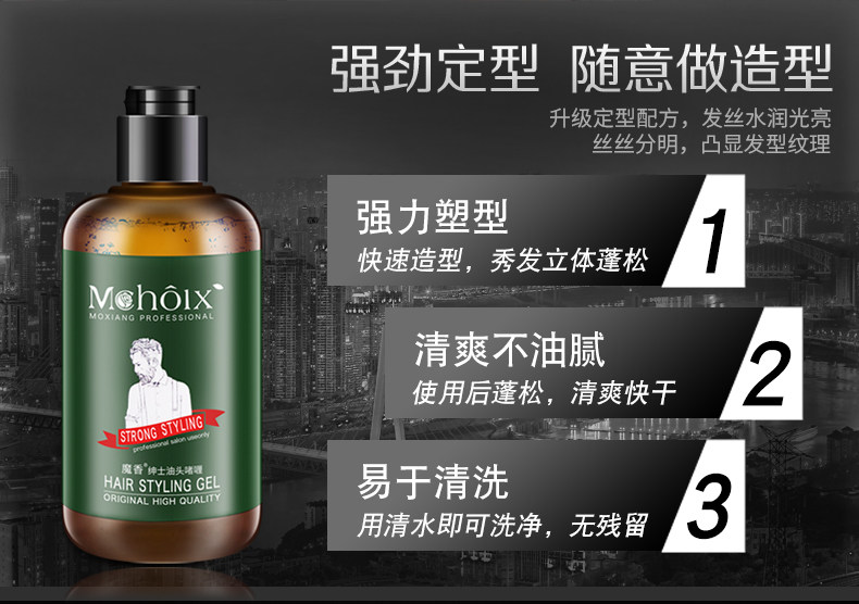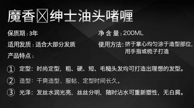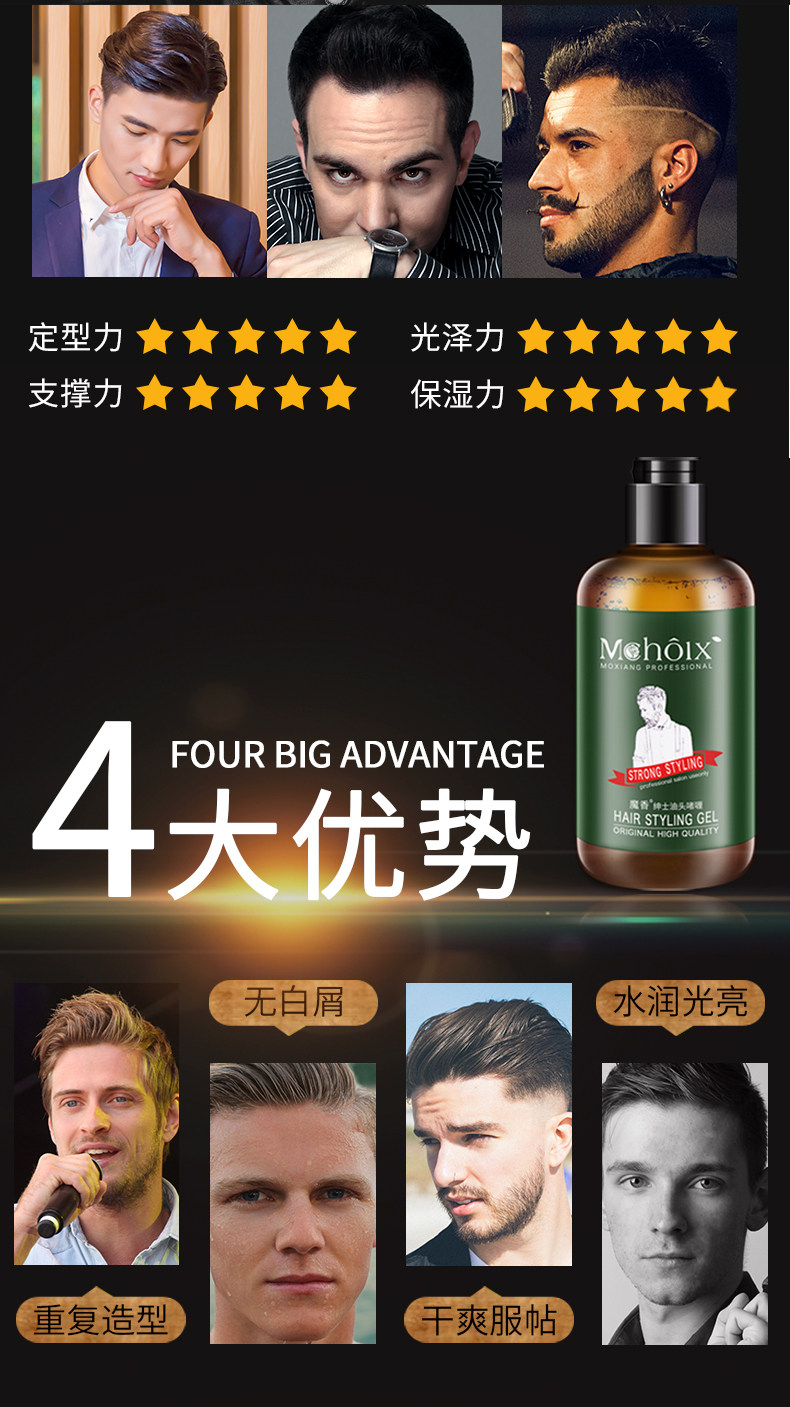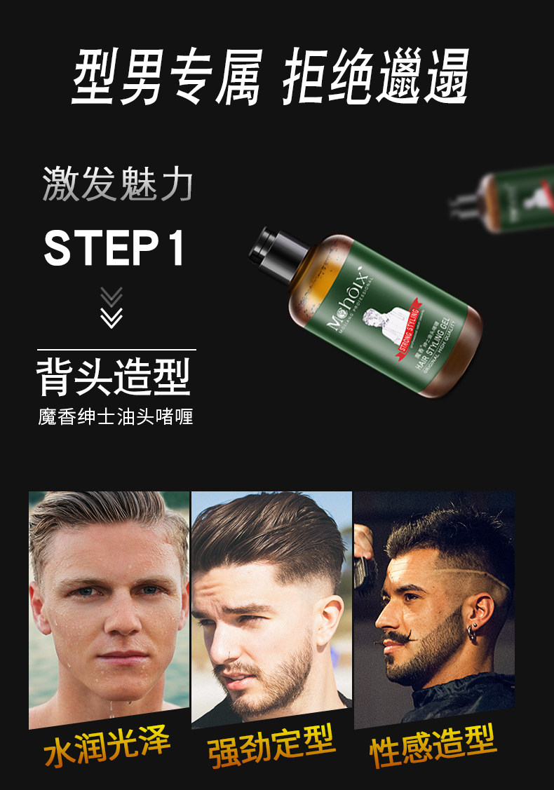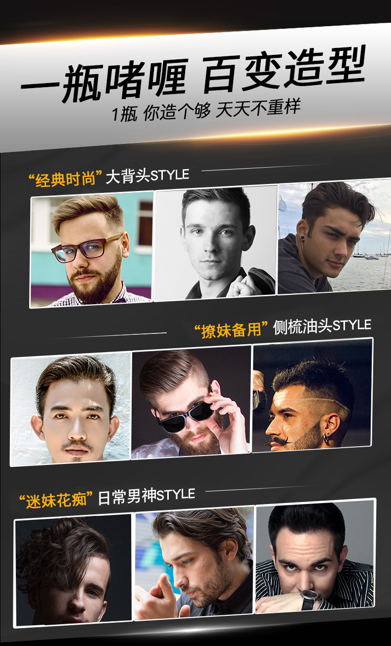 可塑性高,强劲定型,时尚金属光泽,不怕出汗,随意做造型,帅哥与土鳖之间,仅有一个发型的差距!!
