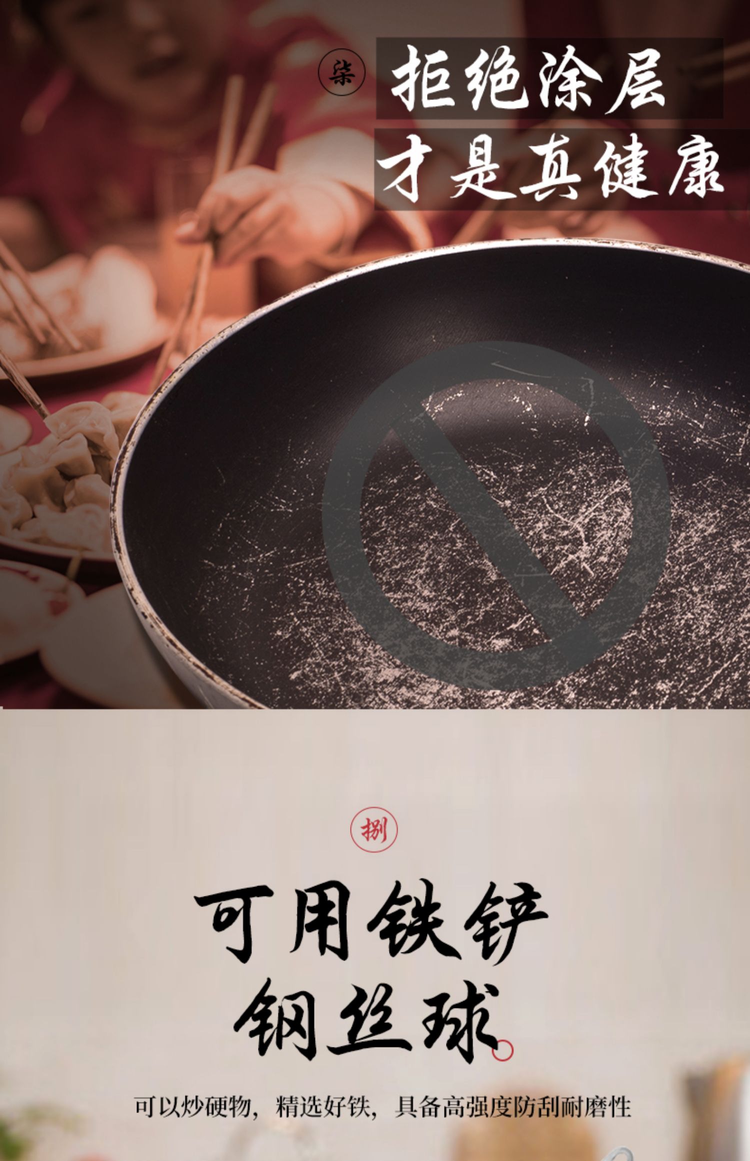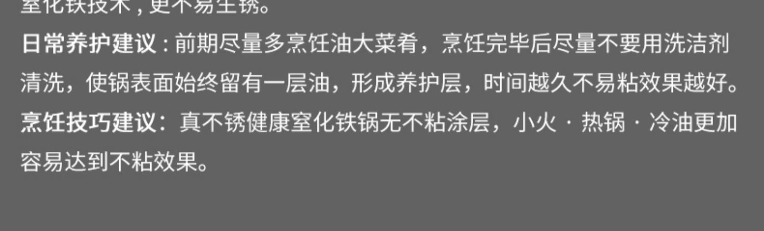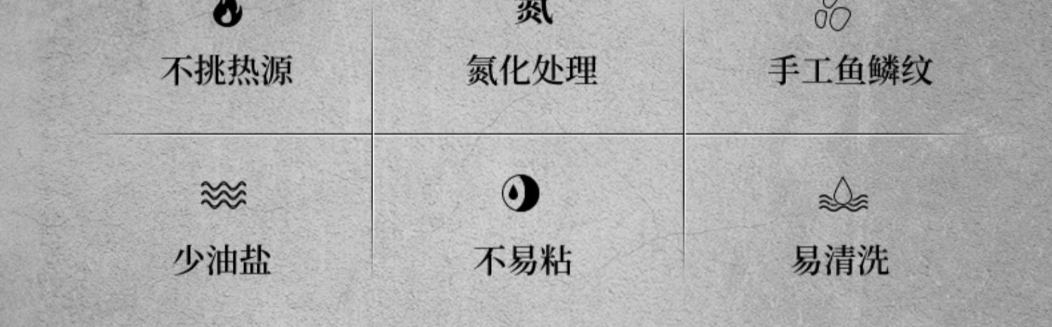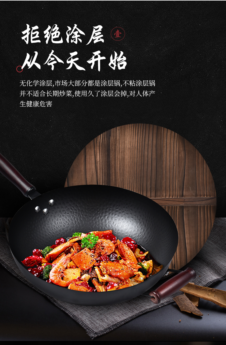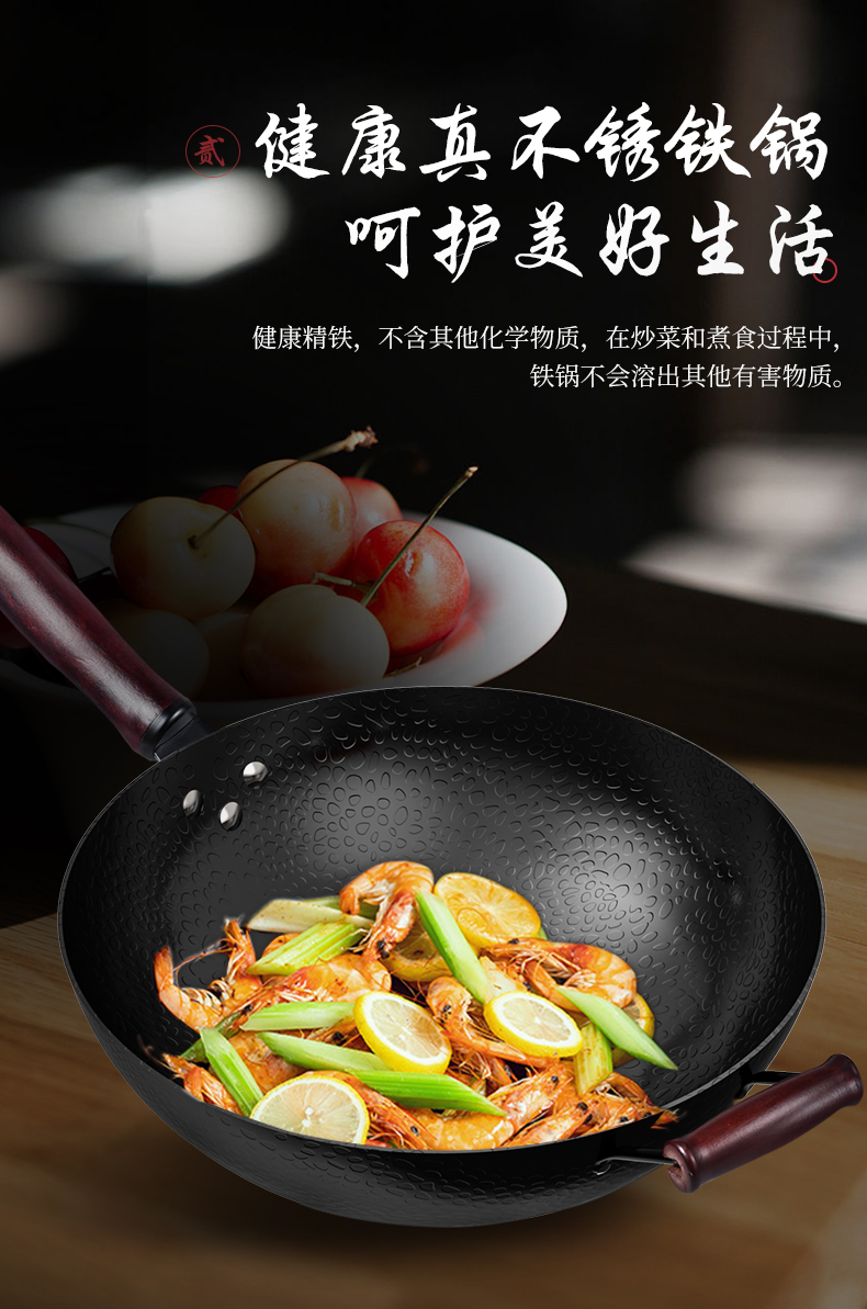 精选优质生铁铸造成型,拒绝涂层健康补铁,不生锈不易粘,健康少油烟,铁铲随便翻,让爆炒更痛快!电磁炉燃气灶通用哦