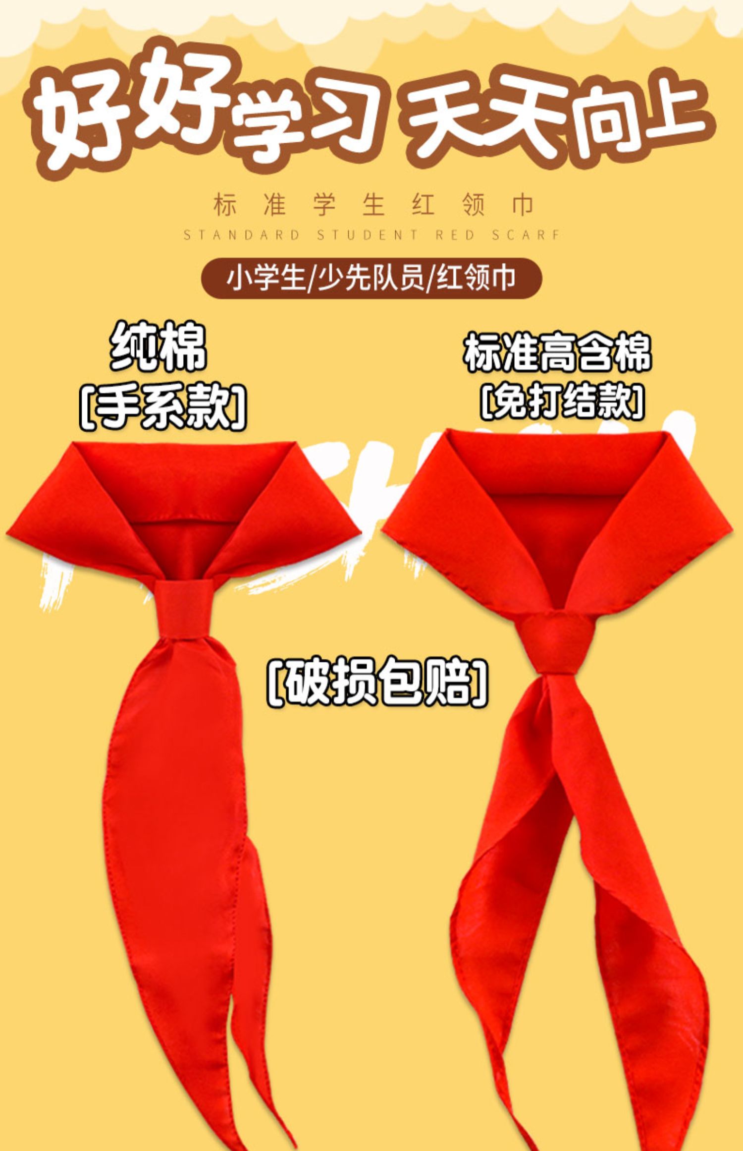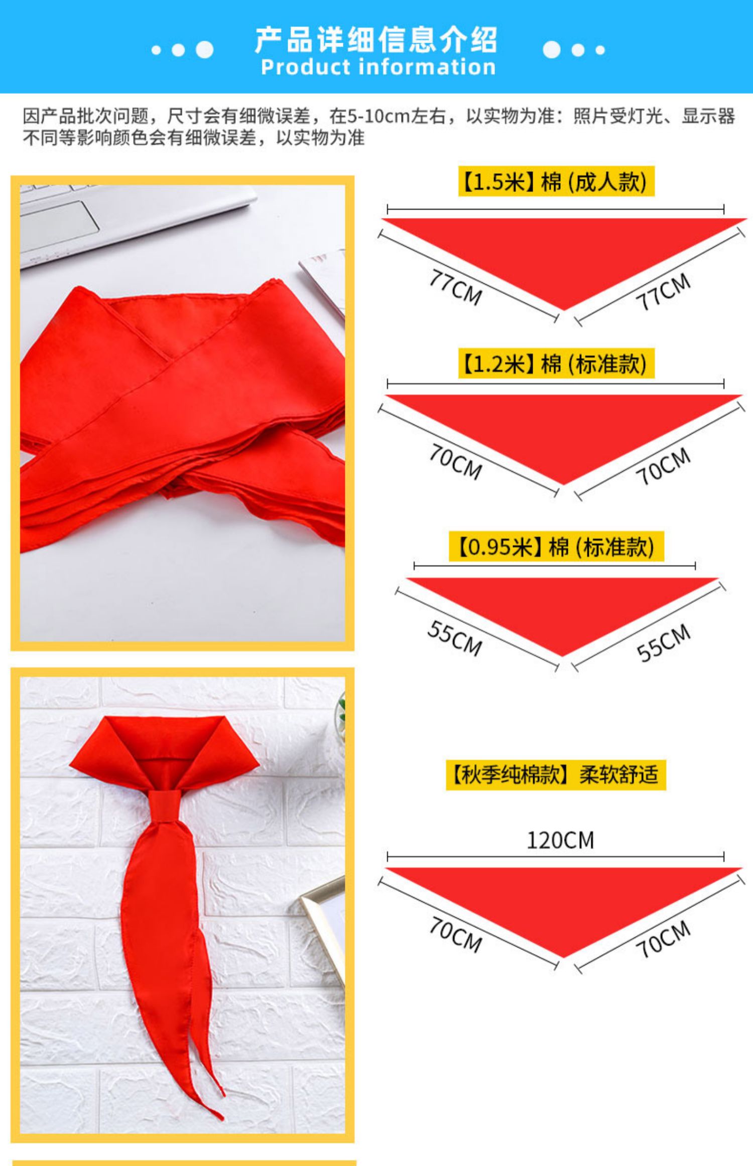纯棉,免打结,水洗不褪色,专业机构检查合格,标准红领巾1.2米,小学生少先队员使用,超值!限量!