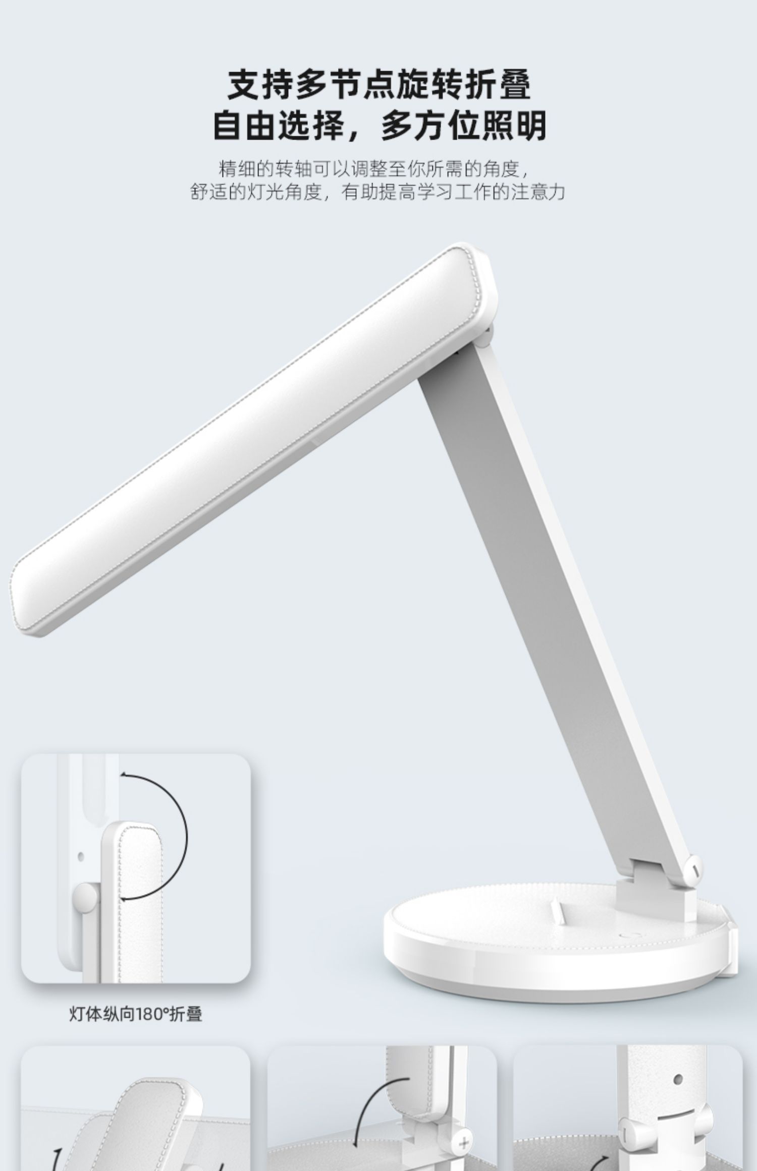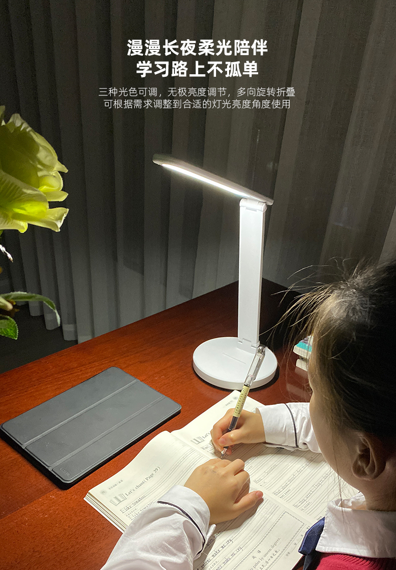 多向调节,折叠设计可随身携带,三种光色,无极调光,光源柔和,给孩子,工作的自己买一个吧,在漫漫长夜时柔光陪伴,学习工作路上与你相伴~