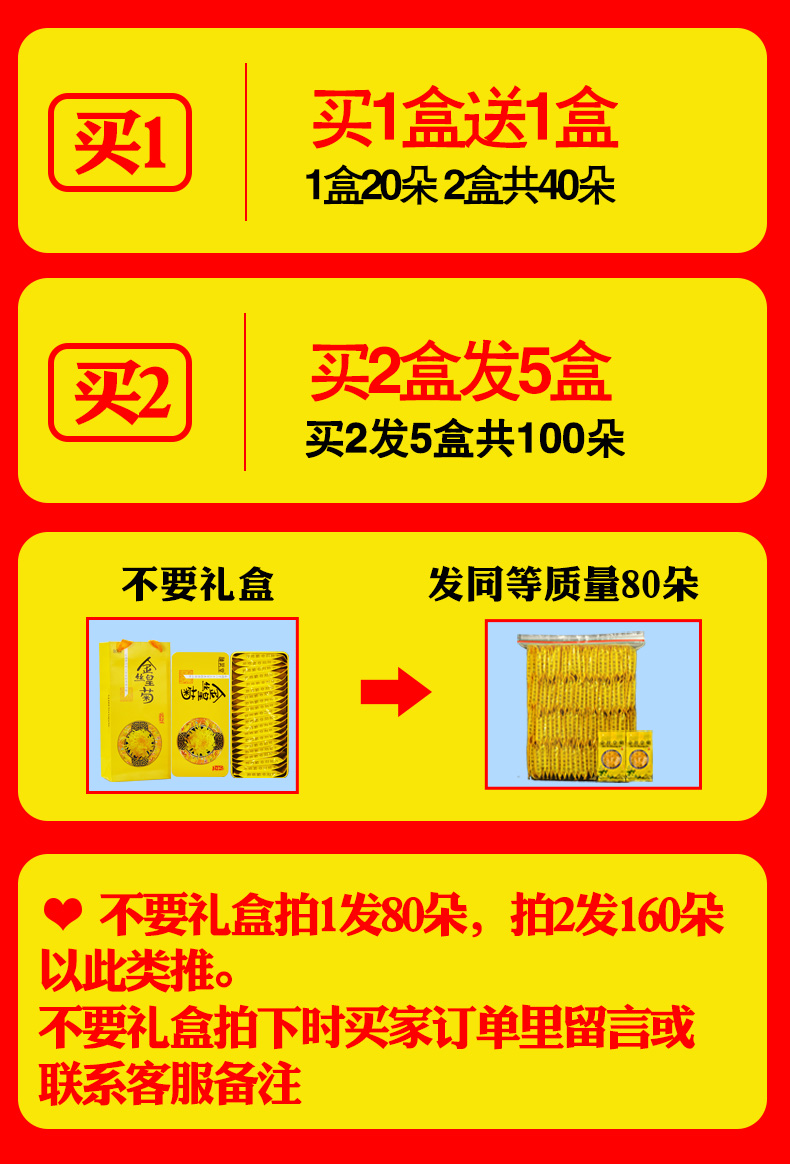 不要礼盒发100朵!要礼盒买1送1!共发2盒!一朵一杯大菊花,炭火烘培,金黄个大,干净整洁,好花源自好原料,一杯贡菊,释放您的压力【赠运费险】