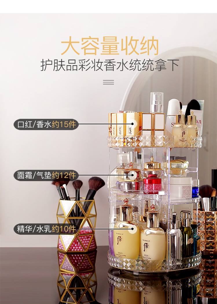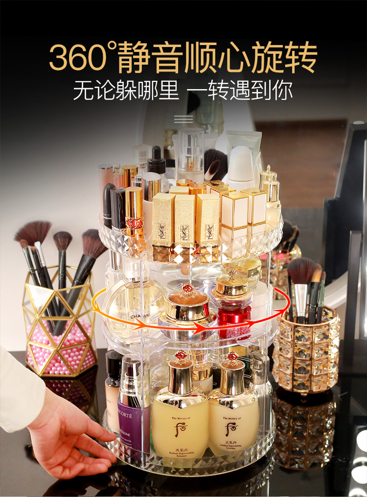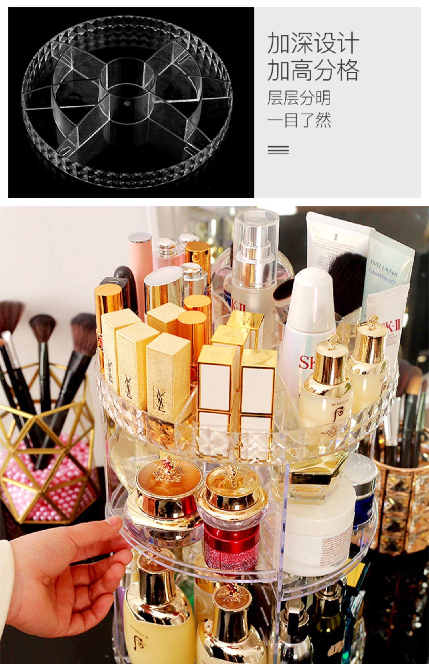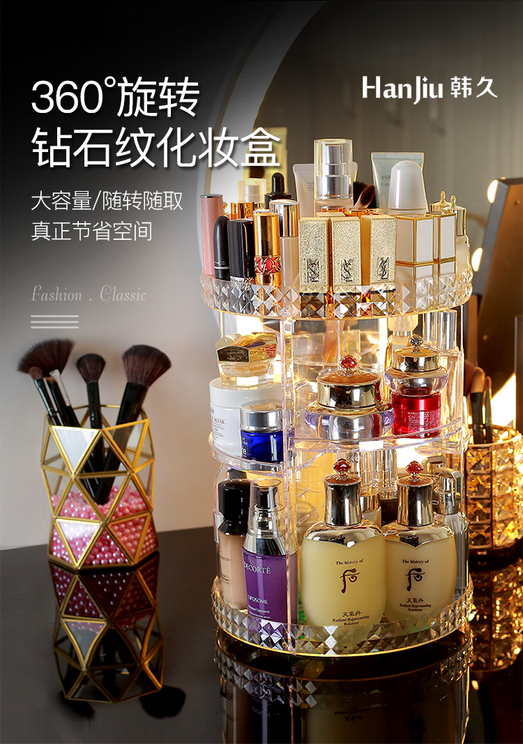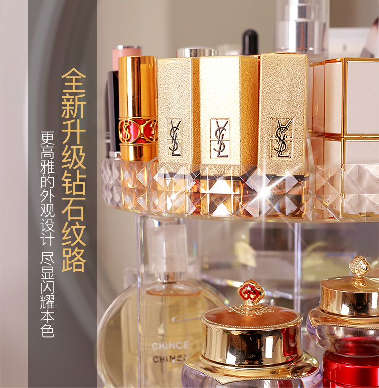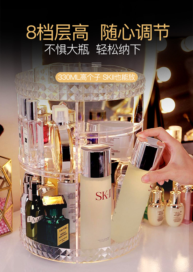 抖音网红爆款,推出360°旋转钻石纹设计,超越99%同类产品!八档层高自由调节,超大容量随转随取。环保加厚亚克力,美观实用,女神必备!